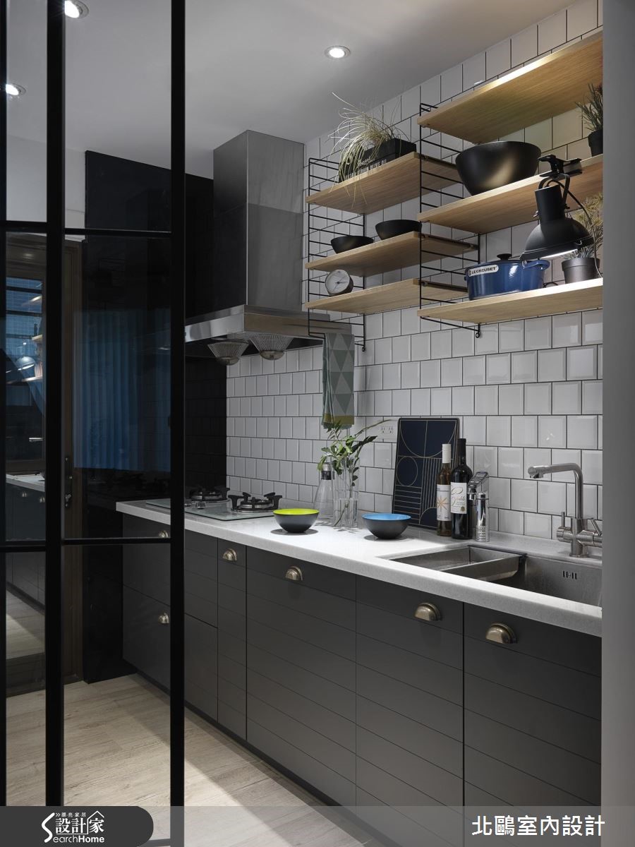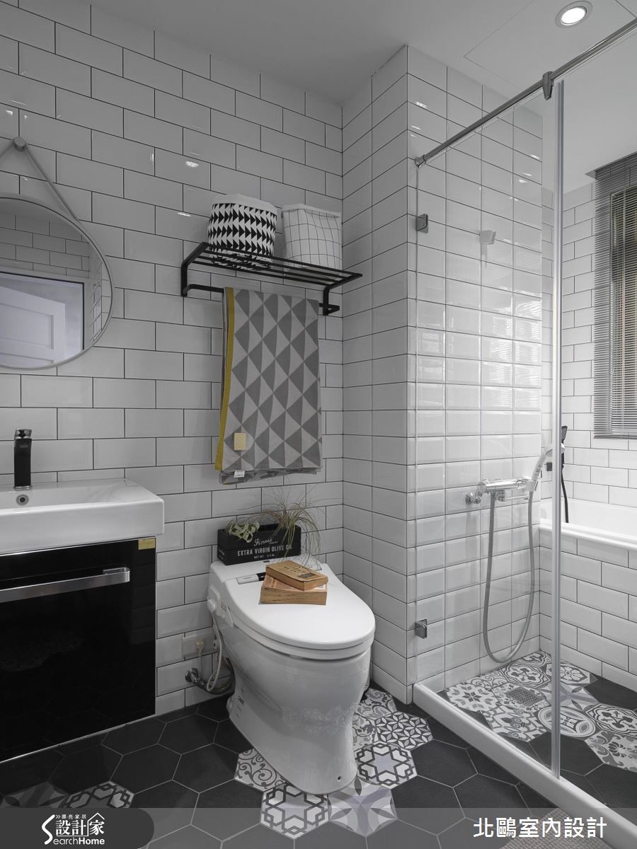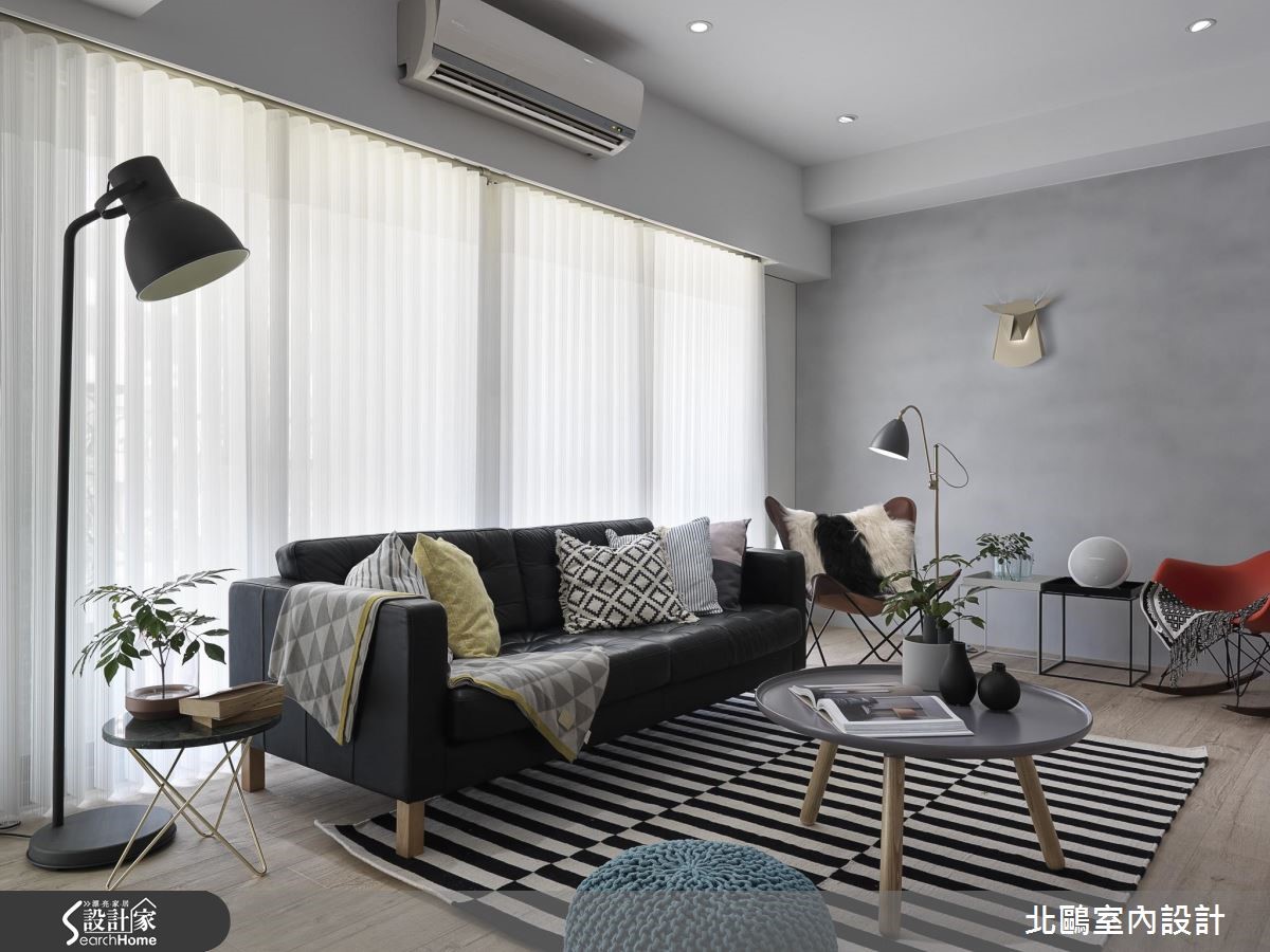 设计师重整新成屋既有格局并适度转向,解决门对门的疑虑。更准确划分开放空间,整理流畅的生活动线;接着在纯白空间注入缤纷单品,为夫妻俩营造地道的北欧风情。【善用玻璃门,开放感好顺眼】玄关墙面与地面铺设蓝白相间的进口花砖,创造清新明亮的气息,利用走道划分开放空间,左侧紧邻着餐厨空间,右侧则为客厅与书房。入门即可看见地道的北欧景象,以多彩单椅点缀黑白空间。餐厨规划跳脱一般格局,以斜角墙面划分独立烹饪空间,并利用铁件玻璃移门维持通透感。另一边的开放式书房与客厅相连,则是大幅提高居住者的互动性,同时也能准确区分空间机能。客厅以鲜黄柜体取代隔断墙,除了降低预算,更能兼顾收纳机能。设计师更紧扣风格主题,以灯饰、平织地毯与缤纷抱枕创造北欧风情,墙面则涂刷灰阶色系,为纯白空间增添个性风采。