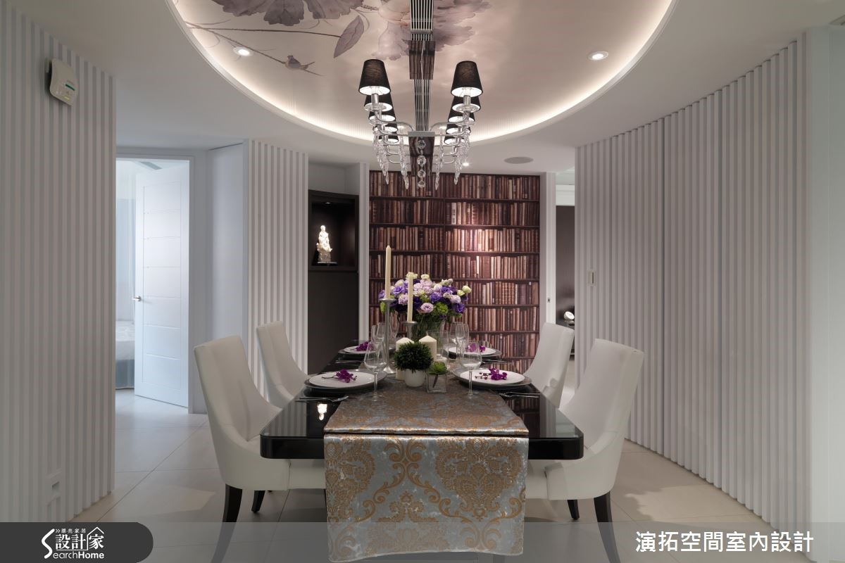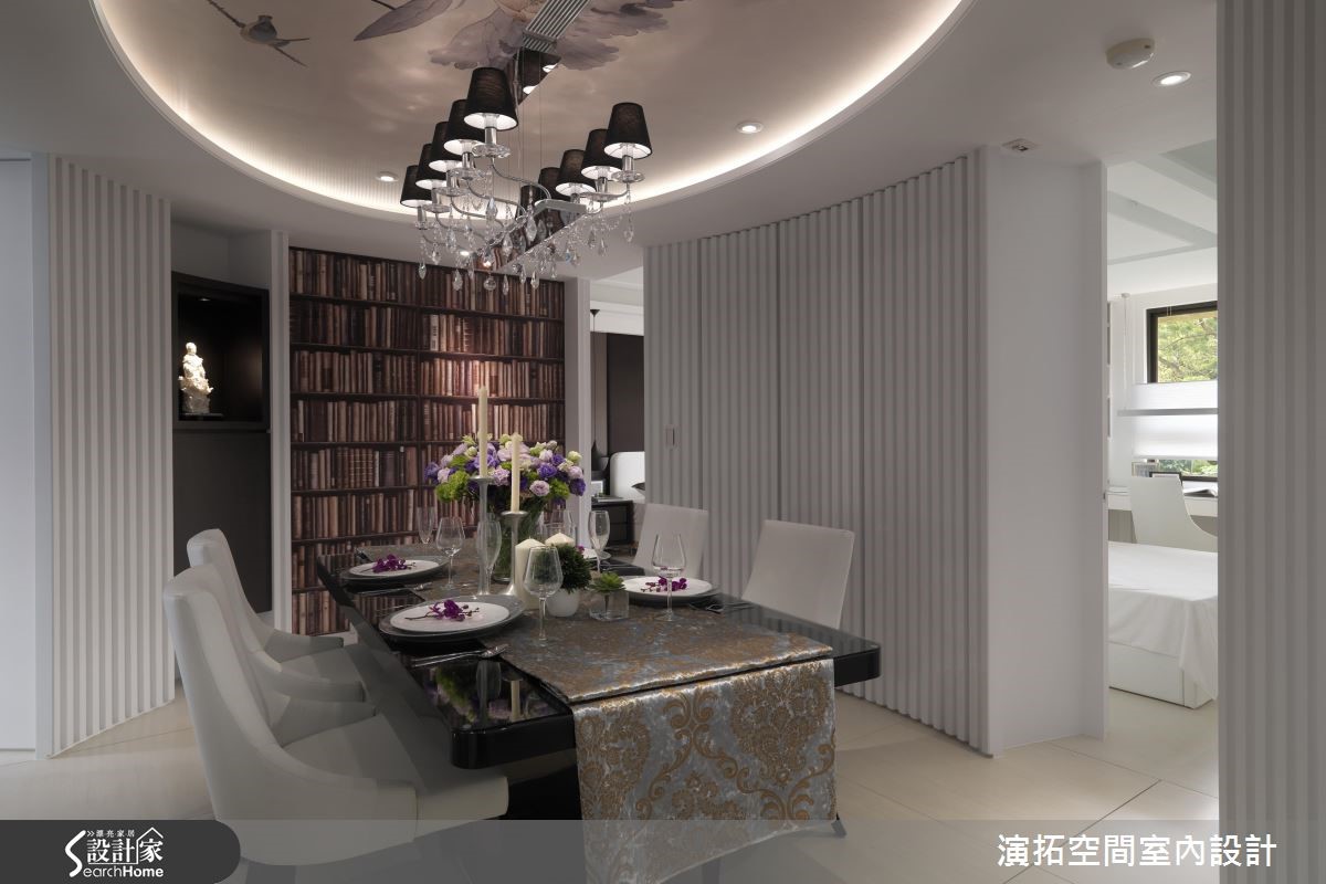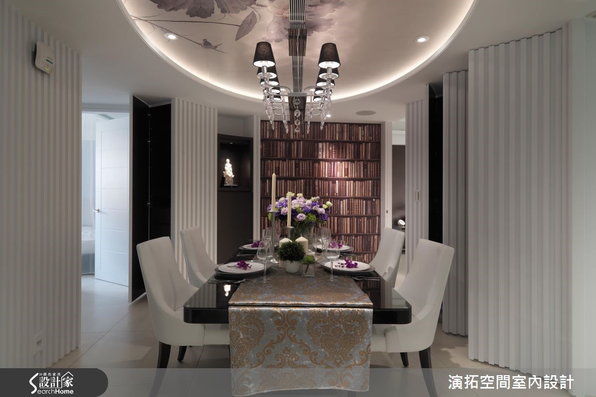 "让走廊不只是一个过道,而是成为一个多功能空间"设计师秉持这个设计思考,化解因过度切割导致走道细长零碎的问题,让两条含有复合机能的廊道为116平方米居家空间带来宽敞通透的流畅生活!【拆除两房,扩增餐厅与廊道功能】大刀阔斧拆掉两间居室拓增机能,改为圆弧形餐厅与主卧、更衣室的连接廊道,除多元机能设计外,更放大零碎空间。客厅电视墙利用银河灰大理石与深色柜体提升高度质感,更巧妙将镜面镶嵌在电视主墙底层与柜体,成功放大视觉深度。【波浪状造型,创造延续性】客厅背墙与圆弧形用餐空间以波浪状美耐板创造空间延续性,餐厅两侧为隐藏式柜体与门片,配合降板造型与彩绘,让居家线条更为优雅柔顺。主卧与次卧利用色调打造截然不同的氛围,分别利用黑、绿的墙面展现大器成熟与优雅气息。