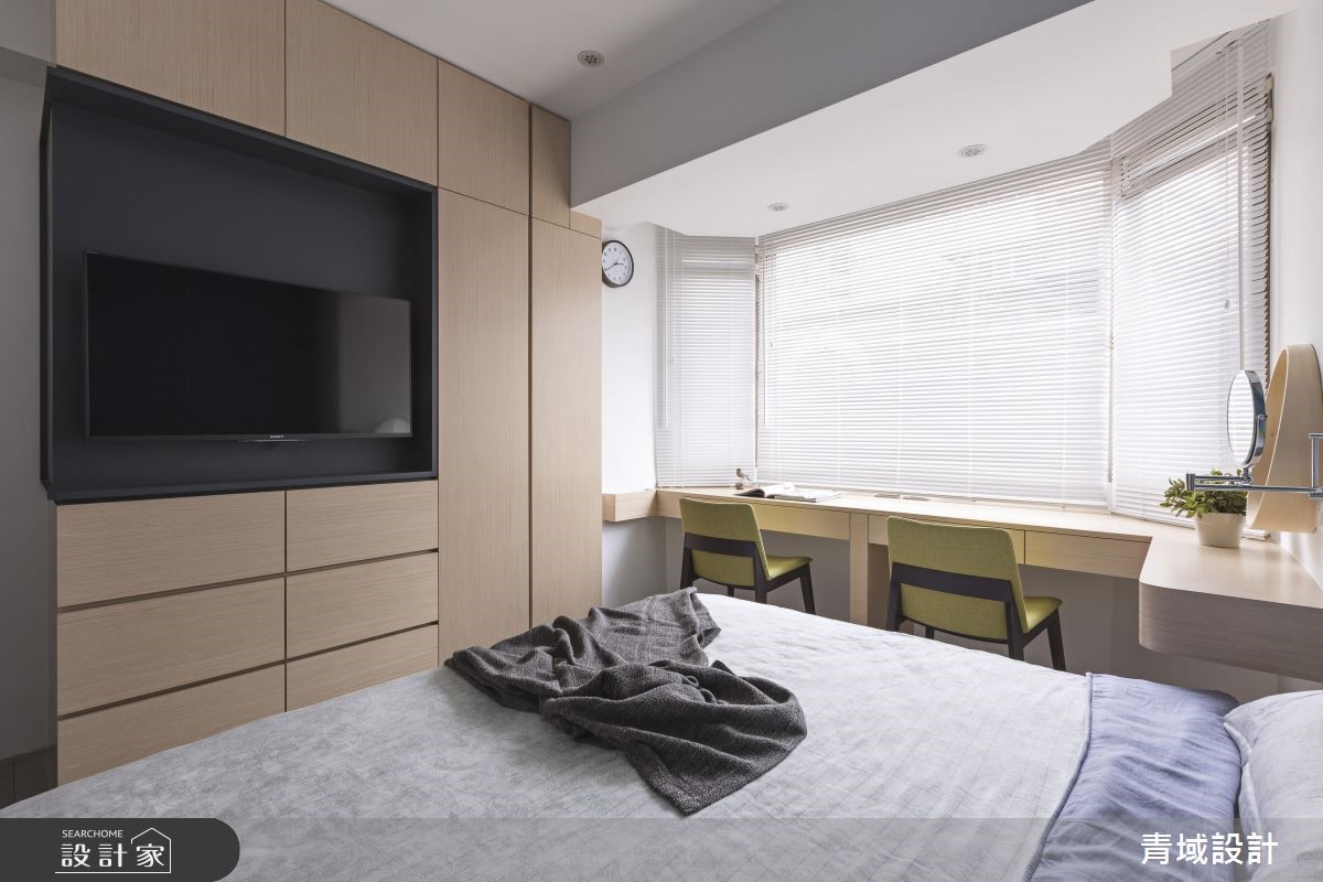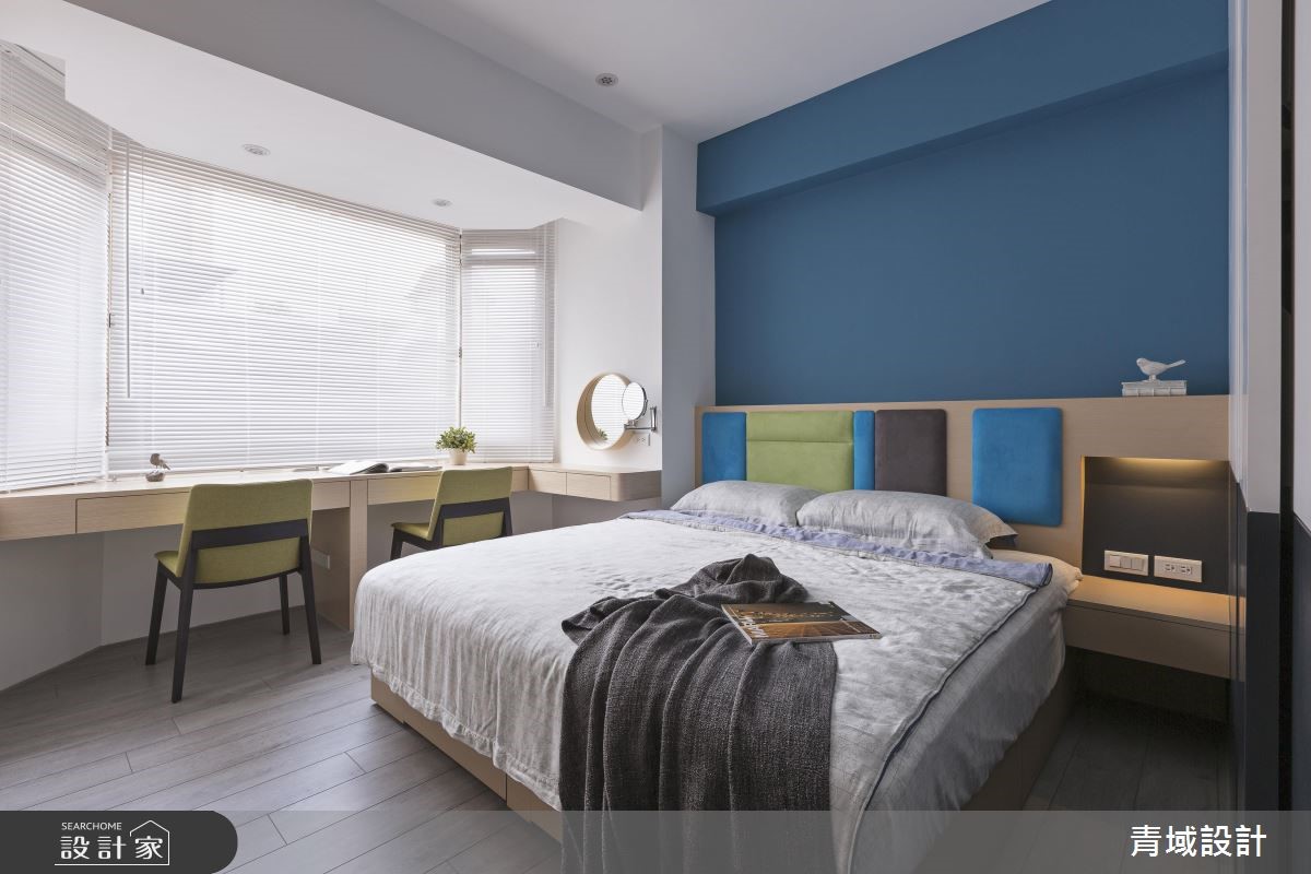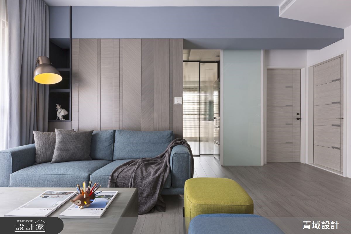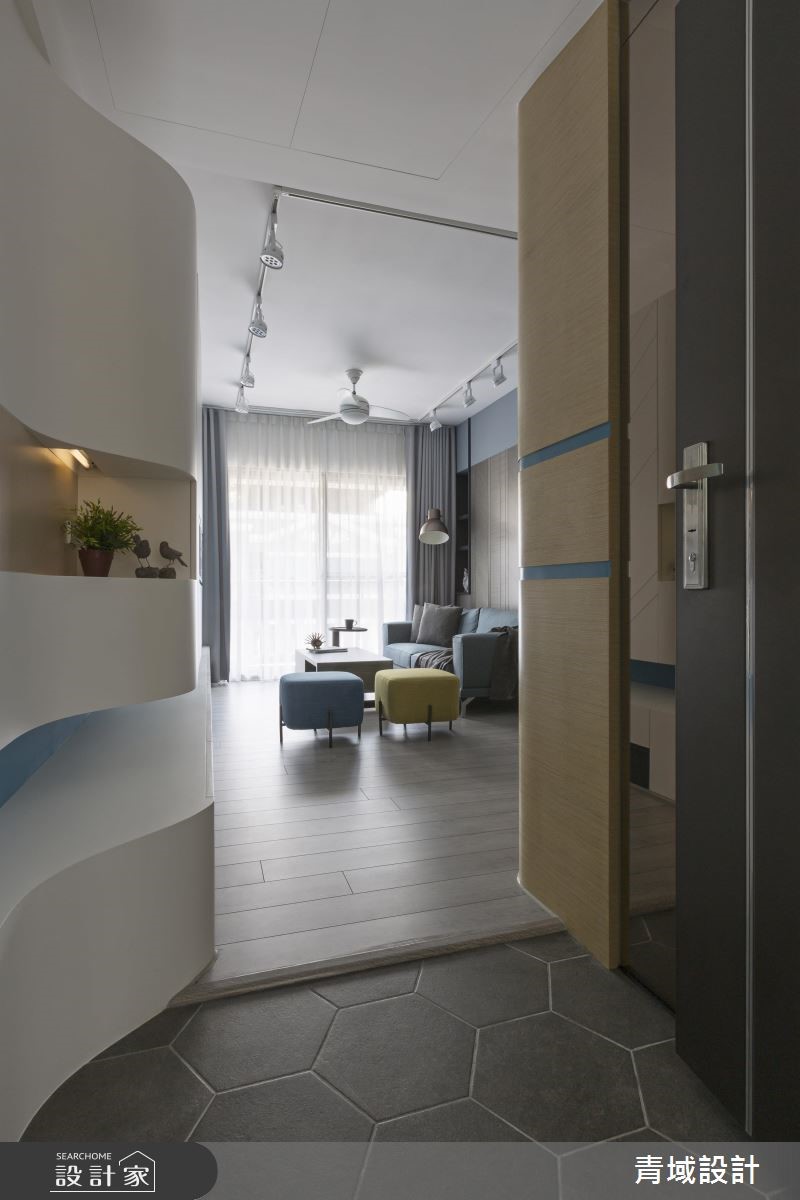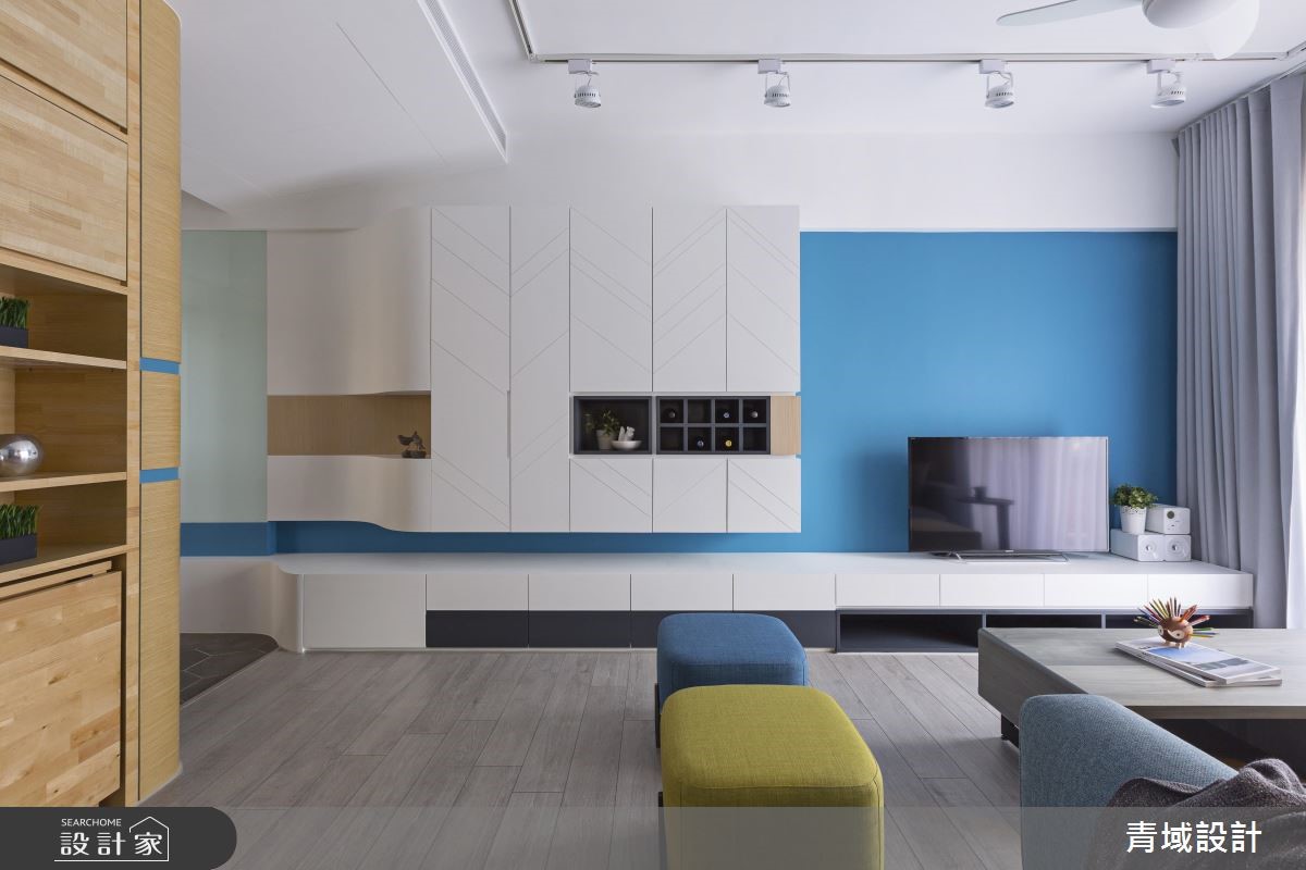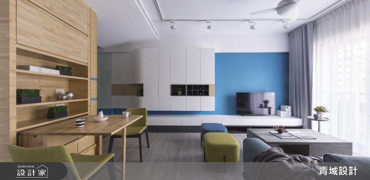 顺着玄关的六角砖缓缓进入,流线型的蓝白色走道轻柔起伏,白色柜体彷佛就是白云一般,就像蓝天白云的相互关系,然后轻轻地,就见一片蓝色天空清爽地映入眼帘。 【现代北欧为主轴,展开设计轮廓】设计师掌握男屋主经常出国的工作特性,女屋主则喜爱爽朗的北欧风格,因此以简洁的现代风格混搭色彩鲜艳的北欧风格,以此开展设计轮廓,从动线、色彩、机能、家具等细腻规划。 【弹性设计,充分利用空间机能】为了让空间不大的小户型,百分百发挥生活机能,客厅的电视墙结合主人的品酒嗜好,安排可随手拿取的酒柜与展示柜。客厅一侧有弹性使用的收纳柜体与折叠餐桌,将餐桌台面巧妙地收整于木柜中,不使用即让出更多生活空间。【以清爽色调,创造简洁美感】居室也于采光良好的靠窗面设置了长形书桌与化妆台,床头墙面则以蓝色系墙面与跳色绷布和公共区域相呼应,充足的收纳墙面柜体也融合了电视位置,在在都想为屋主保持简洁利落的美感。