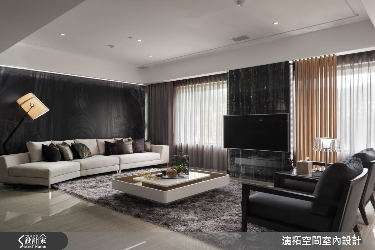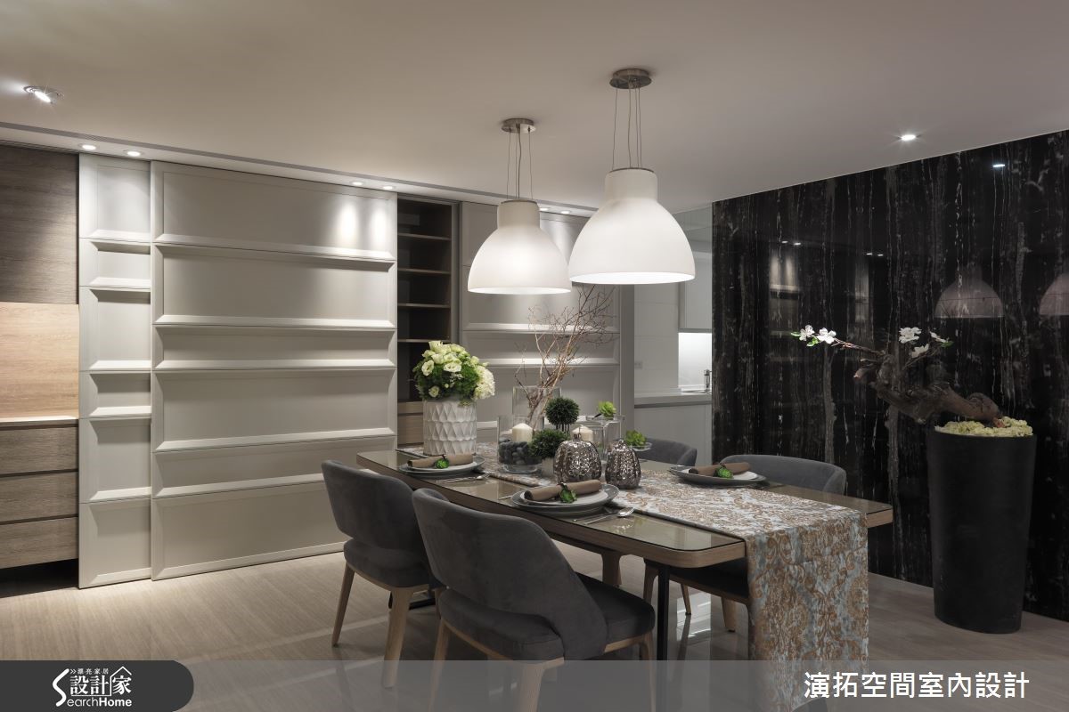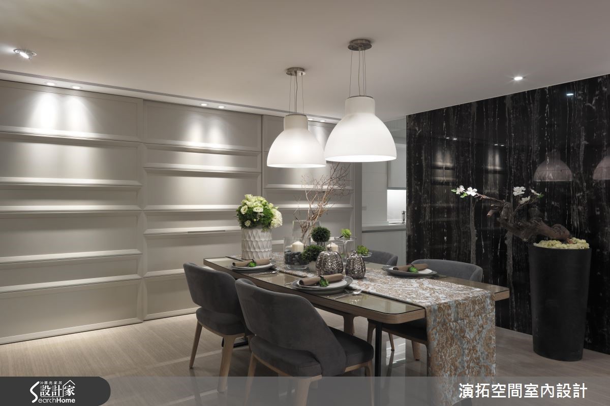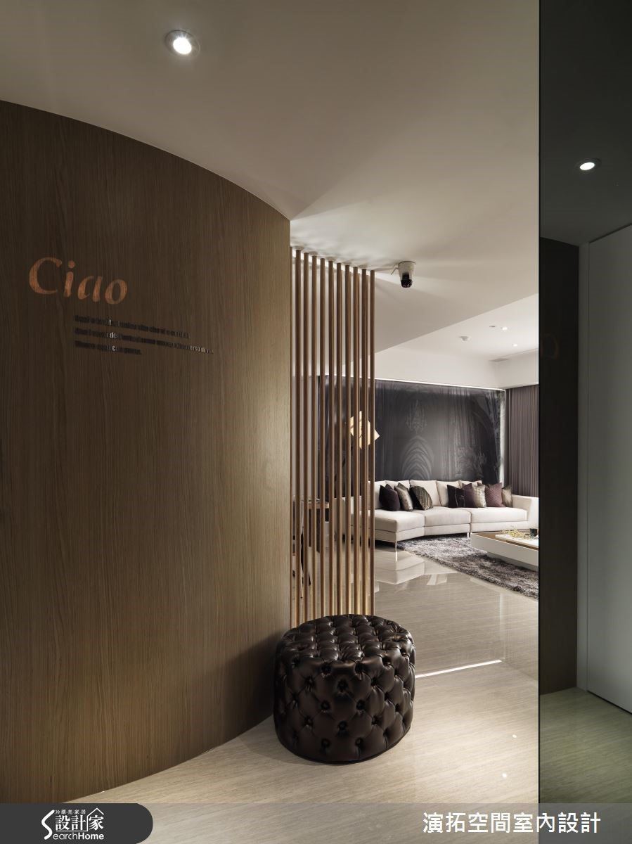为了缩短装修的施工期,此间139平方米的新成屋于预售屋时期即采用客变(客户变更;建设公司在施工阶段依照屋主需求,预先提供变更格局、设备等服务),也能避免耗材的浪费与不环保;而希望能拥有入住酒店般的舒适与享受的屋主,设计师会如何帮他完成愿望呢?【色彩与材质,营造高质量居所】设计师以现代简约且利落的材质,混搭呈现出有如入住星级酒店的生活氛围。进入家门,玄关木质隔屏上浪漫地写上" Ciao "彷佛欢迎回家来度假;公共空间地板如光亮的大理石与深灰系家具、地毯、黑色镜面相映衬出具高质感的空间气息。【黑色大理石,打造优雅公领域】客厅电视墙以大片开窗与黑色大理石作包覆,背墙则覆上欧洲古典建筑的墙纸,呈现优雅美感。餐厅墙面延伸黑色大理石,搭配造型利落大方的餐桌椅与灯饰,展现大器质感,设计师并透过白色推门设计,将收纳柜体与家电器具彻底隐藏。【加高石材地板,划分更衣场域】卧室则多采用木质语汇做铺陈,并于床头后方以石材为地板材质,加高后成为卫浴空间与更衣空间,同时规划出拥有长型镜面的梳妆空间,完整满足屋主入住酒店风居宅的梦想。