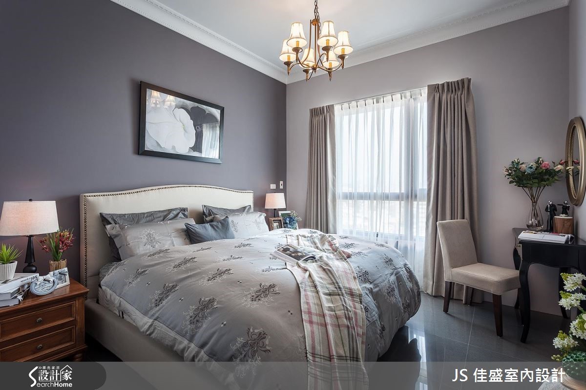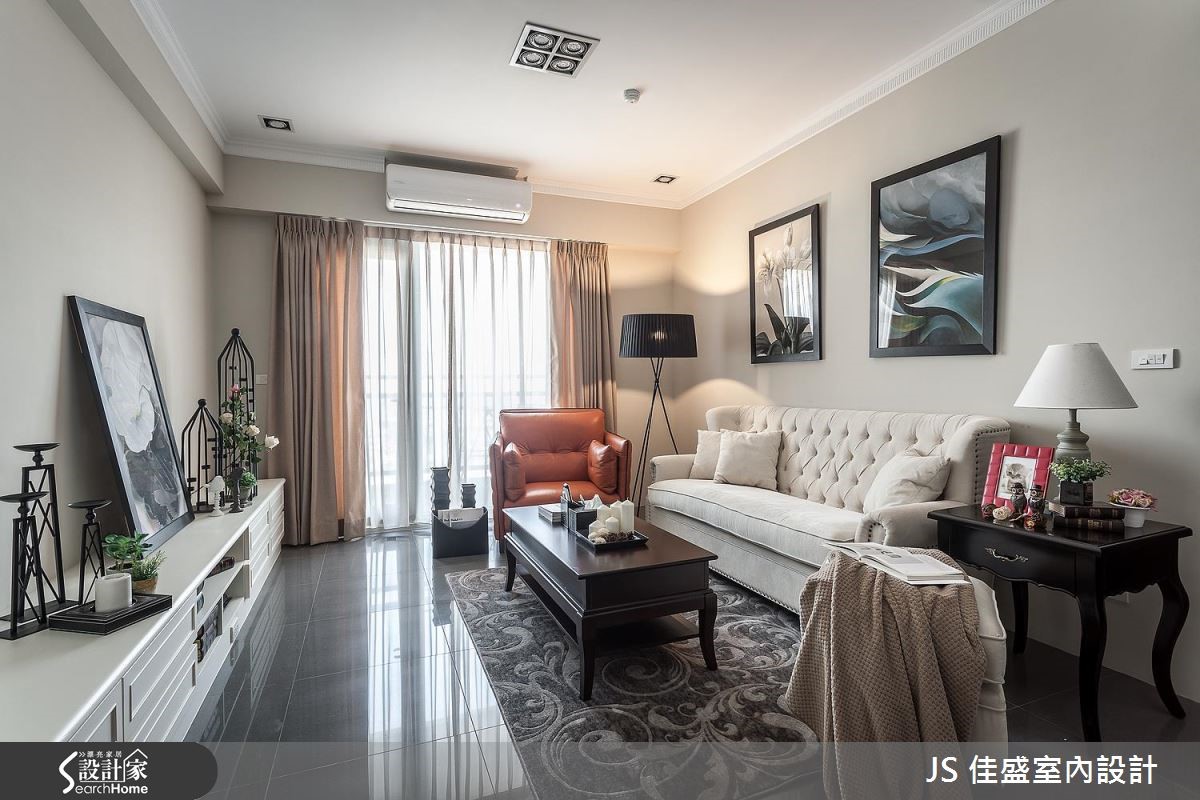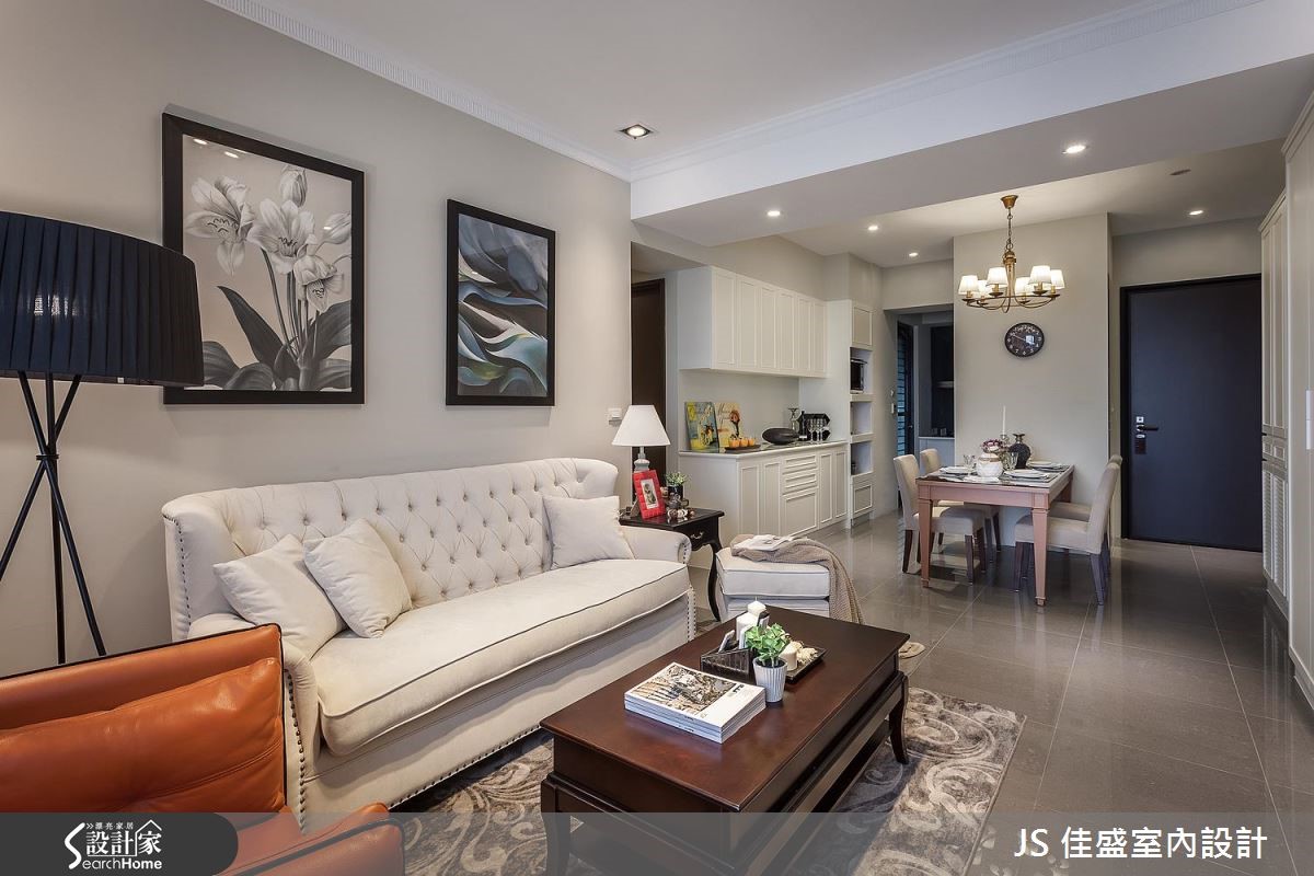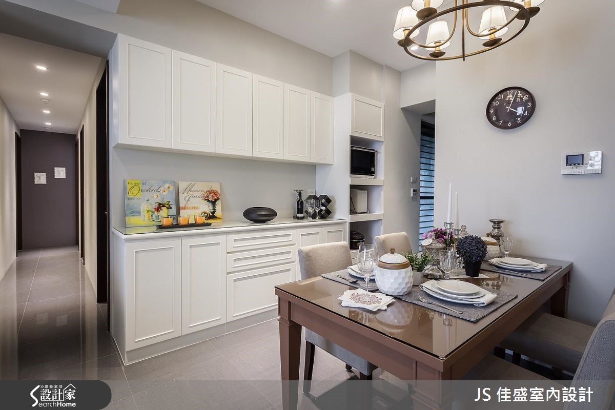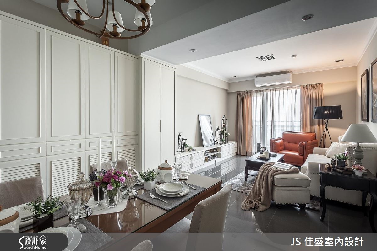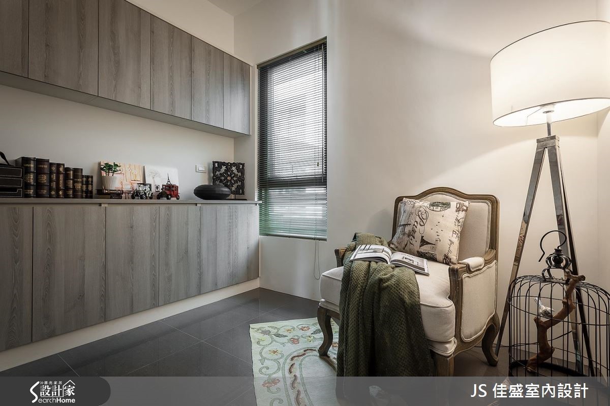除了精準劃分公私領域,讓 26 <span style="color:#0000FF;">平方米</span>空間達到容納 4 房的用度之外,設計師巧用大量香草色木作櫃,在公共空間打造美式質感的優雅風情。設計師將客餐廳與獨立廚房置於同一水平,打造動線流暢的開放式公領域,以香草色系為定調,將由玄關延伸至用餐空間的及頂櫃與餐櫃鋪設簡約線板與木百葉造型,打造美觀與收納機能兼具的端整景象。客廳以家具與軟件提純風格,布織沙發搭配復古皮製單椅與雕花地氈,營造優雅與古典的氣息。主臥以丁香灰為主牆視覺,佐以帶有復古圓鏡的梳妝台與鐵件吊燈,美式典雅風情躍然眼前。小編的最愛特別為屋主規劃出一個臨窗角落,優雅的高背米白單椅搭春綠地氈與落地燈,讓窗邊的獨享時光顯得更有品味。