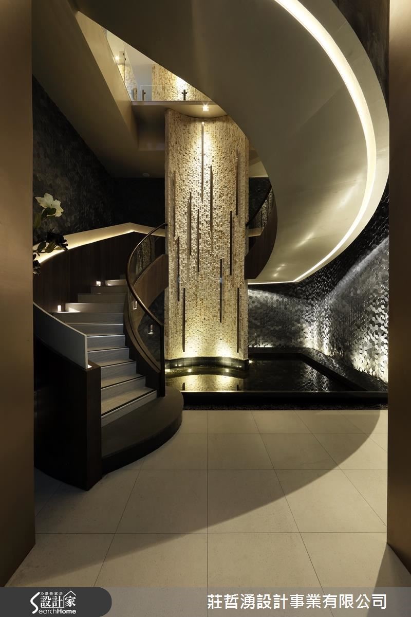 此案为"彭村梅SPA会馆",设计师将五感体验带入设计概念之中,给予静逸、沉淀的空间姿态,藉由石块堆砌、木皮刻痕、斑剥墙纸等材质表现,表达纯粹质朴的精神,快跟着小编一起走进来看看吧。 【丰富光影层次,交织出放松氛围】一楼空间规划挑高的格局,以石材堆砌延伸向上的耸高立面,搭配三盏蔺草编织的定制吊灯,成为醒目的视觉焦点。并透过回旋梯串联楼层,呈现流畅大器的弧线造型,扶手、踏阶处融入灯光点缀。梯间底部的水池设计则在光影漫照之下,赋予沉淀宁静的意象。二楼休憩区经由窗户导引采光,保留宽敞的空间感,配置线帘维系视线的通透,使灯光、烛光、自然光三者相互交融,交织成令人放松的疗愈气氛。除了各SPA室,也规划出贵宾专用室,加入木盒子设计概念,透过大地色展现空间层次,使顾客更为放松。