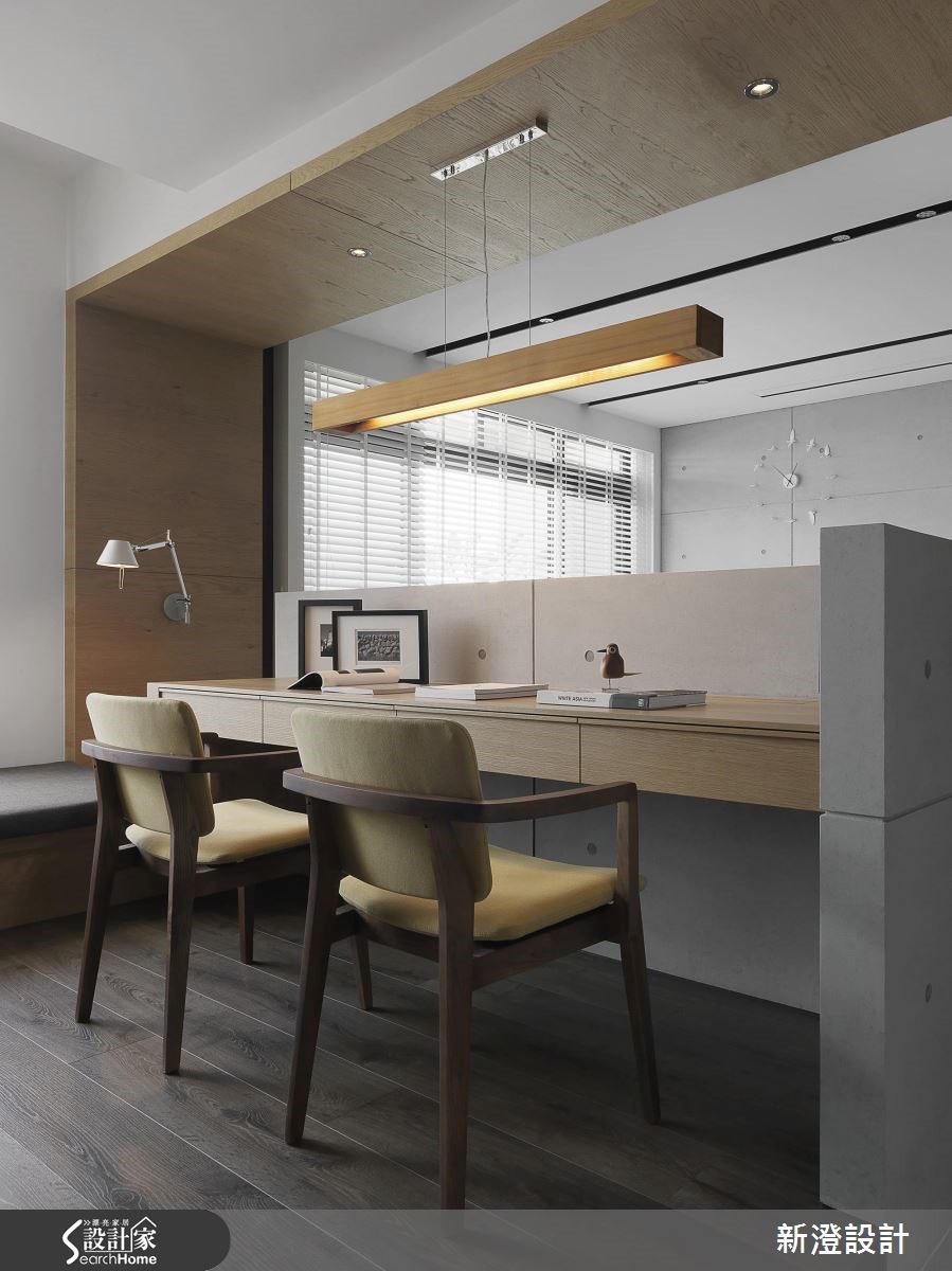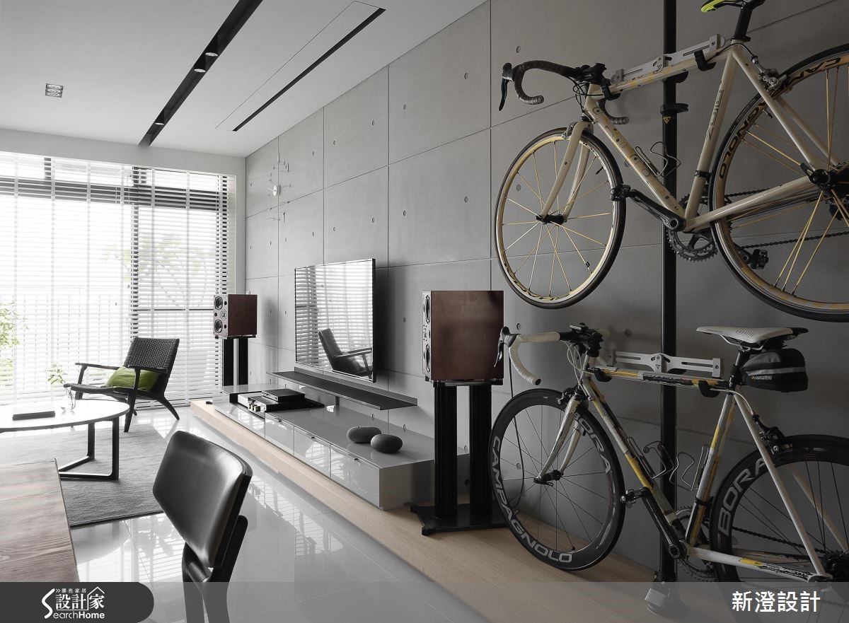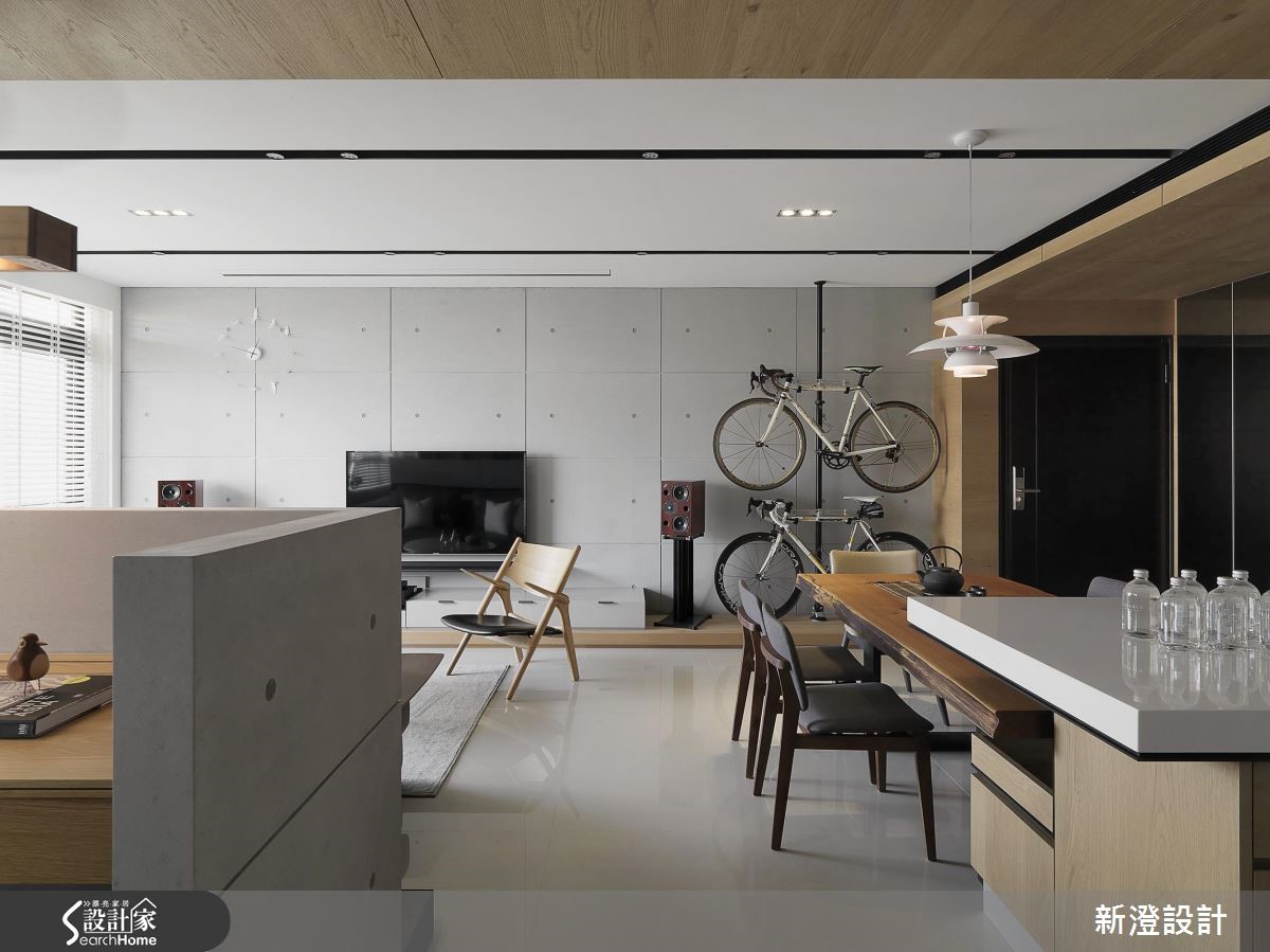 172平方米空间,设计师透过采光、植栽与空间的搭配,挹注疗愈的休闲风格,同时结合屋主的家具与单车,给予创意收纳形式,导入解压且抒放人心的居家视野。【以单车收纳墙,引入生活个性】客厅透过仿清水模材质建构主墙,注入轻简氛围,墙面侧边专门为单车打造收纳区,构成颇具个性的焦点,并藉由木质包覆横梁或家具陈设,传递木作的温润质感,旁边透过百叶窗导入日光,映衬着窗边植栽,添入几许舒心绿意。【半开放书房,兼具隐私与交流】书房置于厅区后方,给予半开放的透空设定,维持与客厅的对话交流,靠墙处规划飘窗与书籍置放区,阅读的可能俯拾即是;来到餐厅区,以木桌结合吧台,搭配木皮铺陈立面,使空间弥漫着现代禅的迷人韵致,并保持与厨房的视线。