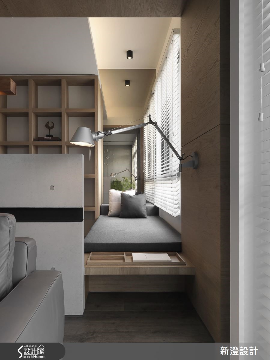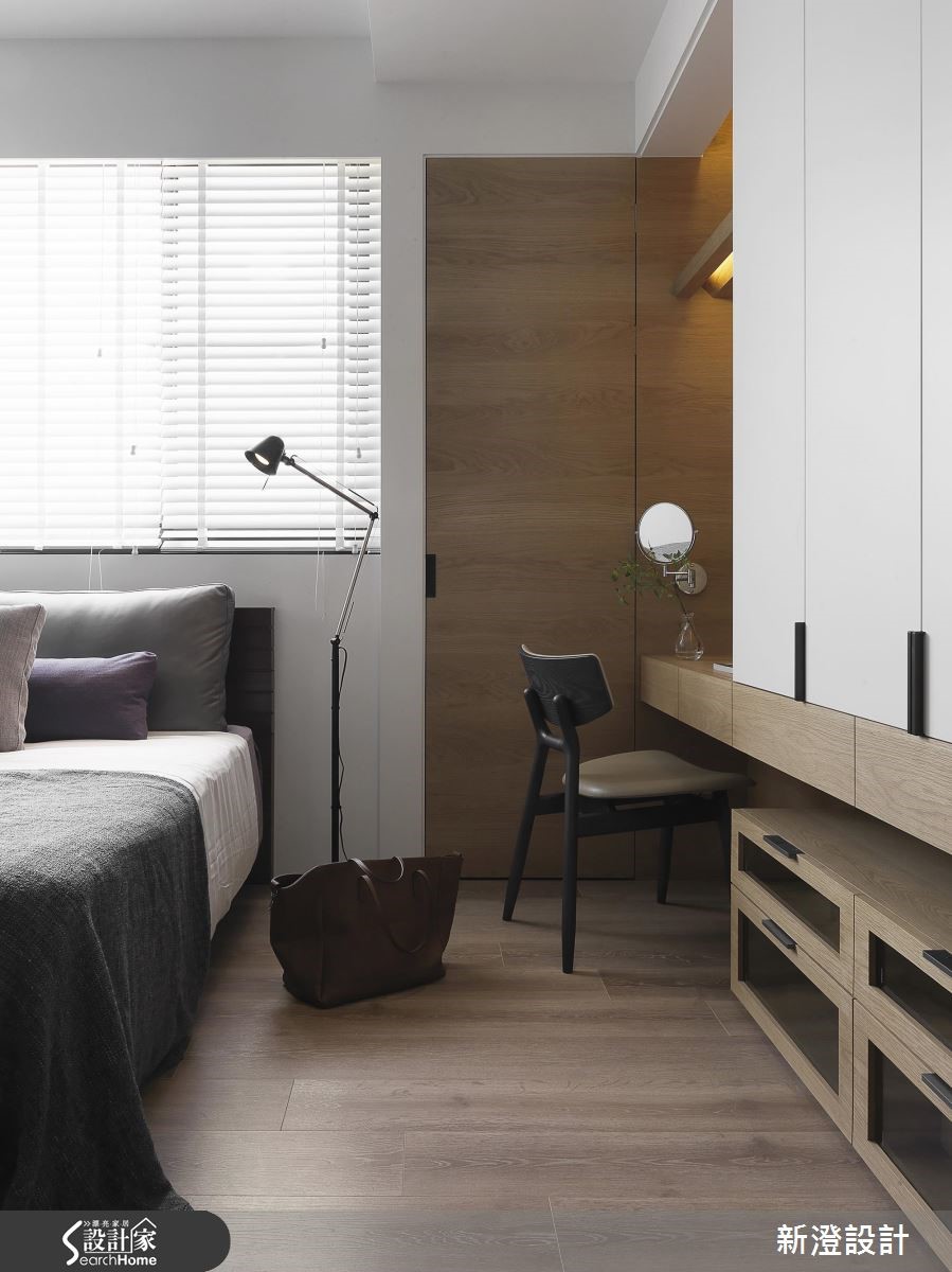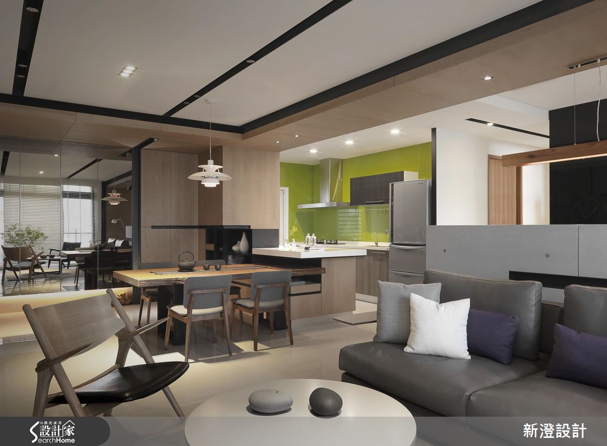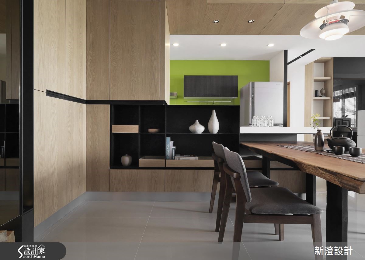 172平方米空间,设计师透过采光、植栽与空间的搭配,挹注疗愈的休闲风格,同时结合屋主的家具与单车,给予创意收纳形式,导入解压且抒放人心的居家视野。【以单车收纳墙,引入生活个性】客厅透过仿清水模材质建构主墙,注入轻简氛围,墙面侧边专门为单车打造收纳区,构成颇具个性的焦点,并藉由木质包覆横梁或家具陈设,传递木作的温润质感,旁边透过百叶窗导入日光,映衬着窗边植栽,添入几许舒心绿意。【半开放书房,兼具隐私与交流】书房置于厅区后方,给予半开放的透空设定,维持与客厅的对话交流,靠墙处规划飘窗与书籍置放区,阅读的可能俯拾即是;来到餐厅区,以木桌结合吧台,搭配木皮铺陈立面,使空间弥漫着现代禅的迷人韵致,并保持与厨房的视线。