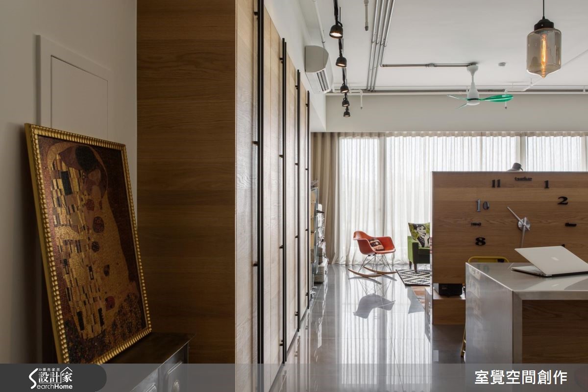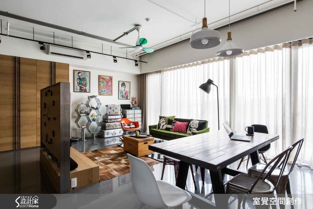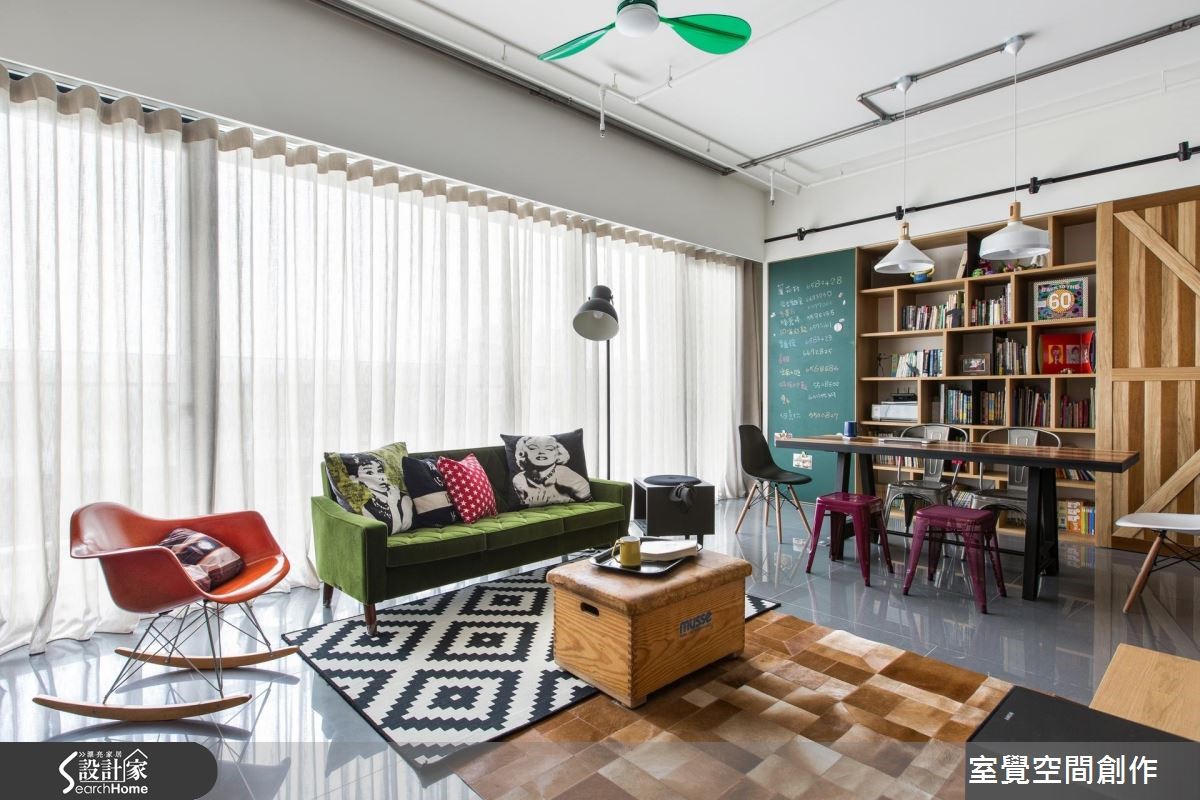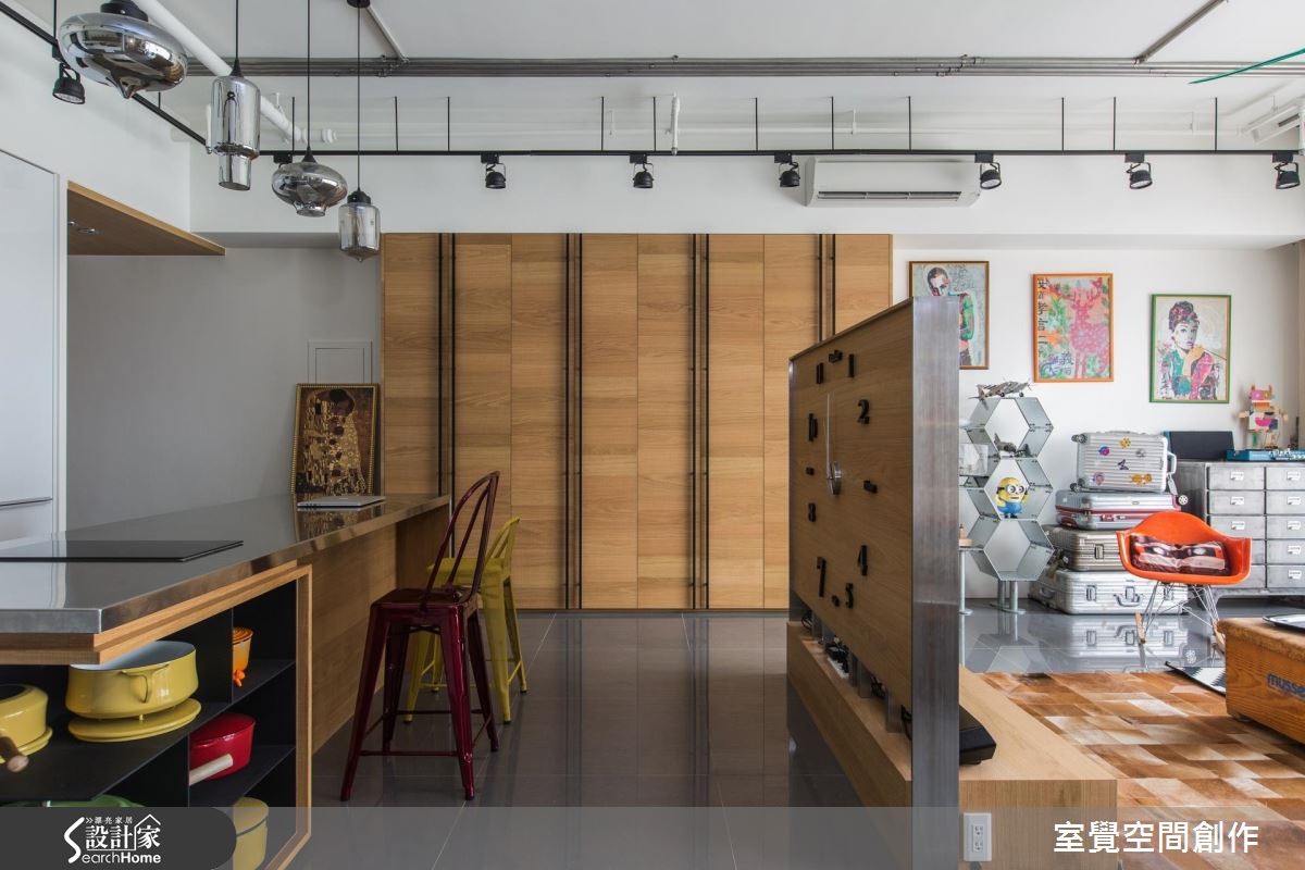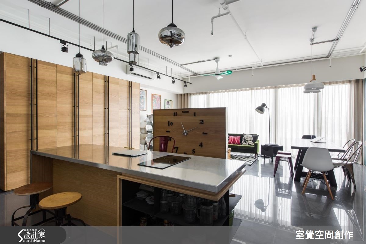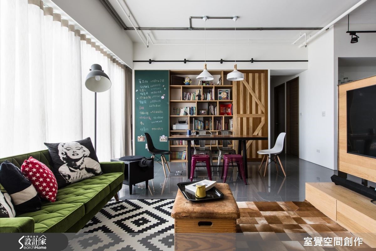 92平方米居宅采横向格局配置并融入流畅动线,让各区之间充满密切互动,且规划了一个大中岛,让此处作为一家人的情感联系之地,搭配整体家饰、家具的出色点缀,演绎出具个性又不失温度的工业氛围。【藉柜体与吧台划界、引动线】从玄关开始,即透过生活感的物品摆饰展现私人风格主张;走进公领域,藉由客厅大面窗导入丰沛采光,结合穿透开放的区域界定,型塑均匀明亮的场景。可双面利用的半高电视墙和中岛吧台,不仅能让空间分野明确区隔,还兼具引导营造动线作用。天花保留了裸露管线,以轨道灯、吊灯的高低错落,创造起伏的活泼线条。客厅透过鲜艳色彩、摆设及造型感十足的北欧复古家具堆砌,显露居住者高雅品味。一旁连结开放式书房,并以木质书墙构筑视觉效果、提升人文气质;不仅满足阅读、工作需求,更是一家人用餐、交流清感的好地方。