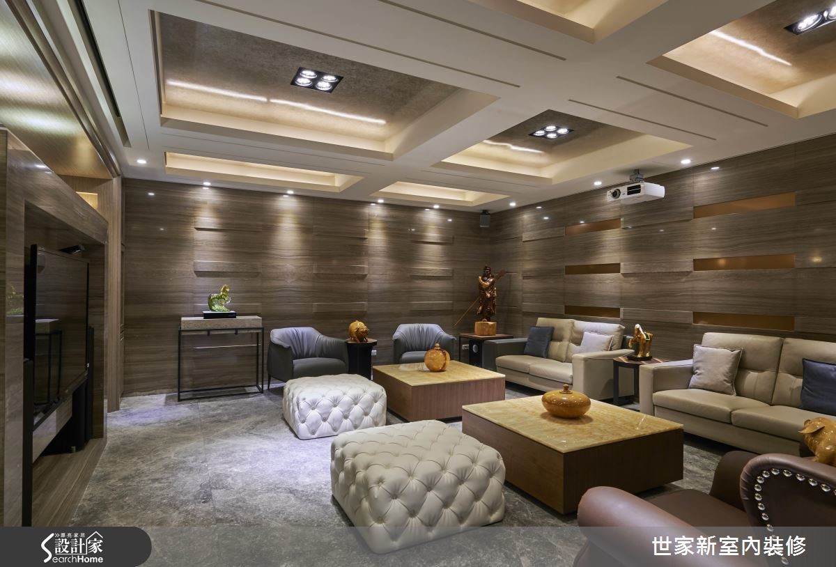 这是一间屋主为了70岁退休的企业家父亲,所打造的友情美术馆。长年经商的父亲因交游广阔,一生纵横商场,而拥有许多珍贵的雕塑纪念品。在父亲退休之际,屋主重新翻修老家,将老爸的回忆以美术馆的方式陈列收纳收藏表现于居家空间。【以石为地,以木作层层迭进】从玄关进入,以中式建筑三进院的木作门框搭配大型的木雕艺术,展现海派好客的气质。在思索大器呈现中式木雕的空间气质时,运用木化石大理石、魔幻黑大理石为基底,简约地板与壁面装饰,运用石材的气势建构豪邸氛围。空间配置上,纵向切分231平方米空间为交谊区与视听区。从玄关进入交谊区后,设计师在挑高墙面上搭配书法字画,墙面旁的泡茶区,配置浓浓中国风的太师椅,营造出悠远的雅士情怀。视听室的部分,设计师以黄水晶台面,摆设屋主的收藏,使用意式利落感的沙发座椅,混搭现代风格,表现主人内敛的涵养。厨房区则使用推拉门区隔烹煮与用餐区,推拉门关闭有隔离油烟之效,敞开即能共享烹煮之乐。
