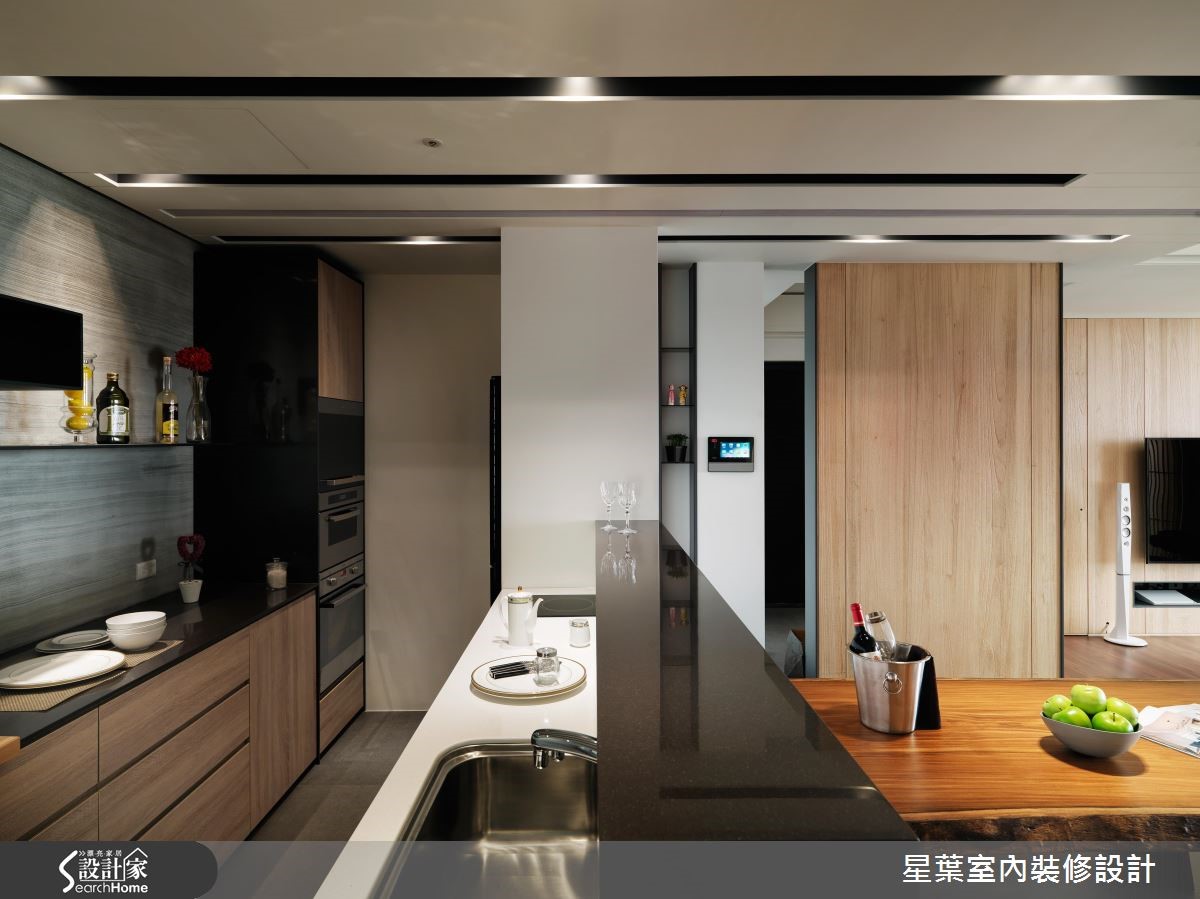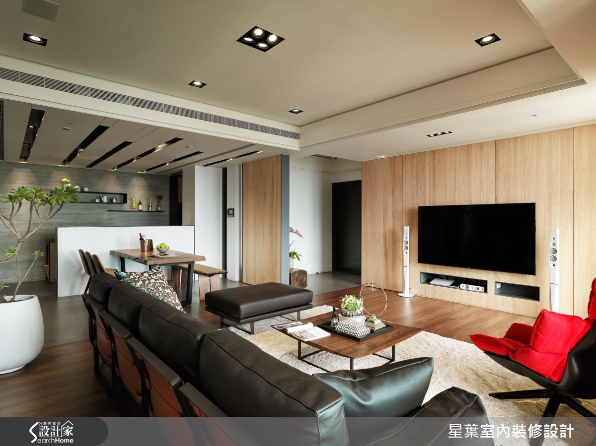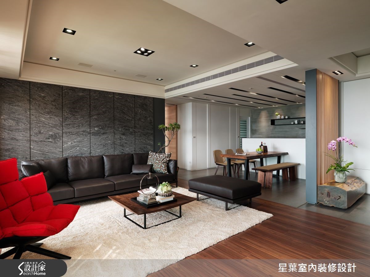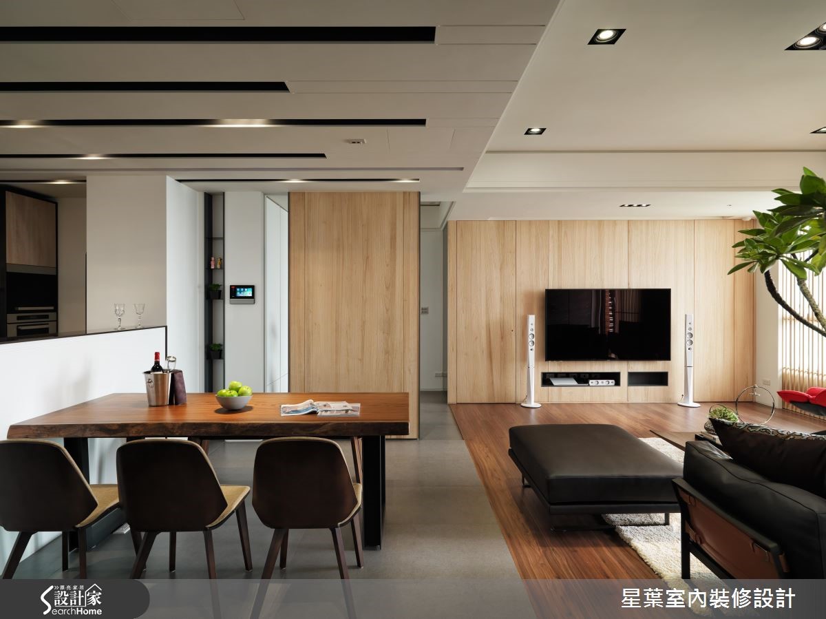 清新自然的木色调、质朴石质,令165平方米居家洋溢清爽舒适的气氛,来到窗畔,取代窗帘设计,透过格栅将光影转化为宁静美好的居家画面,让人一回家就能感到疗愈放松。【石质墙与木质家具,大方画面】舍弃过多的隔墙,公领域采用开放式设计,透过地平材质的差异性划分餐厨与客厅场域,客厅背墙运用浓郁浑厚的石质脉理作为端景,搭配清新的木质调与简约的家具摆设,让画面既大方稳重也不失休闲舒适氛围。【轻食区,享受风景与家人互动】餐厨区将轻食与热炒厨房透过隔门区分,阻挡烹饪时所产生的油烟,并让轻食料理区面向客厅窗景,做菜时不仅可以享有舒心自在的视觉风景,也能参与家人间的生活互动。