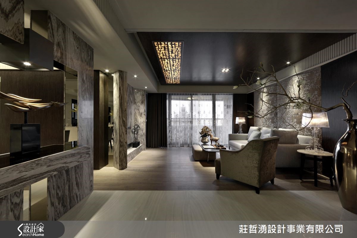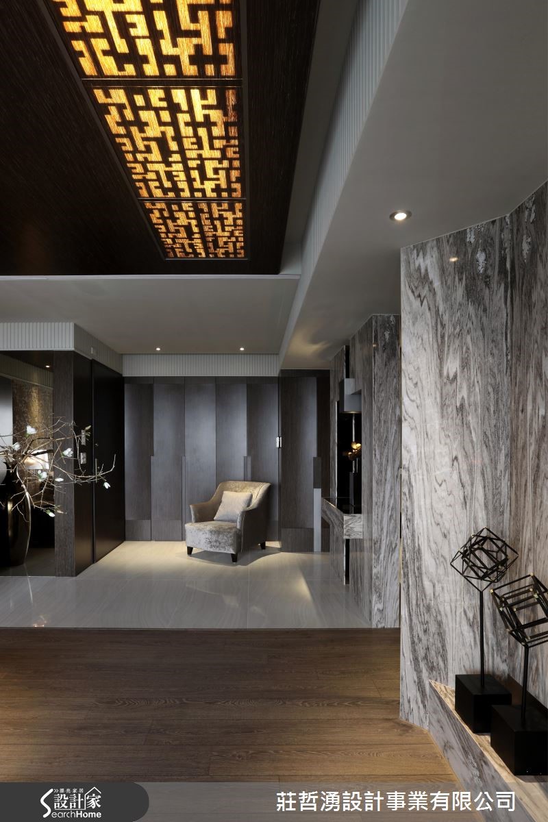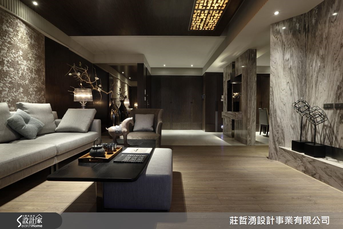 215平方米的开阔居宅中,以东方风格为主轴运用鲜明纹理的大理石,营造山水泼墨般的背景,同时纳入木制窗棂和花卉墙纸;新颖的现代家具,则传递崭新的风味。快跟着小编一起走进来看看吧。 【传统中式饰品,传递东方气韵】空间中以白色引申为"动",木质隐含"静",拼凑出动静相融的平衡比例,并让天花的对比色差呼应地坪材质。立面则经由山水大理石、深色木皮、花卉壁纸等素材,将中式元素加以转化,透过切割、转折等手法,丰富视觉层次,营造仿若山水画作的空间。 餐厨揉入了意大利白磁砖,呈现现代感利落格调;木地板则铺陈于起居空间,藉以表现温润之美,透过材质的多维使用,符合空间不同机能、方便维护。同时,在天花安排扁平出风口,巧妙解决了公共区的空调需求。