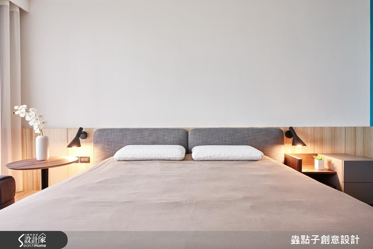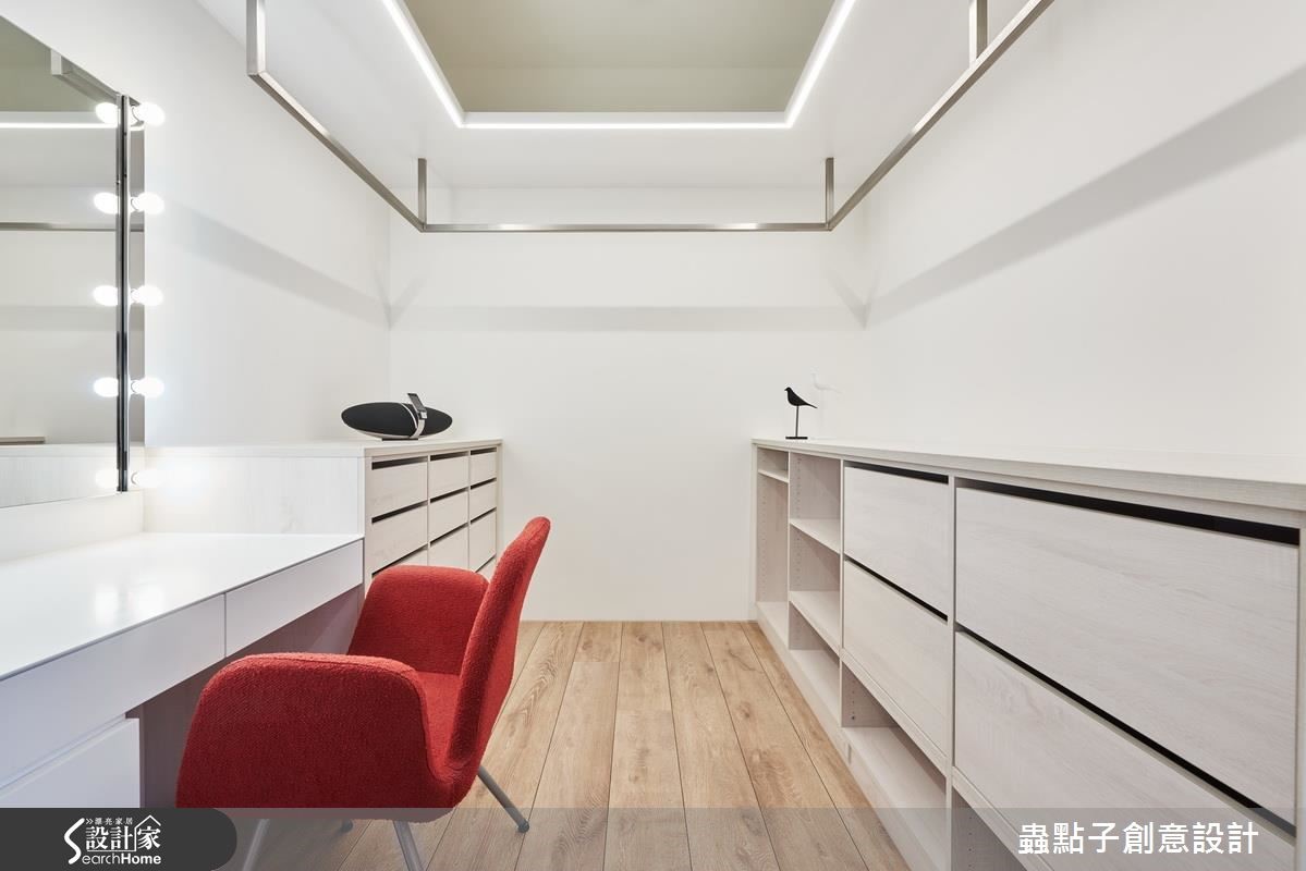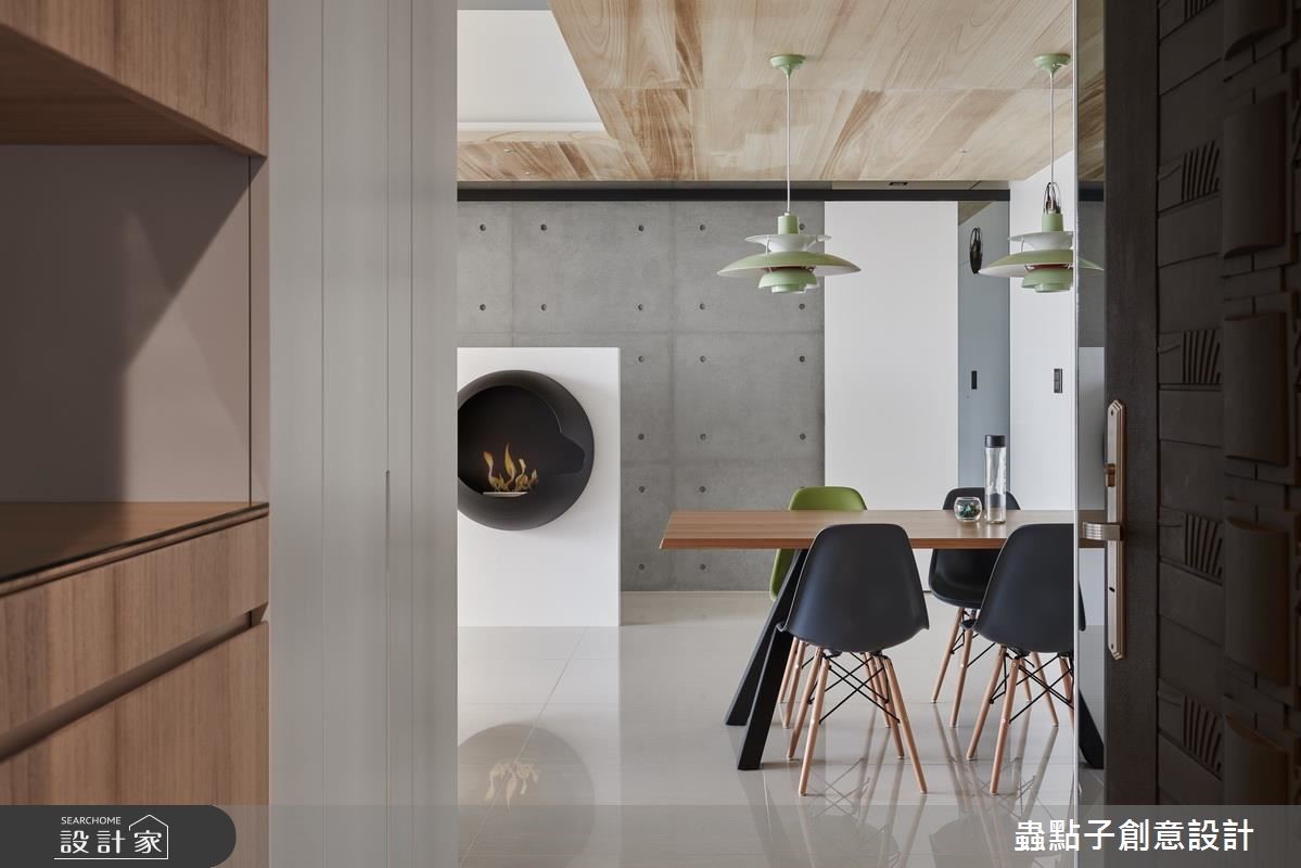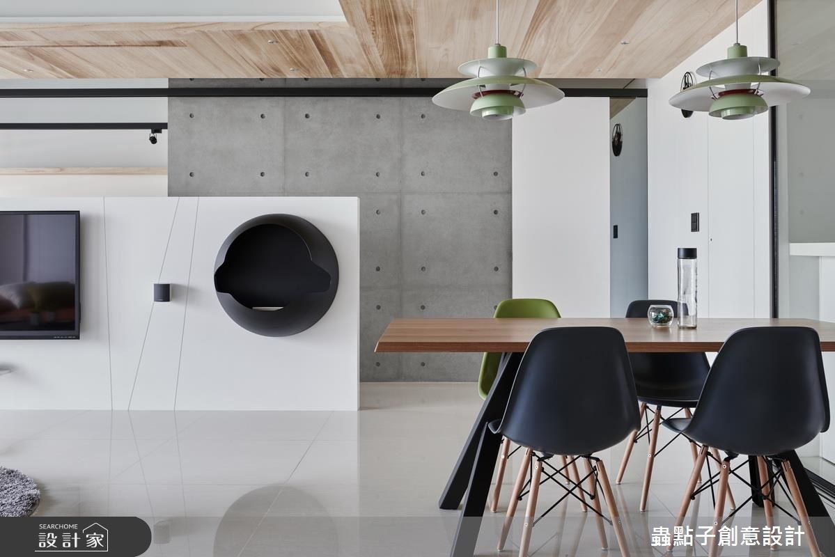 医生屋主在离开高压工作环境后,需要一个可以极度放松的居家空间,因此设计师以"城市缩影"为灵感,为116平方米空间注入温润、冷静的简约造型,让人从繁杂的思绪抽离,回归简约本质。 【温润色调与材质,打造纾压居家】设计师善用大面落地窗与挑高优势,援引大量光线进入室内,并利用木皮包覆巨大梁柱,创造温润视觉。以都市印象为范本,利用清水模诠释水泥丛林意象,又以回字动线设计的半高电视墙隐喻城市中的建筑量体,并作为书房与客厅的中景分界。一旁以透明门片区隔紧邻厨房的餐厅空间,不仅有效抑制油烟逸散,同时维持开放明亮的视野。而卧房以简约、温柔为调性,以单纯木色带出生活原味,纯白色的更衣间则利用不锈钢铁架营造前卫气息。