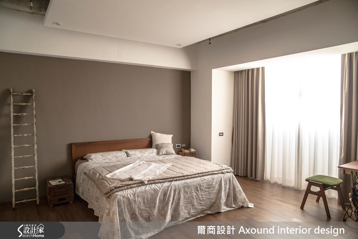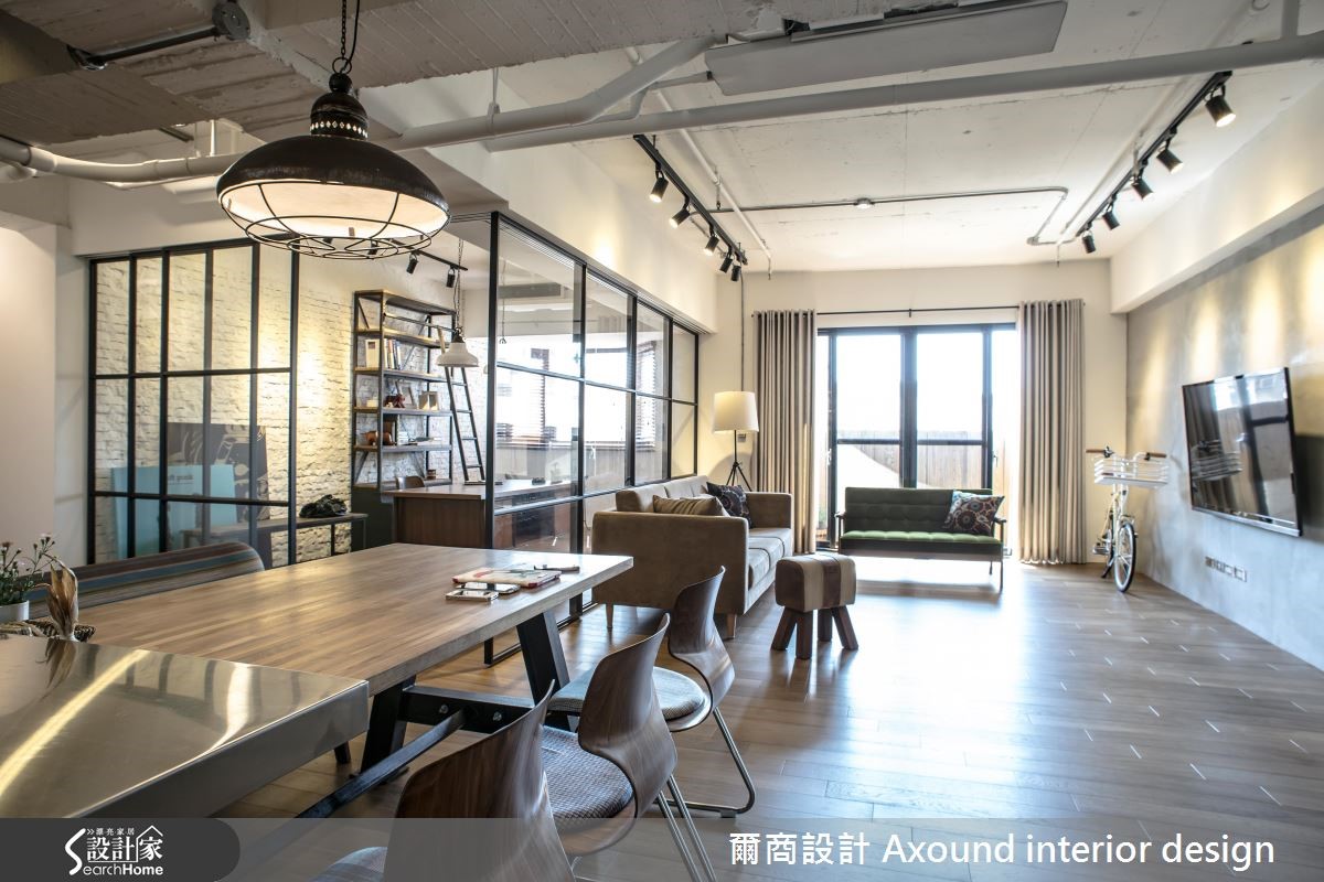 复古而宁静的116平方米空间是新婚夫妻的生活起点,设计师让住宅跳脱平凡,大胆融入Loft工业风格,同时给予宽敞明亮的气场,平衡过于高冷的质感,使夫妻两人可坐拥如咖啡馆般的放松氛围。 【清透弹性隔断,造宽阔空间感】设计师破除老屋格局,赋予开放式规划,使客厅、餐厨通透连贯,利于光线空气流通。并藉由主墙大面积的仿清水模铺陈,搭佐白色单车与灰色布沙发,构筑清爽宁静的空间主调,再点缀一张绿色沙发椅,达到提升彩度的聚焦效果。后方则以黑框、清玻围塑书房范围,门片可依心情作调整,塑造开放或闭合的弹性场域关系,并在书房规划整面具手感的粗糙石墙,搭配怀旧感木桌与家具,体现纯粹原始的味道。餐厨洋溢着咖啡店般的惬意,以木桌结合吧台,网罗聊天、阅读、用餐等多种机能。且融入黑色釉面砖、不锈钢等建材,搭衬裸露的天花梁柱,兼具休闲况味与不羁个性;卧室则注入宁静色彩和柔和日光,打造舒眠的空间。