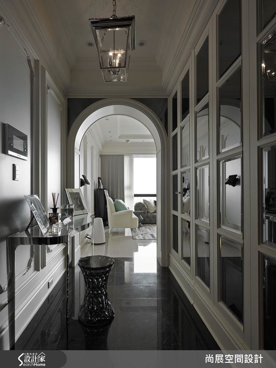 从玄关开始,即在墙面铺陈灰镜,营造廊道的深邃放大感,并陈设Kartell矮凳与金属玄关桌,昭告入门后的优雅印象。同时加入圆拱设计,将装饰风格发挥得淋漓尽致。