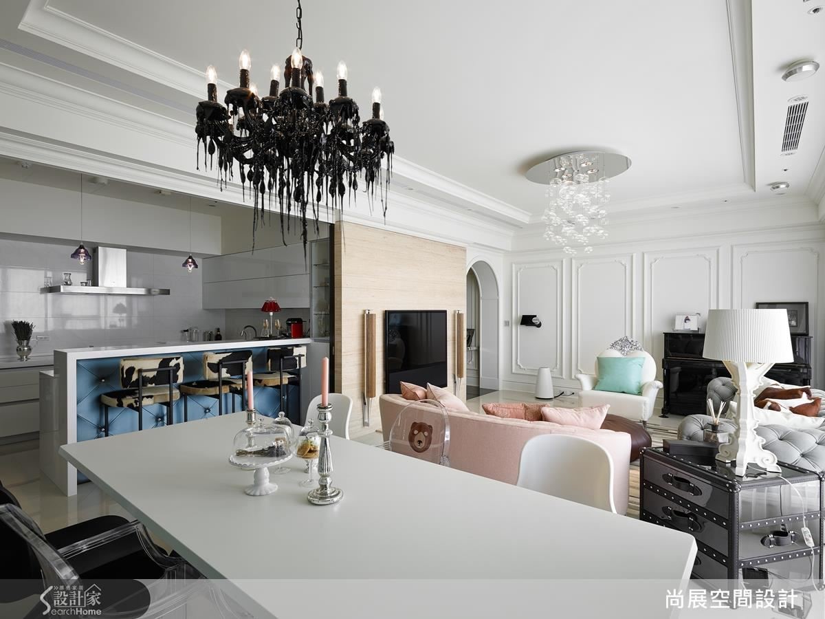客厅空间点缀线板雕饰,同时藉由开放设计,呈现开阔大器的氛围。搭配意大利Baxter灰色沙发、马毛地毯,绒布质感与拉扣设计,勾勒古典奢华与甜美兼具的视觉效果。