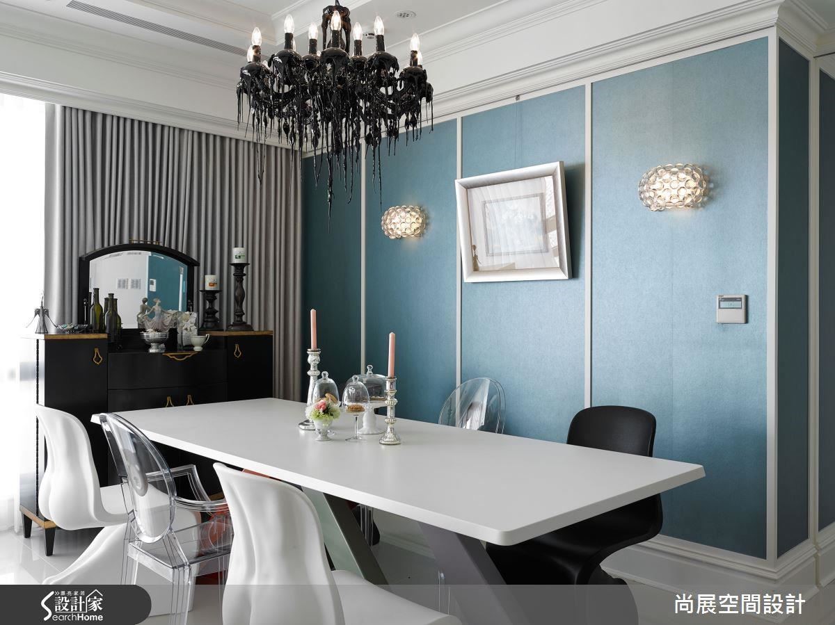 在有着迷人蓝色调的餐厅中,搭配意大利Casamania餐椅的趣味造型,彰显对家具的鉴赏力,尤其餐桌上方的黑色蜡烛吊灯有着奔放的华丽感,而在湛蓝的线板墙面装饰黄铜镂空壁灯,点缀奢华质感。