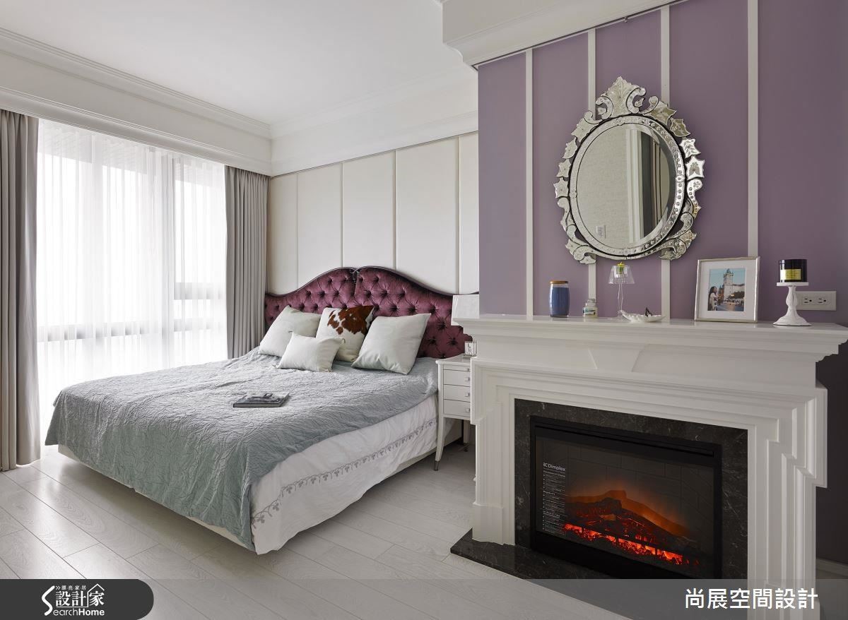 主卧入口规划造型壁炉,并铺陈淡紫色展现女性特有的柔和韵味,挂上欧风古典挂镜,优雅的图腾强化优雅质感。同时搭配古典拉扣的床具,深紫配色与墙面相呼应。