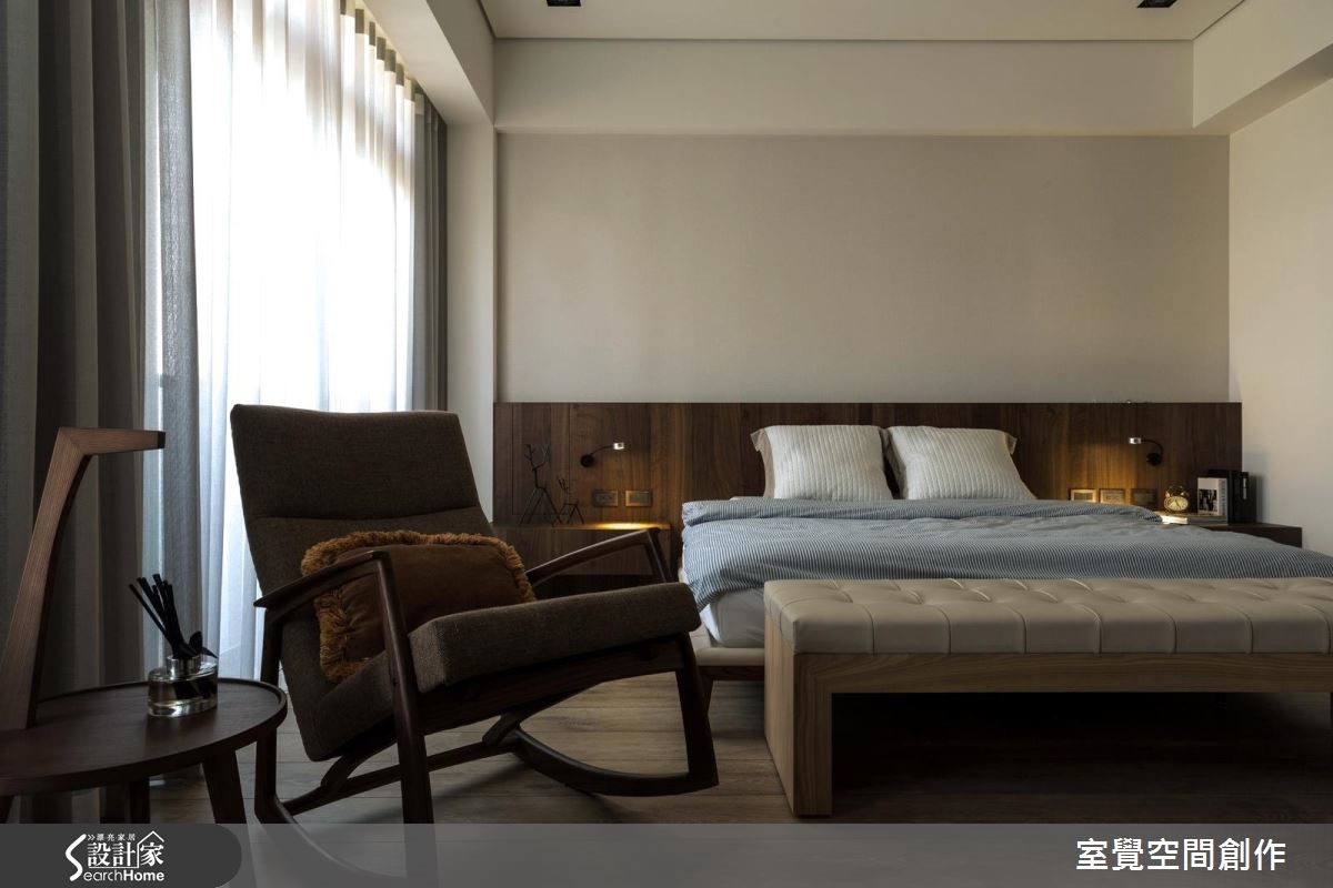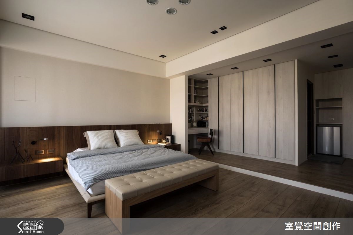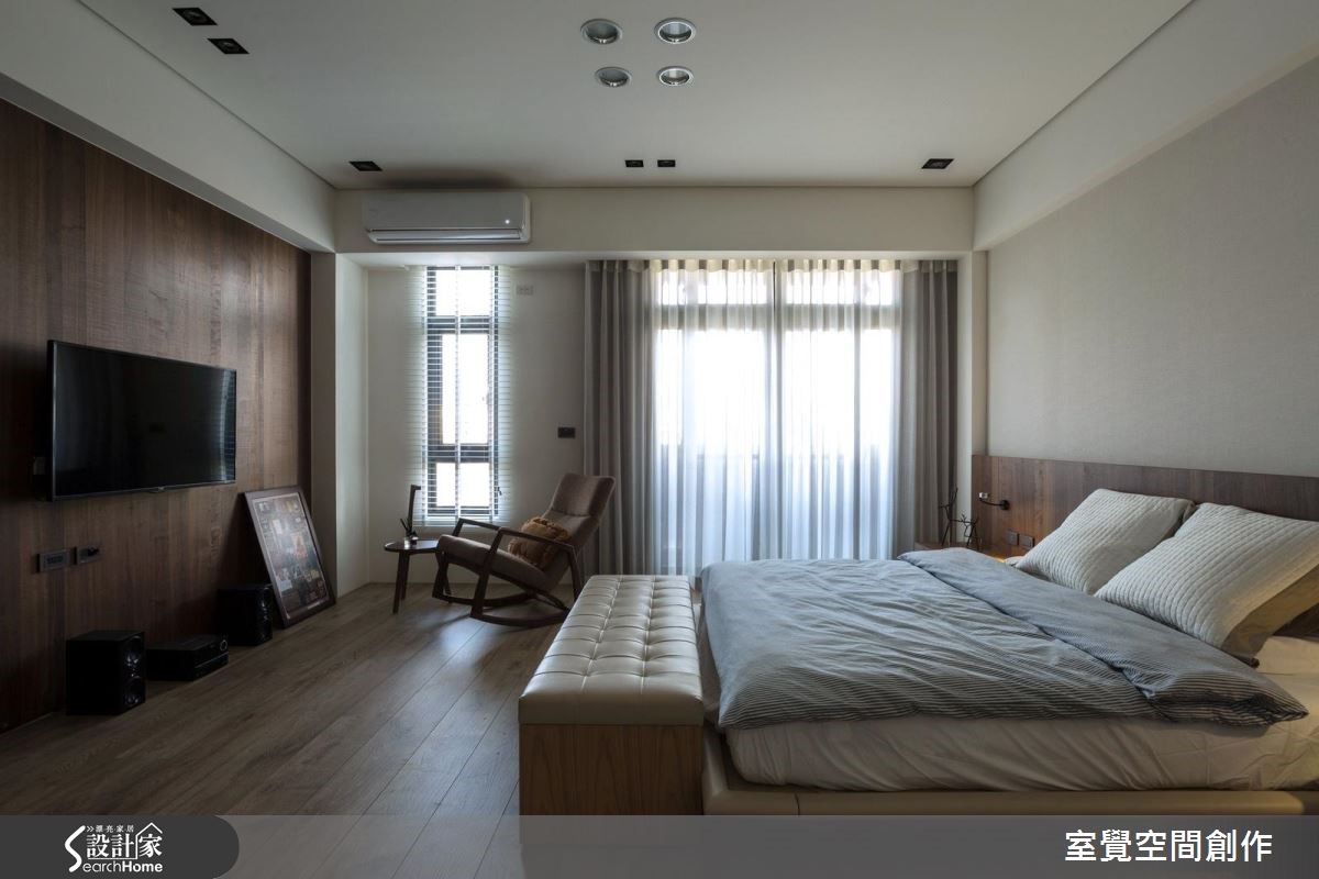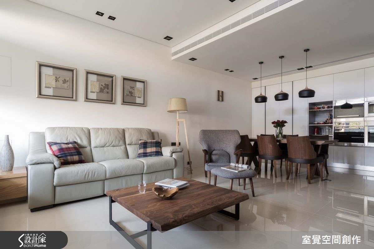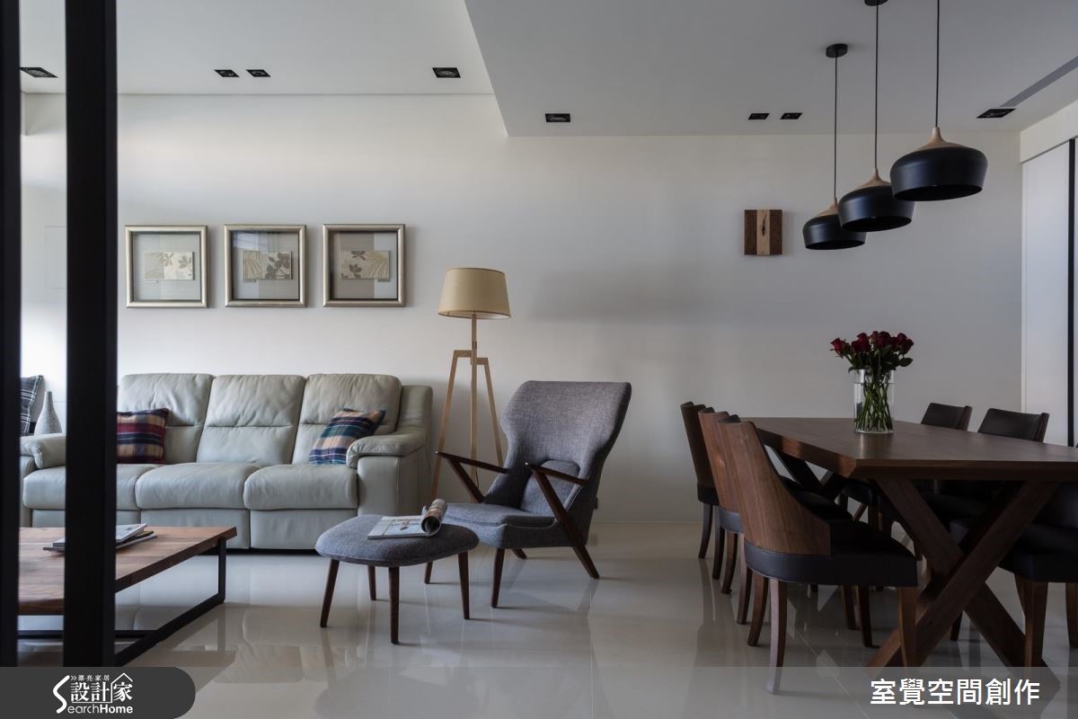 当成员涵盖不同世代,如何保有家人的开放互动和隐私感,便成为空间规划时的重要关键。设计师藉由简化动线以及中性色调的铺陈,让空间保有素朴实用风貌,无赘饰反而减少环境干扰,让人感觉更自在。【注入木质,净白空间添暖意】屋主喜好干净、大方的风格,藉由拉大墙面或是与收纳整合的手法,抹去建筑梁柱的存在感。虽然房屋拥有不错的采光条件,但一楼隐蔽性不足,设计师利用风琴帘调节空间亮度,也能与室外区隔。开放的公领域透过大幅留白,并搭配灰、黑色及木质家具这类中性色彩,衬托出明亮、温润的气息,亦成为舒适的聚会空间。主卧室透过增加木质色调的比例渲染沉谧氛围,并设置电视墙、梳妆台和衣柜墙,让私领域保有舒适便利的机能性。