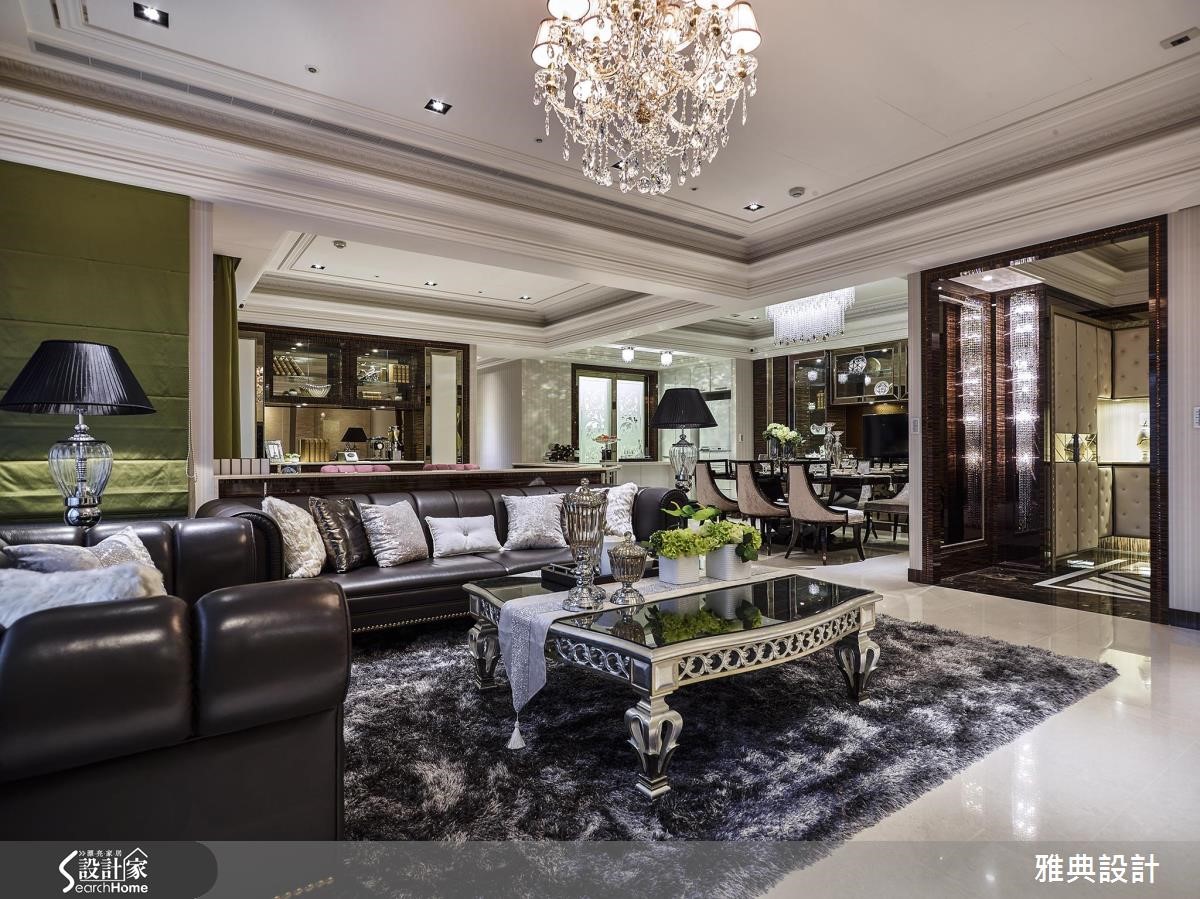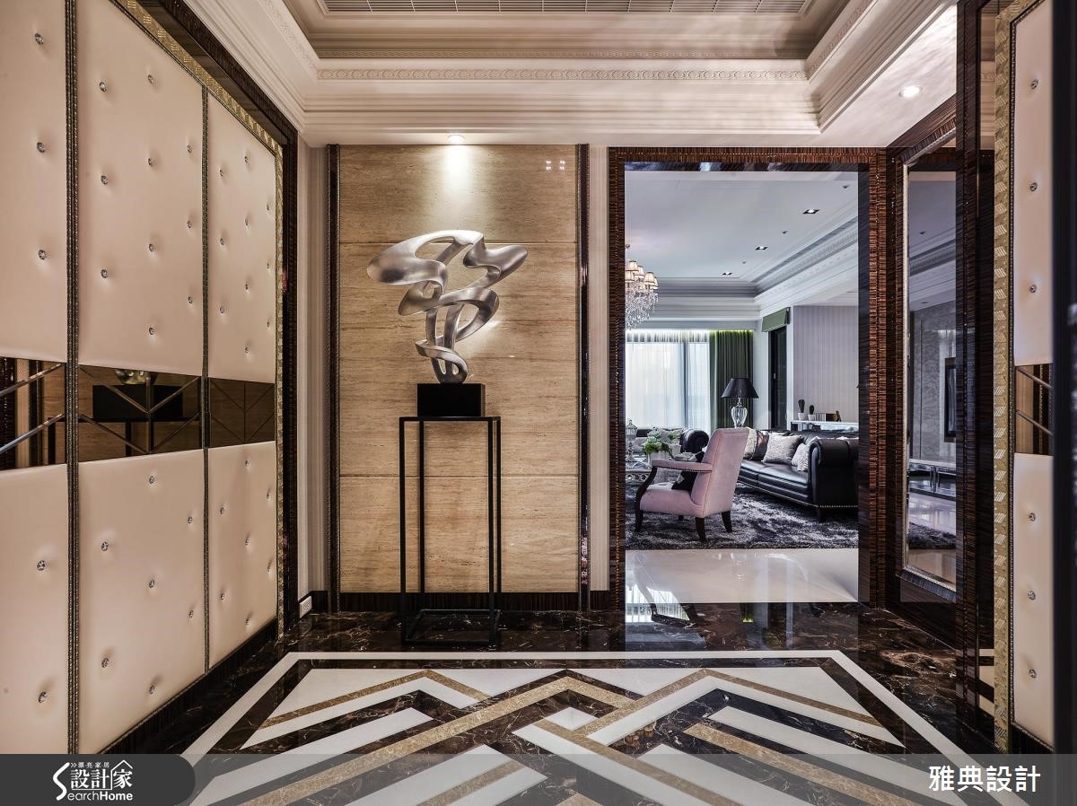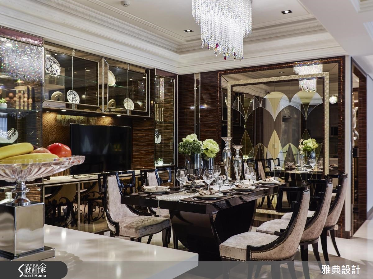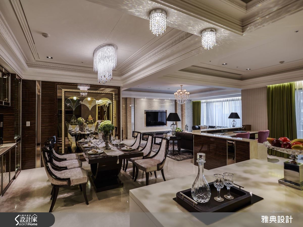 314平方米居宅,设计师贯彻奢华风的概念,增设两道墙面界定玄关范围,型塑入门后敞阔的开放视野。同时统筹收纳机能色彩搭配,打造出迷人的轻奢品味。快跟着小编一起走进来看看吧。【剔透镜面搭配,展现轻奢范】采用古典格局的设计,做出完整的玄关空间,与客厅区别,并做出门拱暗示雍容气质,展现气派优雅的迎宾印象。公共领域则采用全开放式格局,以黑檀木烤漆、镜面、大理石材质等贯穿整体,与高雅的家饰相得益彰。于天花做出线板堆叠,悬吊华丽水晶吊灯构筑视觉重点,使空间更显气势。且适时穿插粉红、绿色等轻盈色彩,平衡华丽稳重的基调,带出年轻氛围。而开放式的书房与轻食吧台设计,则让空间属性明确界定,兼具与其他领域交流互动。私领域除了规划超大更衣室,满足女主人收纳需求,亦延续了屋主喜爱的法式ART DECO风格,选用双色绷布、打造充满珍珠光泽的造型主墙,搭衬新古典雕花语汇的床头板,显现细致典雅的卧眠氛围。