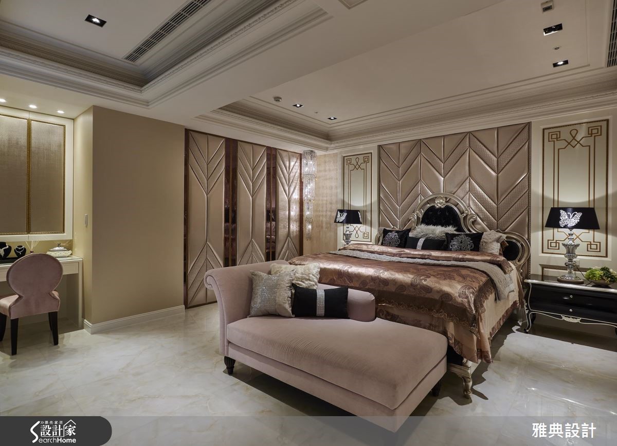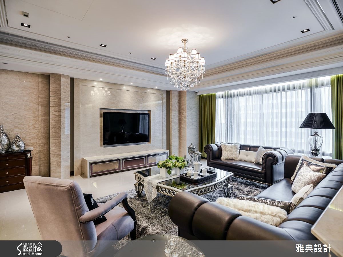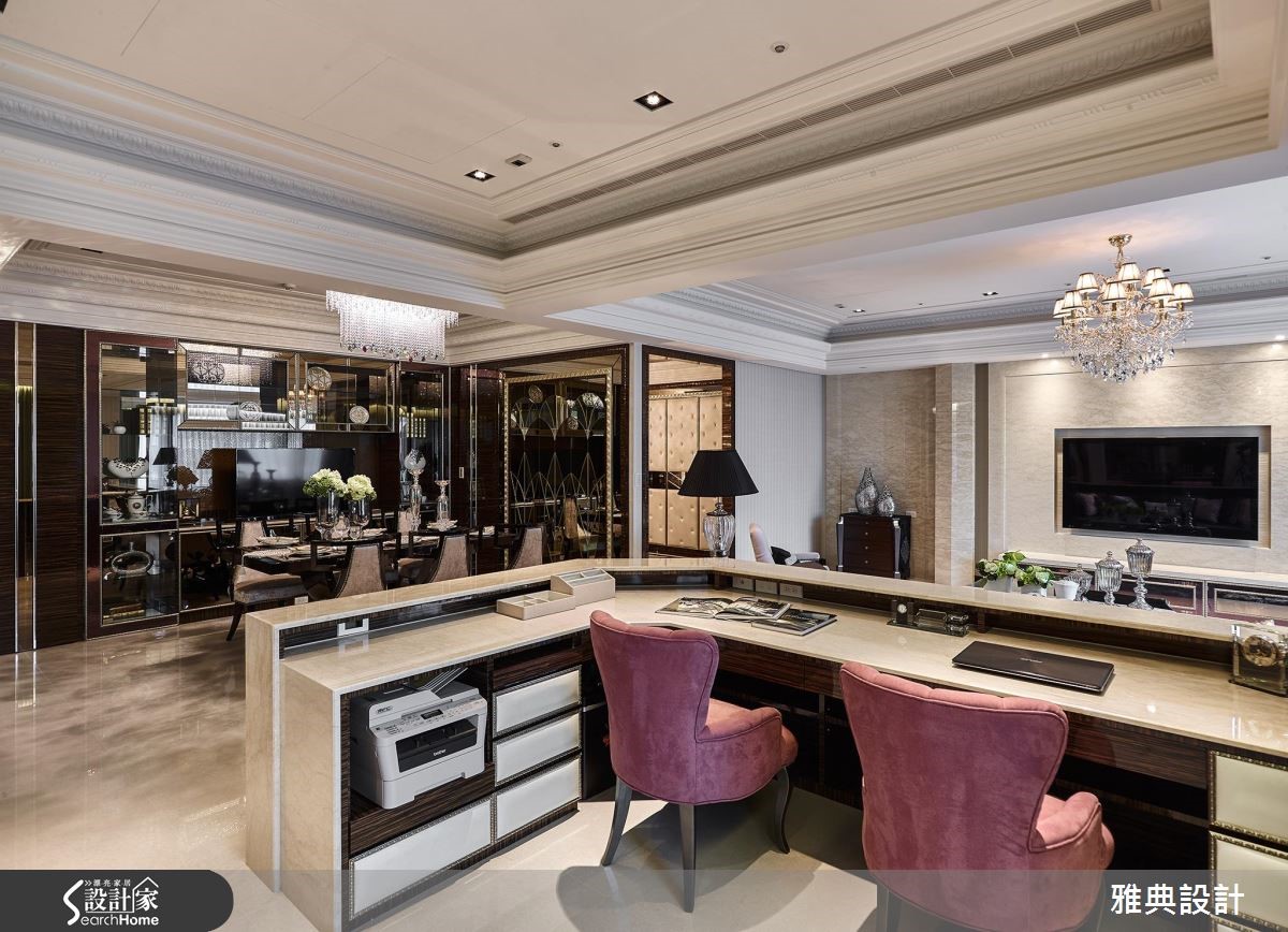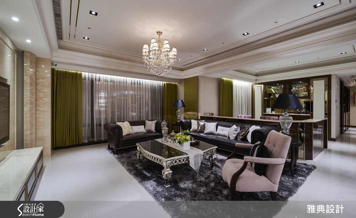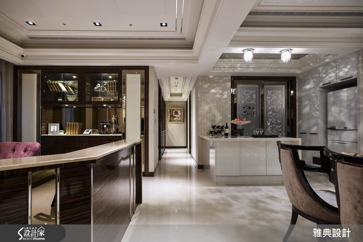 314平方米居宅,设计师贯彻奢华风的概念,增设两道墙面界定玄关范围,型塑入门后敞阔的开放视野。同时统筹收纳机能色彩搭配,打造出迷人的轻奢品味。快跟着小编一起走进来看看吧。【剔透镜面搭配,展现轻奢范】采用古典格局的设计,做出完整的玄关空间,与客厅区别,并做出门拱暗示雍容气质,展现气派优雅的迎宾印象。公共领域则采用全开放式格局,以黑檀木烤漆、镜面、大理石材质等贯穿整体,与高雅的家饰相得益彰。于天花做出线板堆叠,悬吊华丽水晶吊灯构筑视觉重点,使空间更显气势。且适时穿插粉红、绿色等轻盈色彩,平衡华丽稳重的基调,带出年轻氛围。而开放式的书房与轻食吧台设计,则让空间属性明确界定,兼具与其他领域交流互动。私领域除了规划超大更衣室,满足女主人收纳需求,亦延续了屋主喜爱的法式ART DECO风格,选用双色绷布、打造充满珍珠光泽的造型主墙,搭衬新古典雕花语汇的床头板,显现细致典雅的卧眠氛围。