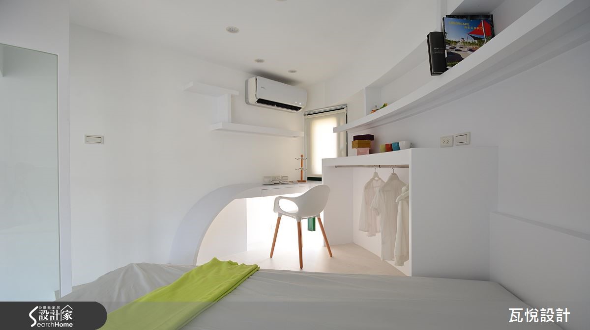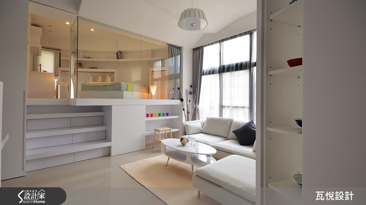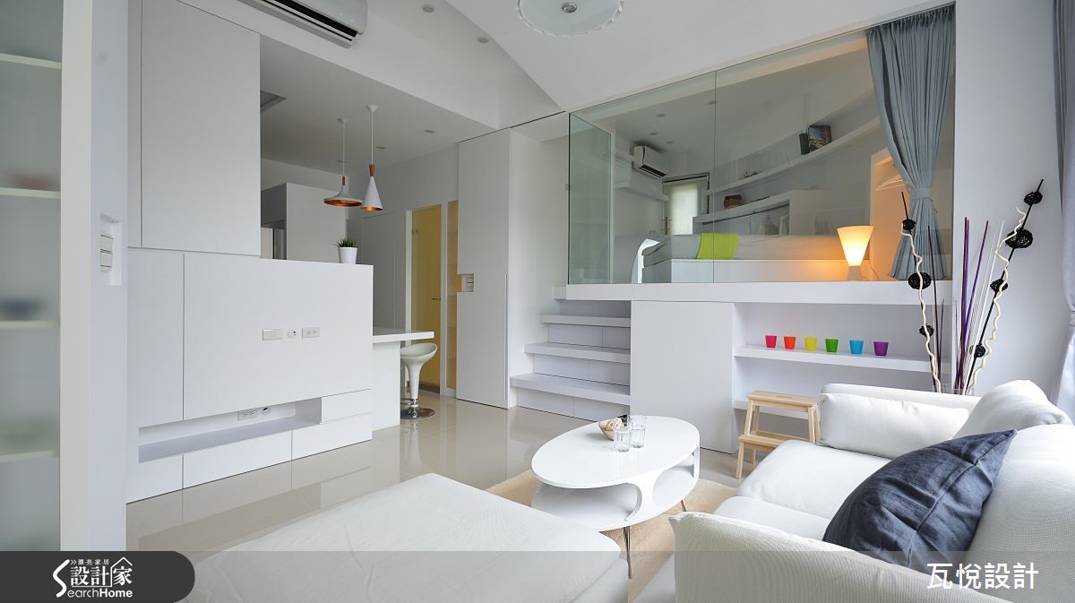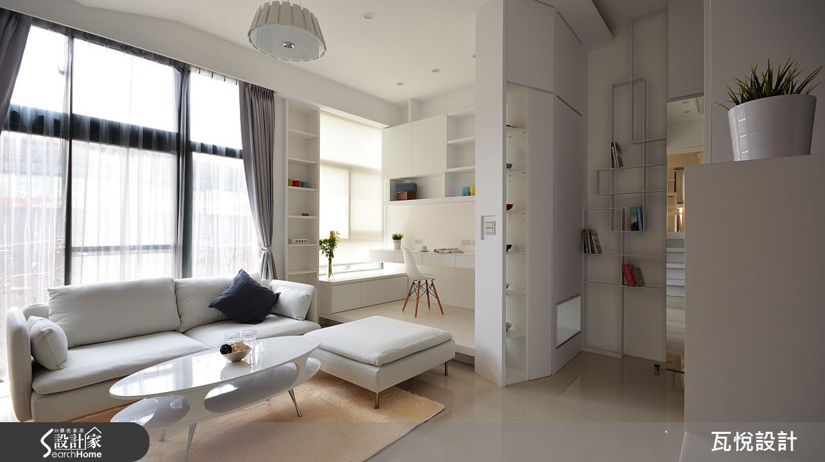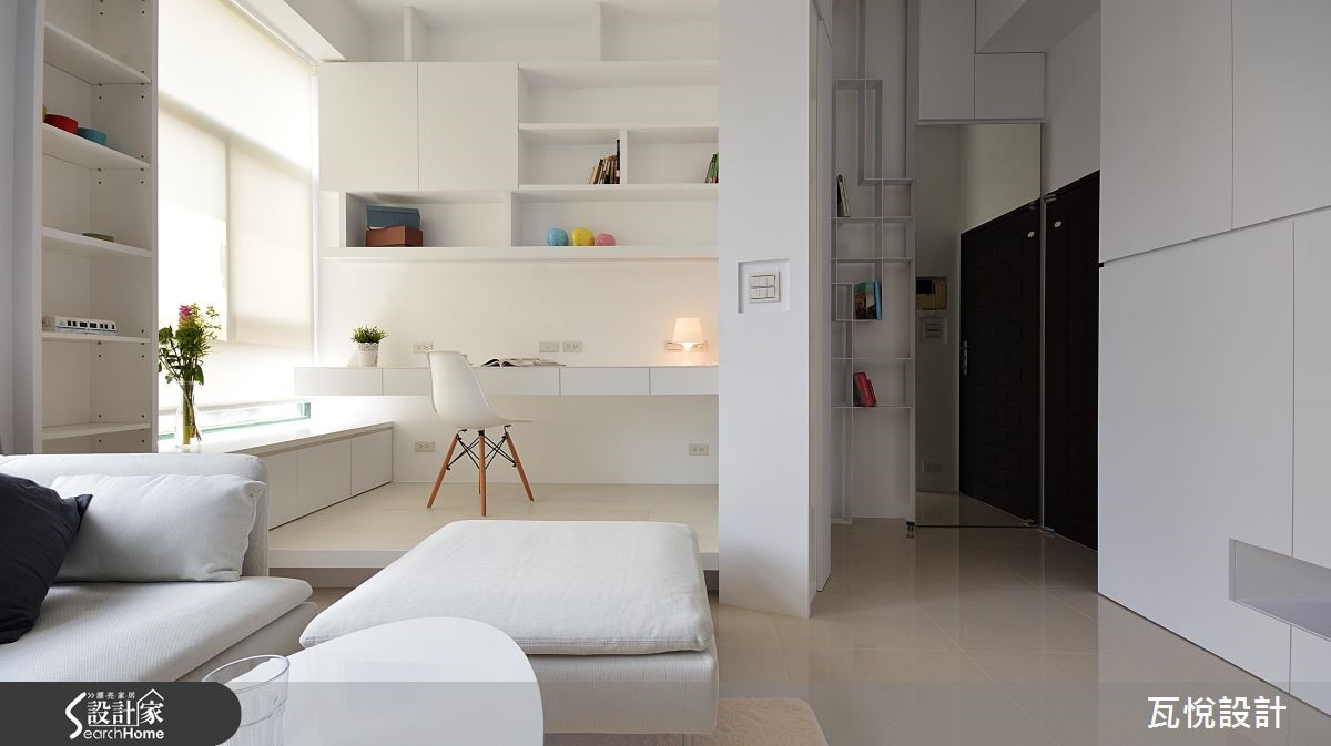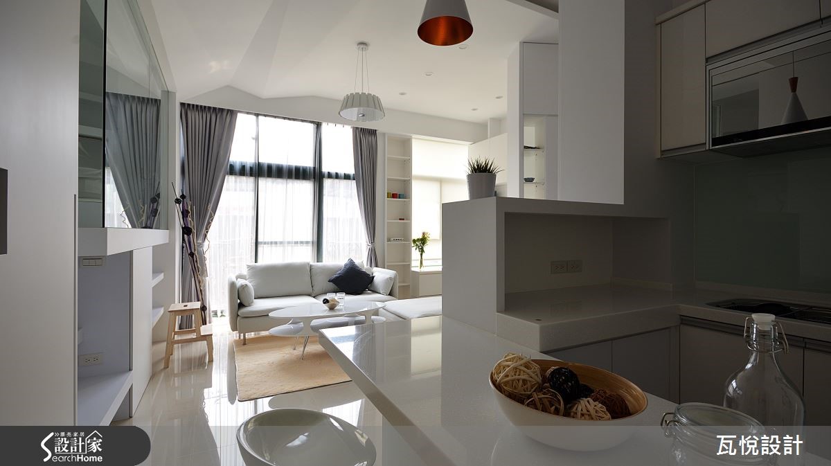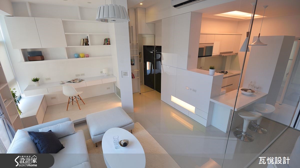 屋主为一家3口购置55平方米的毛胚屋,如何在小空间内创造大量收纳机能,同时维持开阔动线?设计师大量运用"复合式设计",同时纳入屋主喜爱的纯白色调与梦想的书房,让居家环境拥有超展开动线! 【架高地板,多了收纳和一间居室】为了改善采光,玄关拆除原先的隔断,更换为具有收纳机能的柜体。且以大面积玻璃取代女儿房实墙,善用边间优势,将光线引入,客厅、餐厅和厨房皆拥有明亮采光。主卧亦延续纯白色调与金属光泽,打造清爽明亮的睡眠空间。针对动线规划,以变更客厅格局、 90 度翻转沙发坐向,结合女儿房与书房空间,扩大视觉感受。且以复合式机能整并空间,将大量收纳机能置于垫高的女儿房楼梯下、收纳柜结合屏隔、L型厨房结合吧台等,让动线更利落。