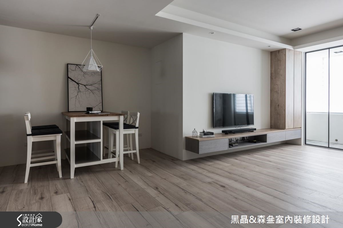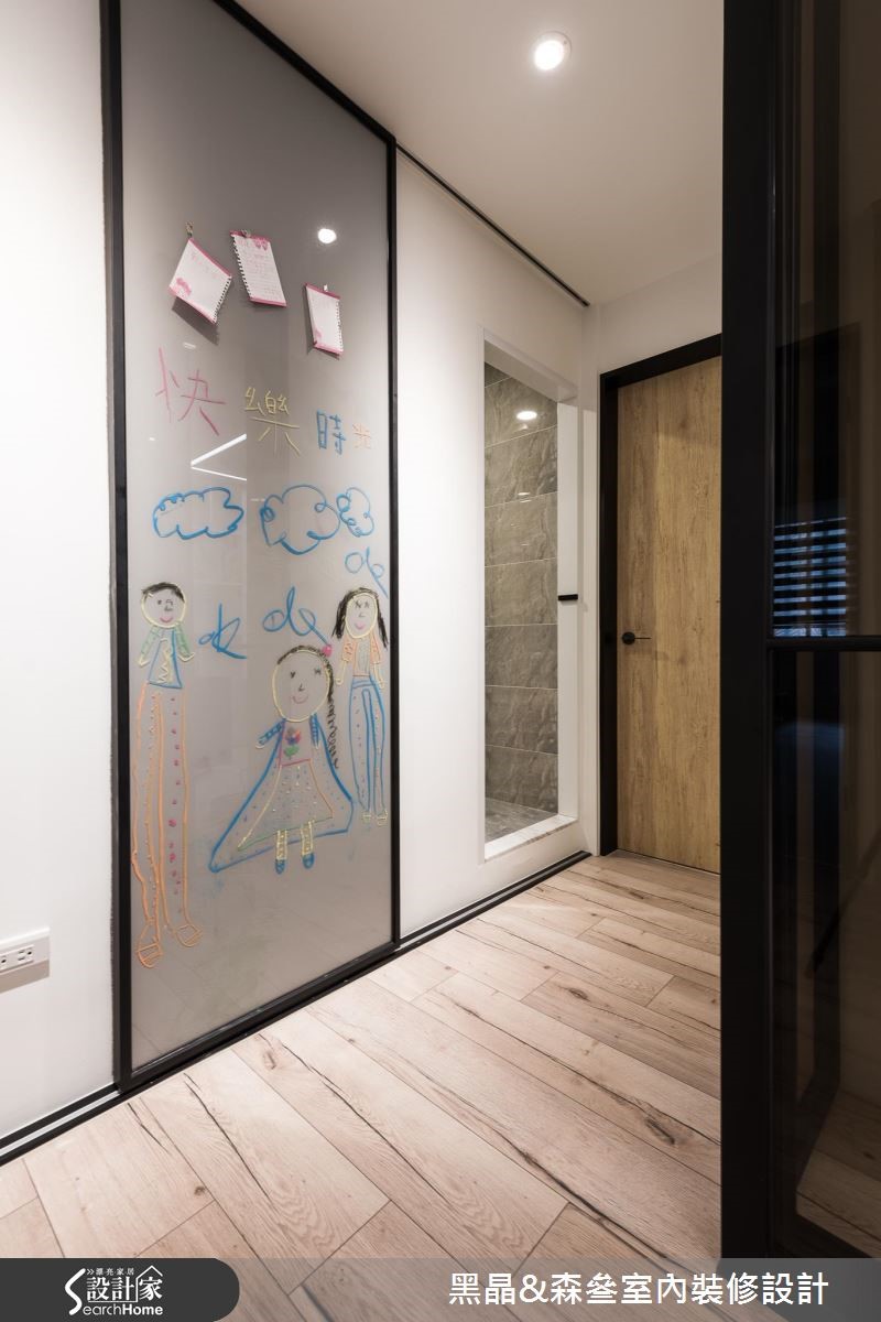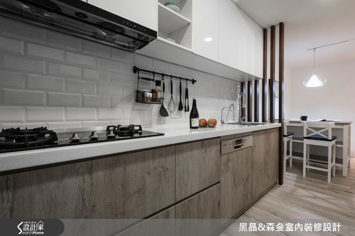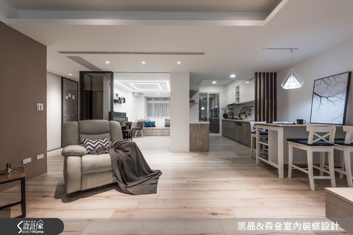 93平方米的老屋存在漏水、壁癌问题,设计师在加以重整后,依循屋高给予天花板修饰以拉抬视觉感,同时导入利落开放的现代风格,塑造出舒适的生活氛围。【玻璃门隔断,引入自然日光】设计师以开放式手法规划公共空间,展现开阔的整体印象,在玄关、厅区之间配置清玻铁件隔断,不仅延伸公共领域视野,更让自然光得以均匀引入室内,并在简约空间之中以豆沙色挥洒沙发墙,创造极具暖意的画面。厨房做出格栅界定与餐区之间的范围,以白巧克力砖搭配一致的木纹厨具,打造清爽的料理场域;原先小而昏暗的书房,则将旧有隔断拆除,改为玻璃拉门,使光线可任意穿透,并加入不同的木皮纹理,彰显柜体的多变层次,而天花板则嵌入LED灯框架,瞬间提亮整个空间。