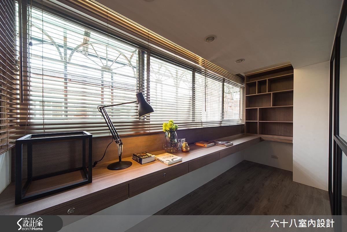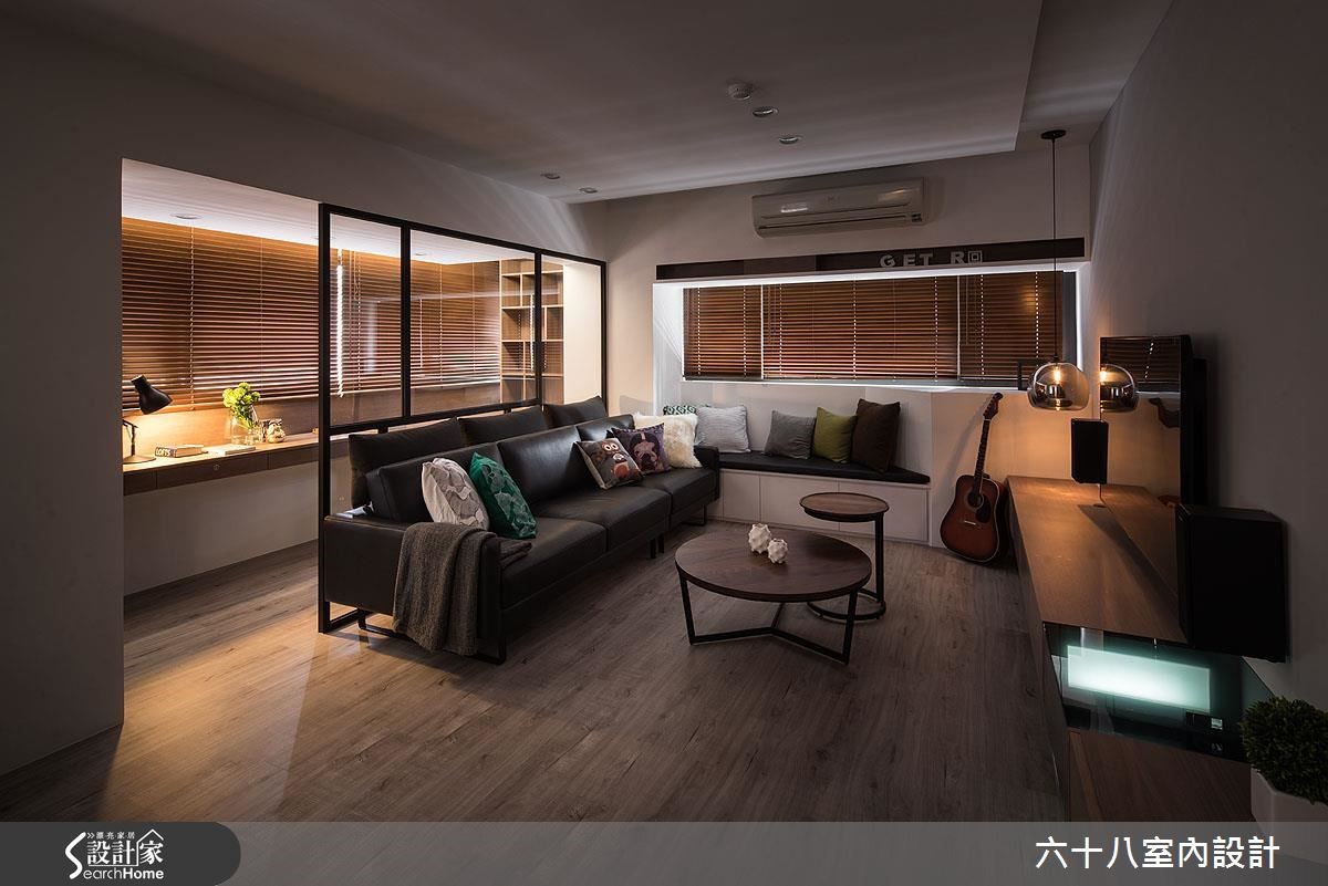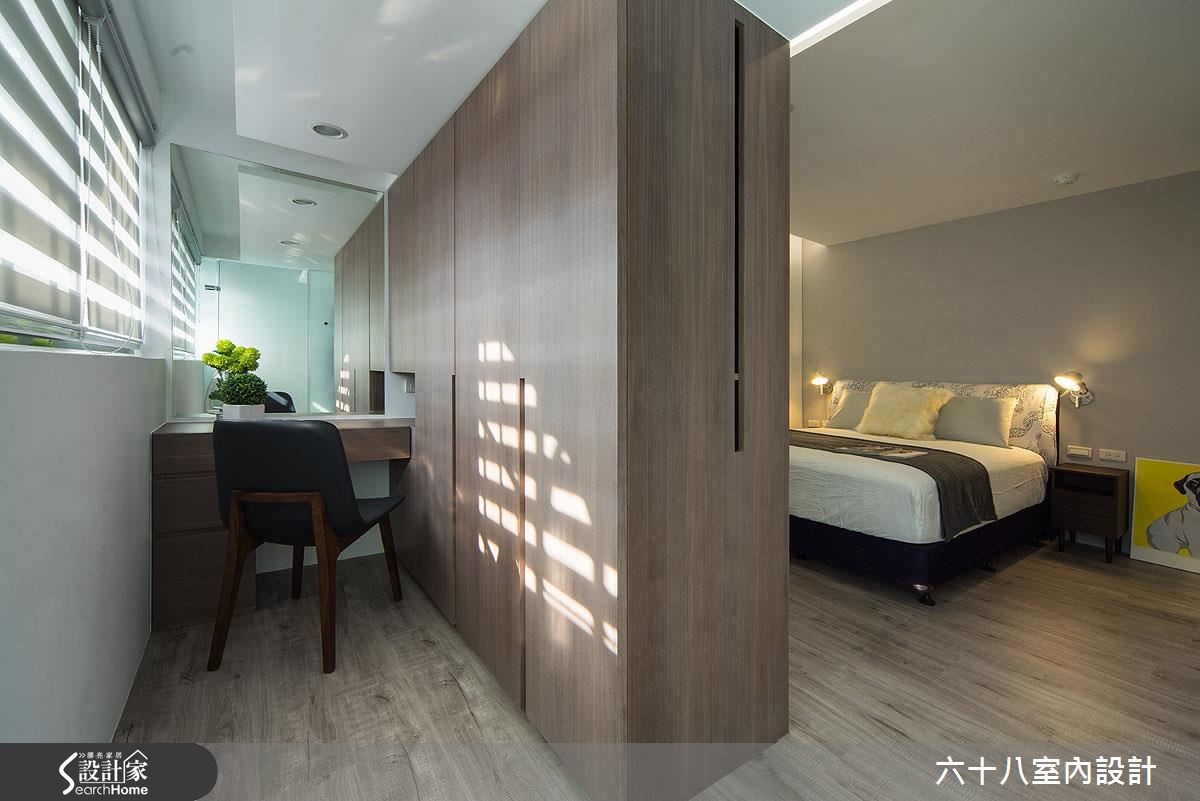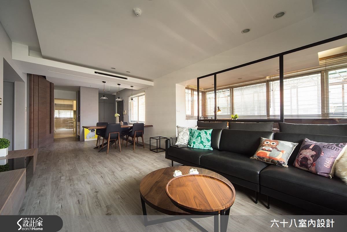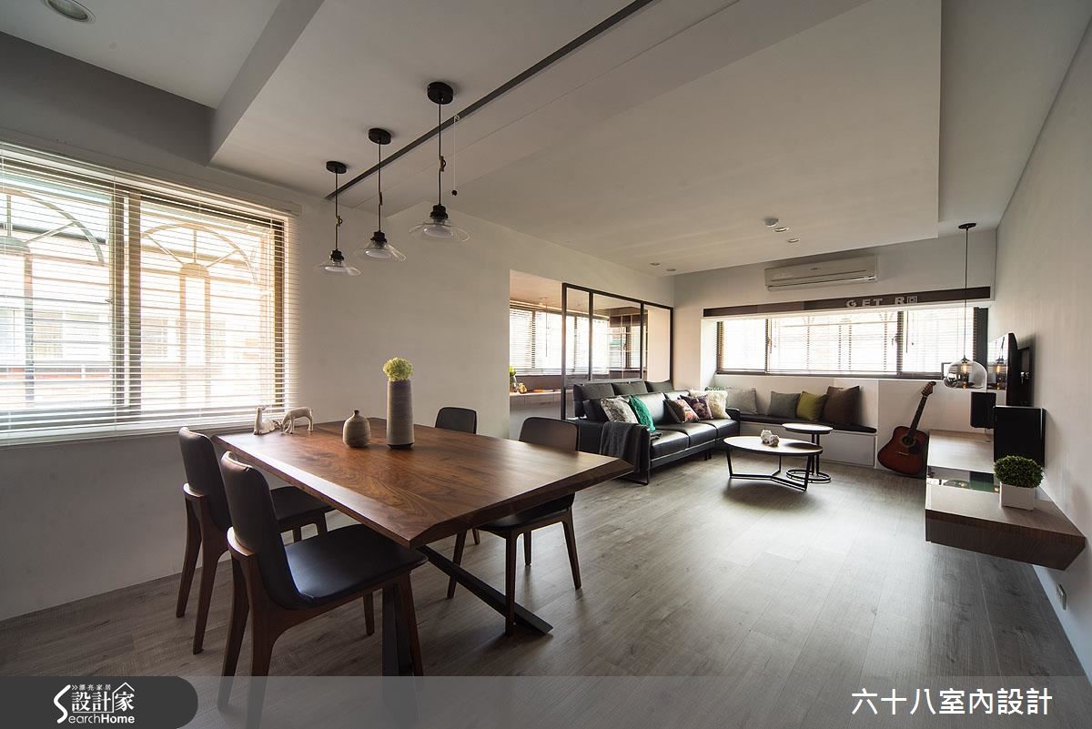 本案的公共空间拥有优良的 L 型采光,但因客厅后方沿窗区域多出一块长型畸零,又加上大梁问题,该如何运用设计巧思修改空间弱势?设计团队除了善用自然采光,更在客厅电视悬柜加入内嵌式照明与吊灯,在夜晚时分打造浪漫风情。【畸零空间不浪费,转为阅读收纳】擅长操控光影用度的设计团队别出心裁,将沙发置于大梁前方,巧妙避开视觉干扰的问题。并以铁件玻璃屏隔、吊顶设计化解大梁的压迫感。接着,在沿窗区域设置结合收纳格柜的长桌,成为光感十足的阅读所在,玻璃隔屏更为客厅保留充裕的日光。开放式客、餐厅之间保留流畅动线,设计师更利用长型空间的距离优势,将投影幕藏于餐厅吊顶中,将公领域化身家庭剧院,成为一家四口的欢聚场所!主卧利用大型衣柜,将沿窗区域隔出一个梳妆台,兼具收纳与空间划分机能。