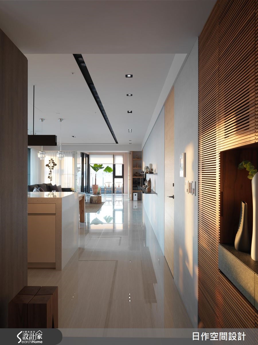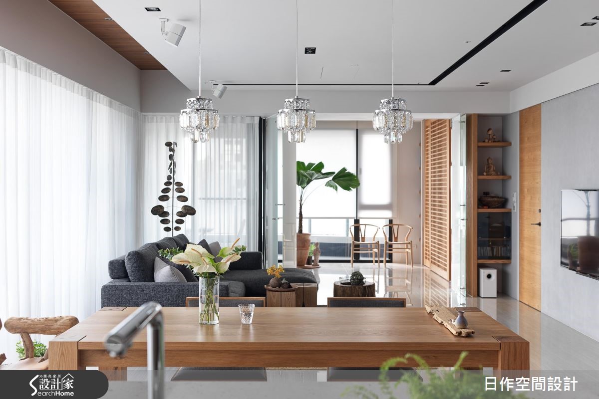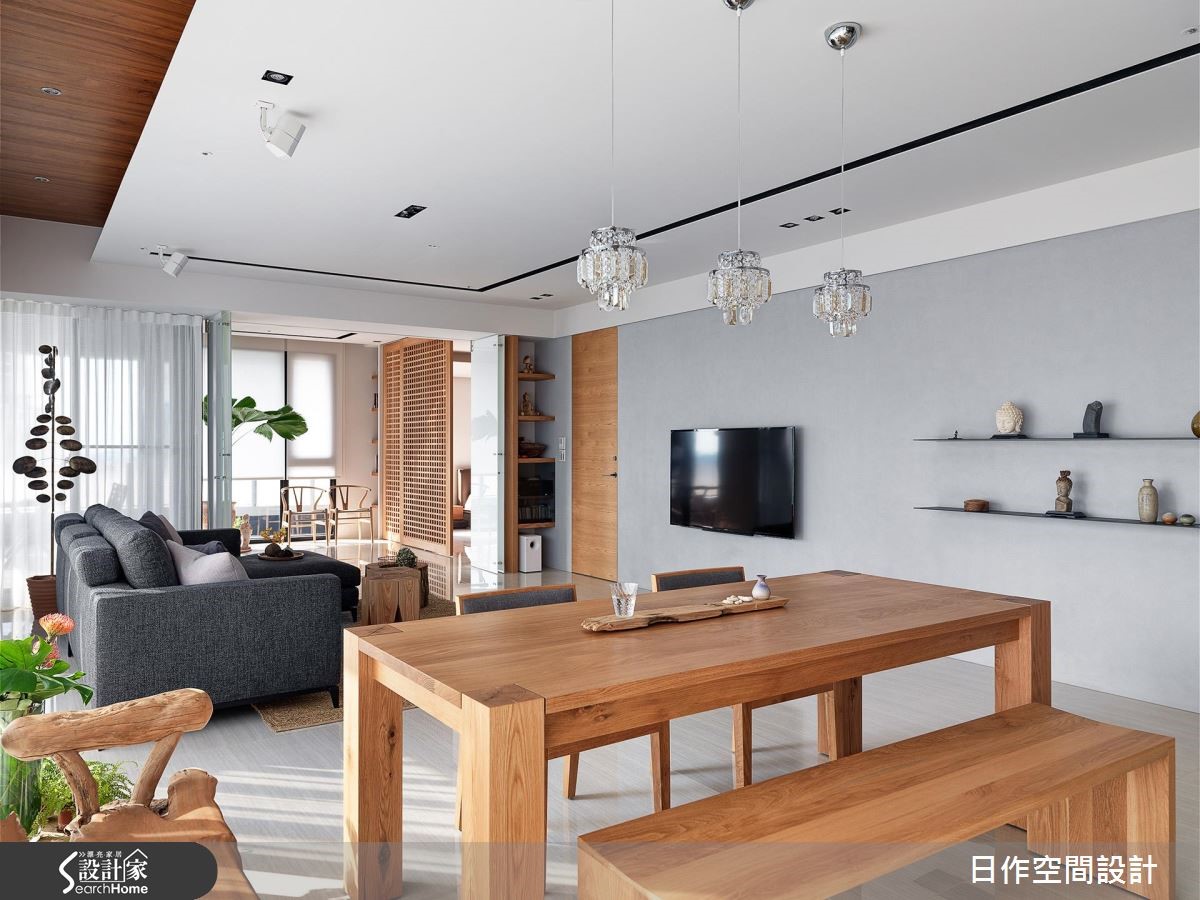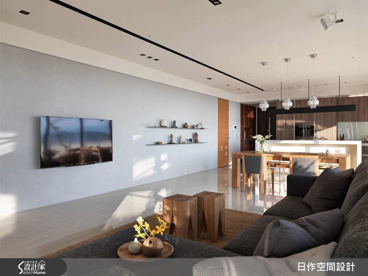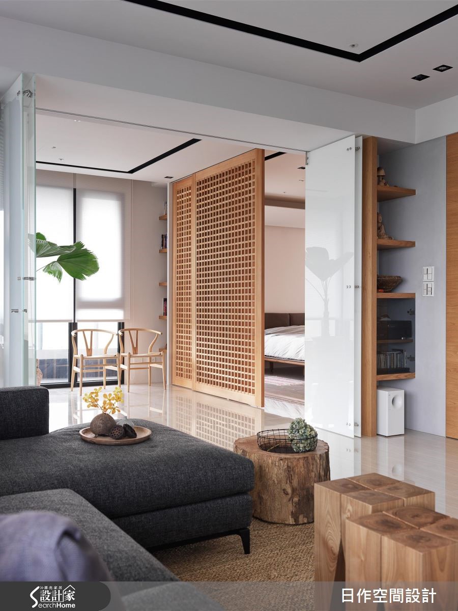 设计师舍弃无谓装饰,藉由采光、木质调的相融,饰以简洁格局线条,型构纾压放松的生活空间。走进居宅,可见白色、灰阶与木质色调的完美交融,重现屋主巴厘岛的旅行情调。【巧用拉门,维持空间通透视感】空间本身有著L型开窗的优势,引入充裕明亮的采光,同时全室采用纯白和浅灰色调,空间更为纯净开阔。电视墙採以木质隔板嵌墙,带有古韵的樸实表情。餐厨区与客厅相连,实木家具的陈设,营造温润的餐聚时光。开放厨房的设计则保留家人的交流互动,情感更升温。卧室则规划经典日式推拉门,展现宁静禅意,透过格状缝隙的光线穿引,兼具隐蔽但通透的视觉美感。 并在立面转折处做出不少收纳展示空间,满足家饰与书籍摆放需求,也替平凡无奇的角落平添趣味。