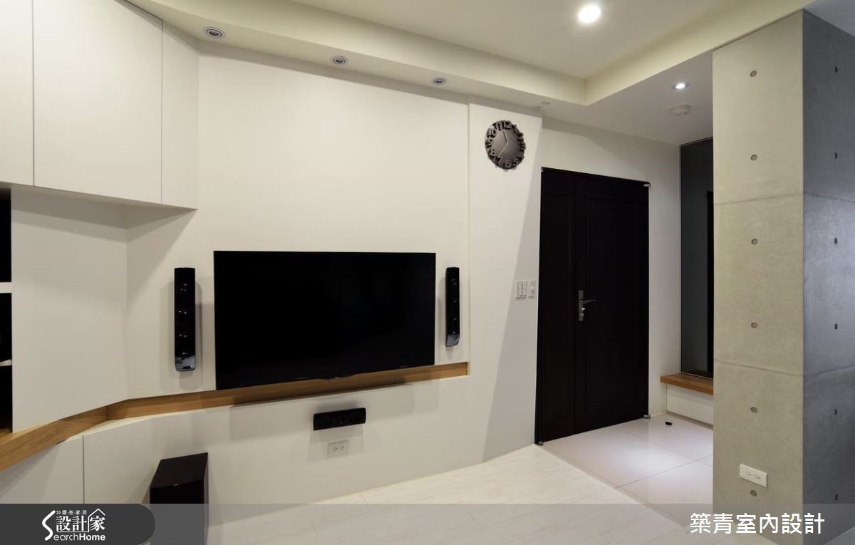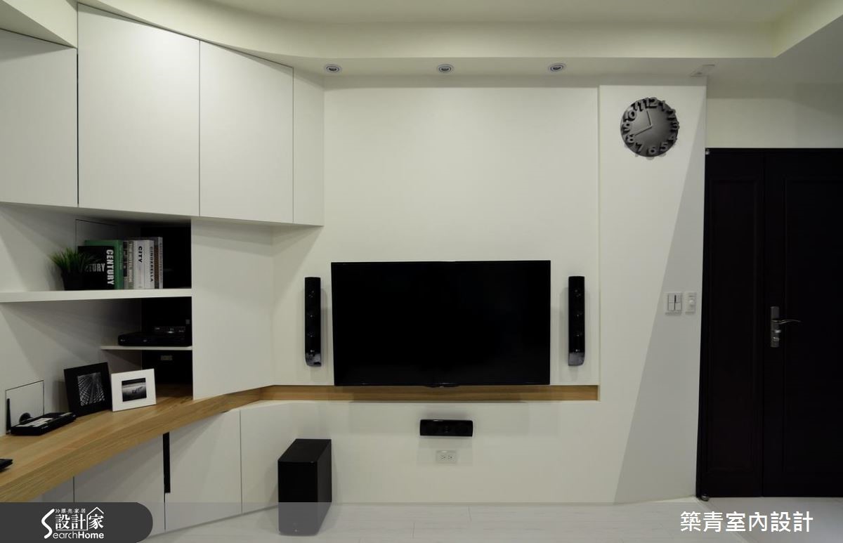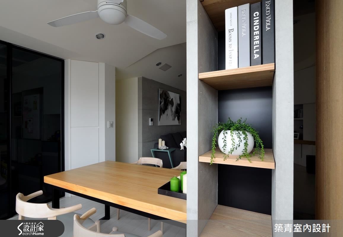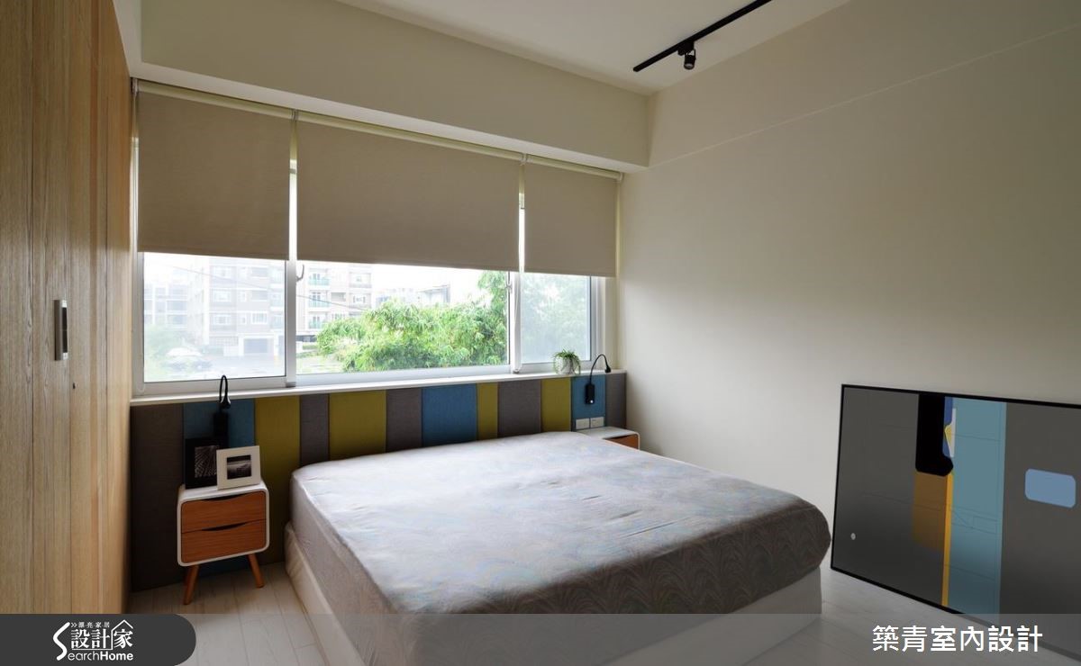 谁说必须使用昂贵建材才能创造质感?这间有著149平米的新屋,设计团队在相当有限的预算下,善选材料、色调与富有创意的线条规划,也能创造满盈巧思的居家空间。 【柜体不做满,引入光线】玄关以灰镜扩容,并将穿鞋椅结合收纳柜增加实用性。刻意让垂直相交的两面柜体不做满,让光线透过墙缝进入玄关,达到引光和延伸视线的功效。开放的公共区以纯白色调打亮视觉,巧妙以木作线条包覆墙壁折面,勾勒出柔顺弧形。利用电视墙转角延伸桌体变成书房,并在上方结合电器柜功能减少畸零空间浪费。玄关柜体及沙发背墙涂上清水模漆,搭配色调轻浅的超耐磨地板,创造清新不造作的居家氛围。玄关清水模墙面更扮演收纳与屏风的角色,巧妙在开放空间划分餐厅位置。主卧以跳色绷布与移动式家具创造北欧感十足的缤纷色彩,并利用木作墙面隐藏卫浴入口,成功收拢干净视觉。