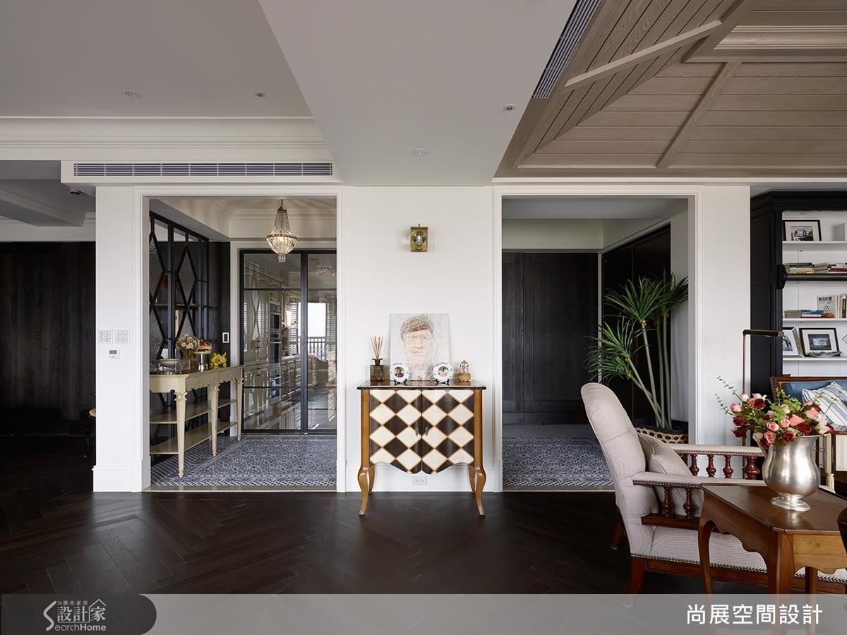 美式空间多半为大户型的别墅,因此在玄关会采用双动线的设计,让人能自由出入。想要营造大宅风范,不妨像此案一样,玄关扩容并后退,在左边多开一道门,双动线规划,引领开阔自由的动线。