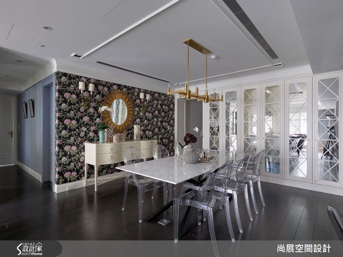 想让美式宅更显奢华,自带金色的家具家饰能为空间助攻,就像是以下案例,餐厅除了饰以花色墙纸,凝聚空间焦点,更搭配放射状的金属明镜与黄铜蜡烛吊灯,带来轻奢质感。