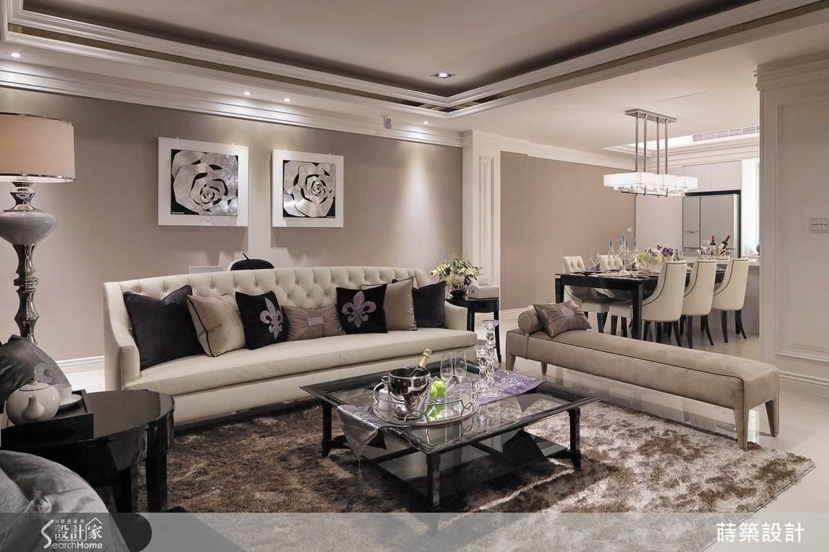 玄关侧边墙面的收纳柜,除了当作鞋柜之用,当中并隐藏着公共卫浴的入口,设计相当巧妙,完全不会影响到客厅链接餐厨空间的视觉美感。开放式的厨房则以人造石中岛与餐厅连结,灯饰及壁面呈现bling bling的时尚感。