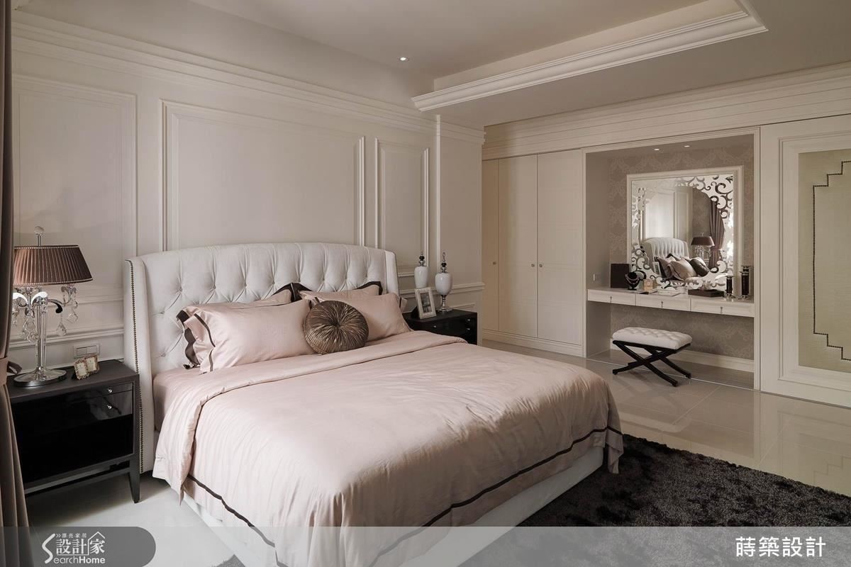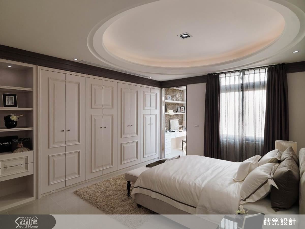 四楼的大房间留给较成熟稳重的大女儿使用,与孝亲房一样,凸出畸零地规画成小书房及梳妆台。其次,采用典雅线布置,符合大女儿内敛个性;壁面上方另以深咖啡色带环绕,稳住了白色过于轻淡的氛围,而圆形天花板缓和了中性的方方正正。