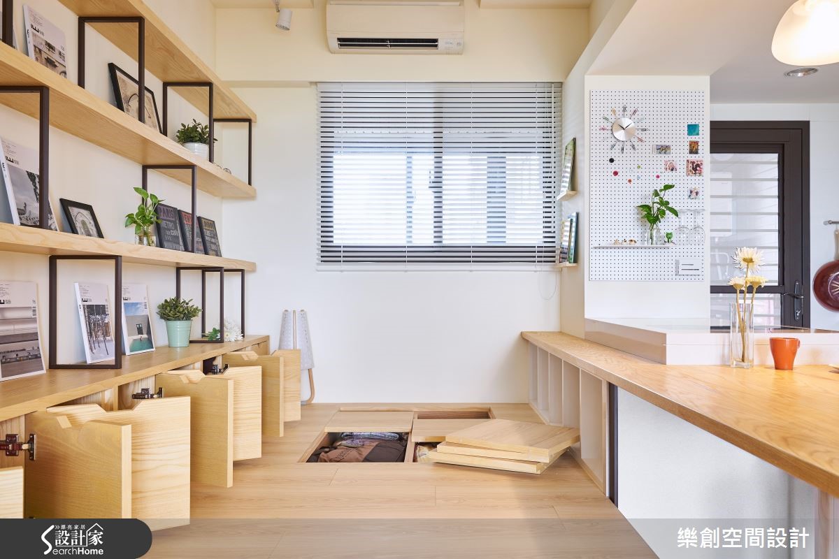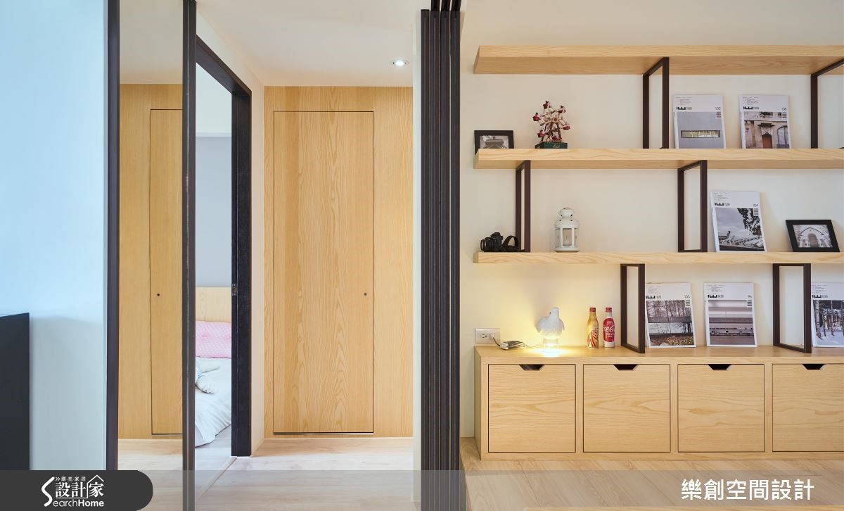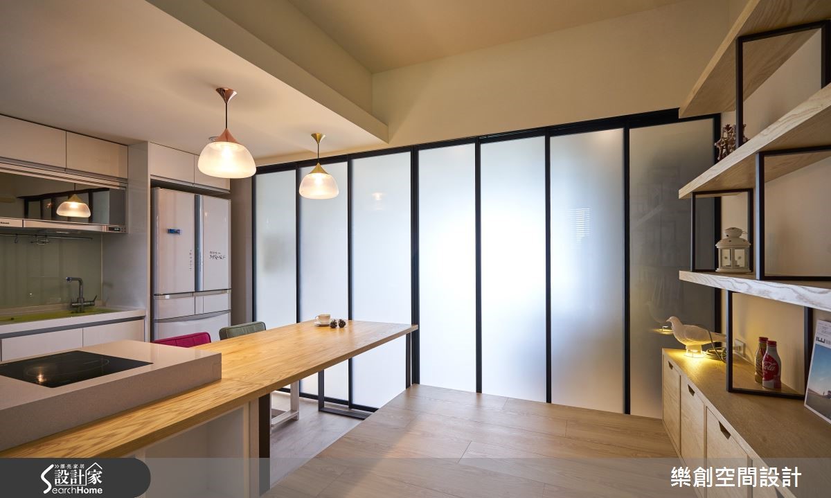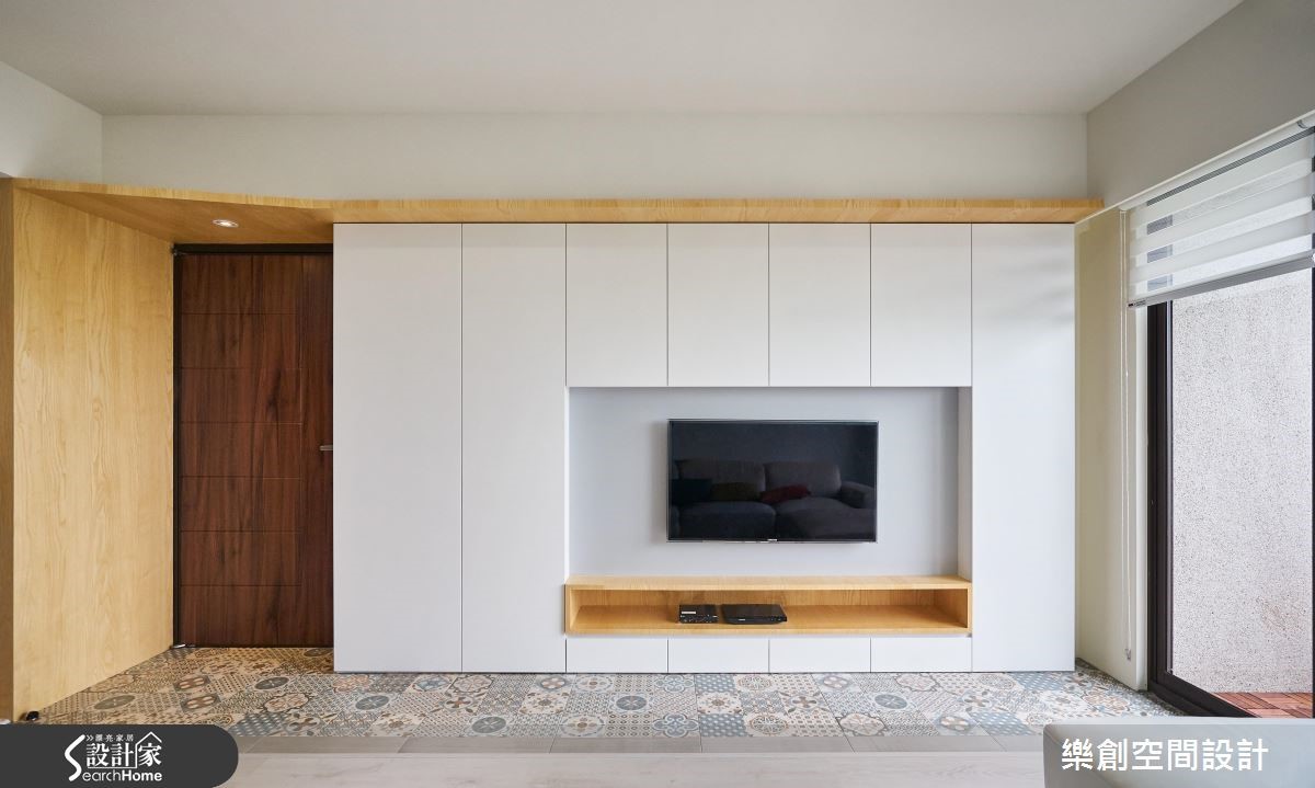 身为老师的屋主拥有幸福的三口之家,想给宝贝女儿充满爱的成长环境。擅长北欧风格的设计团队融合甜美色彩与大量木元素,更融入"复合式空间"的设计概念,完美串连全家人的欢聚生活。 【多功能空间,强化家人情感互动】本案的亮点为"复合式空间",重整扩大餐厨空间,中央运用长桌搭配吧台,将餐厨空间一分为二。一侧作为烹煮、用餐的领域;另一侧则设置架高地板,搭配柜体,就成了亲子共读的阅读区。巧妙结合多功能书房与餐厨,为一家人创造零距离的互动设计。客厅从玄关到电视墙前铺设花砖,除了内外地坪分明外,更与超耐磨地板形成视觉层次。客厅主墙与背墙采用跳色对比,纯白电视墙身兼收纳柜功能,营造干净视觉。背墙则涂刷淡雅的水蓝色,加上一面世界地图,富有寓教于乐功能。