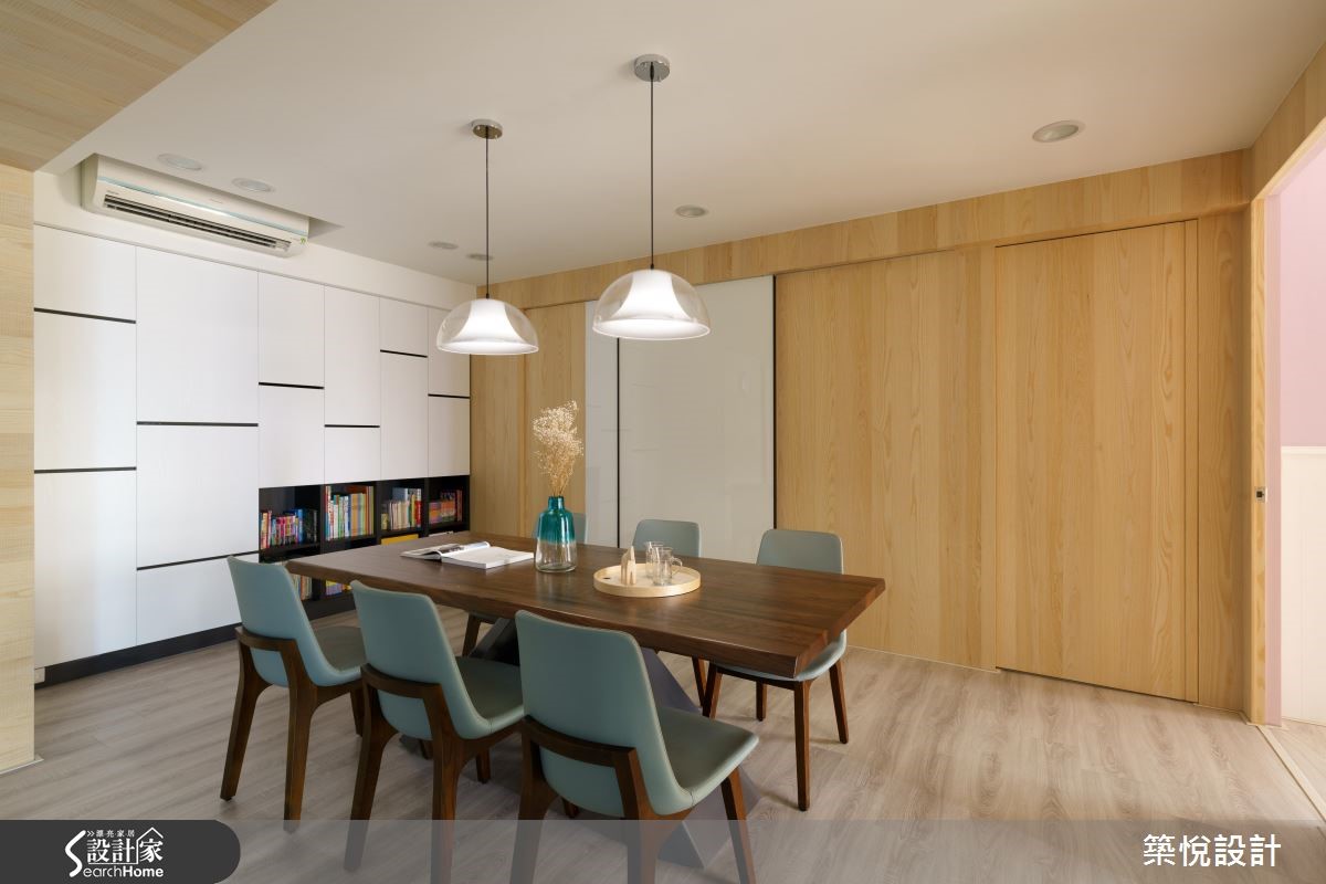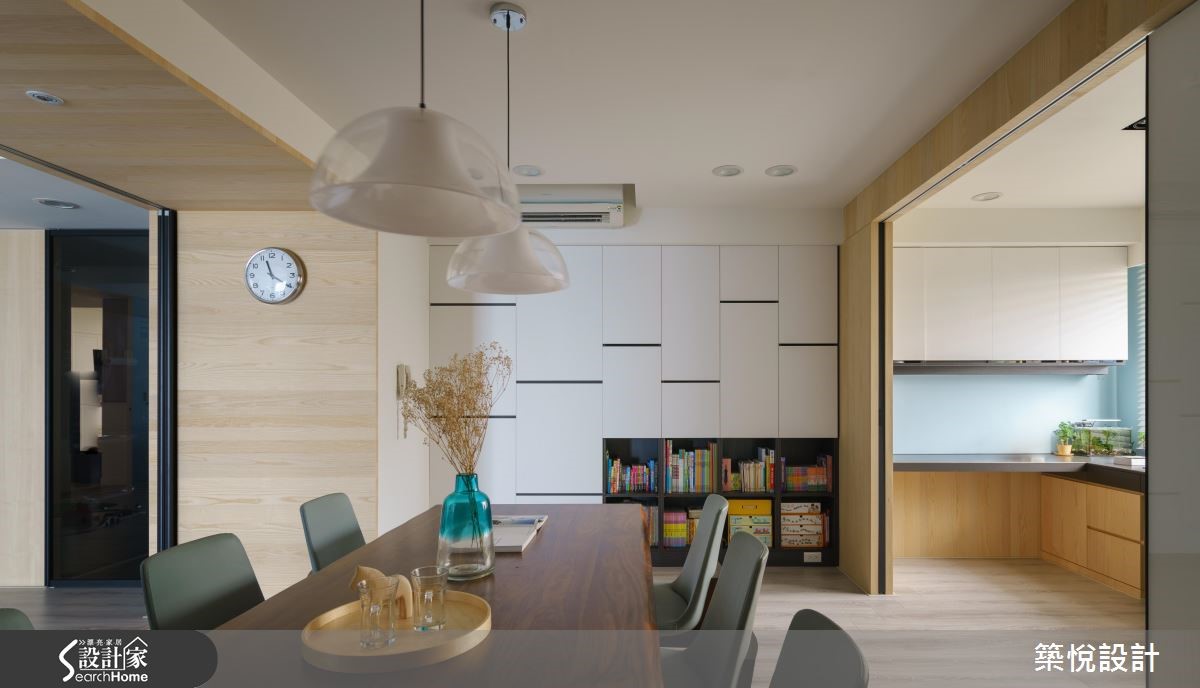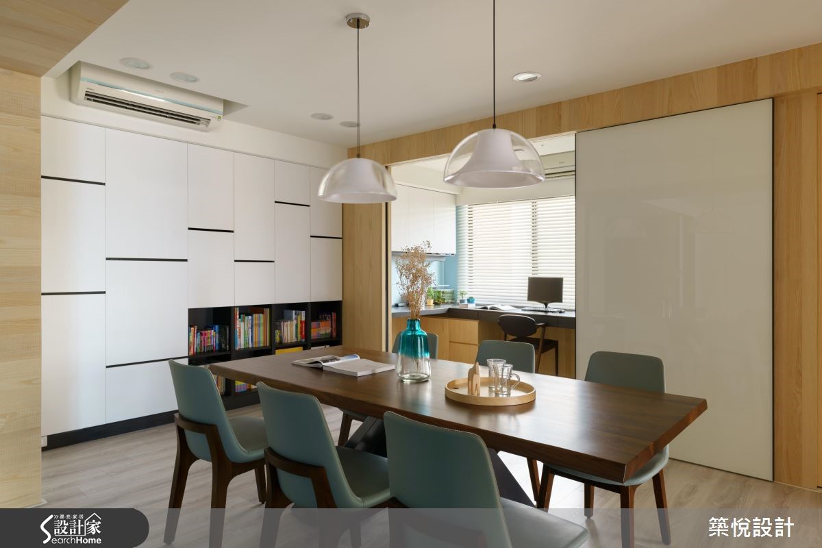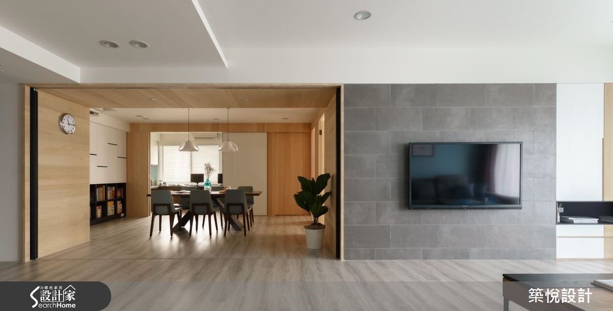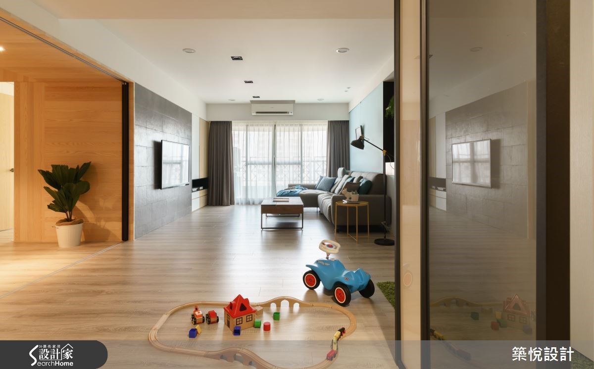 设计师重整149平方米的二手房格局,取代原先材质与动线皆不符需求的木作装潢,打开公领域视野,给予一家4口零阻碍的欢聚空间! 【玻璃拉门取代隔断,使用更弹性】设计师看见格局与采光优势,并配合亲子空间需求,以木质与铁件玻璃拉门取代公共空间部分墙面,可随心创造流畅、无碍弹性空间。玄关以透光屏隔抹除穿堂煞疑虑,将通往主卧的木质门片作为及顶收纳柜与水蓝客厅背墙的串连,利用建材与色调的融合营造视觉丰富度。【大量木元素,串连宽敞视觉】石作质感的电视墙,与纯白色机柜及色调轻浅的木地板形成清爽却不显冷冽的组合。由客厅向内延伸,为相连的餐厅与书房,三个领域可互相独立或相通,让孩子的游戏空间无限延展。