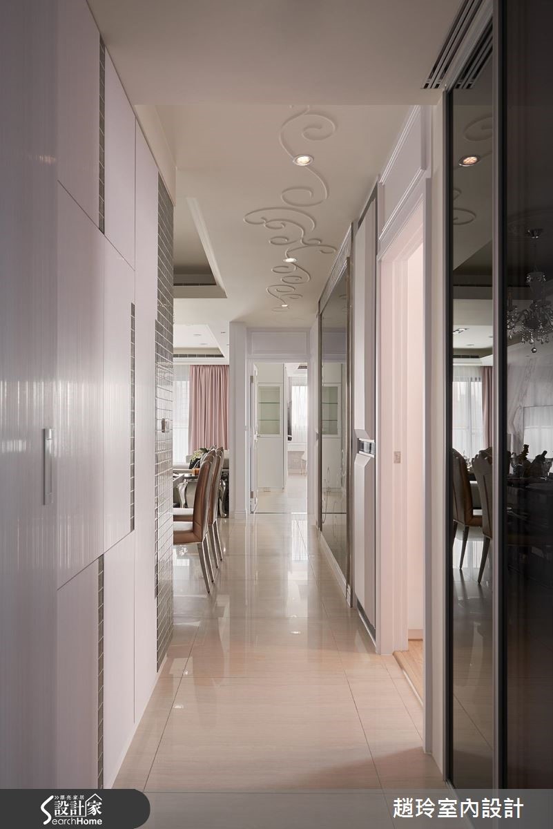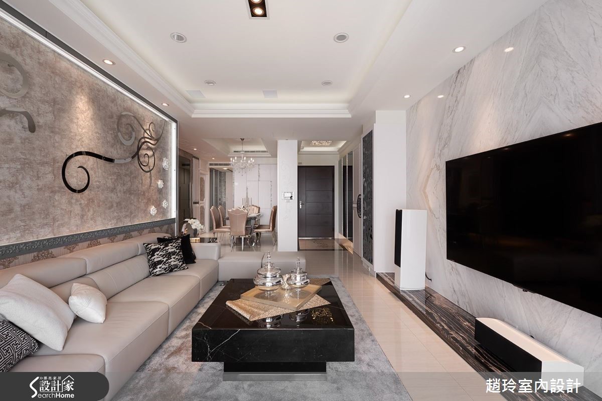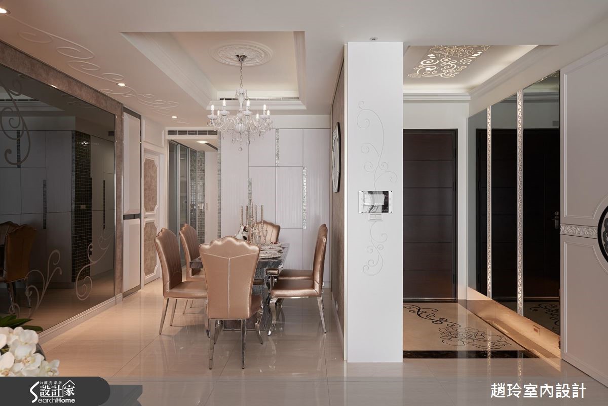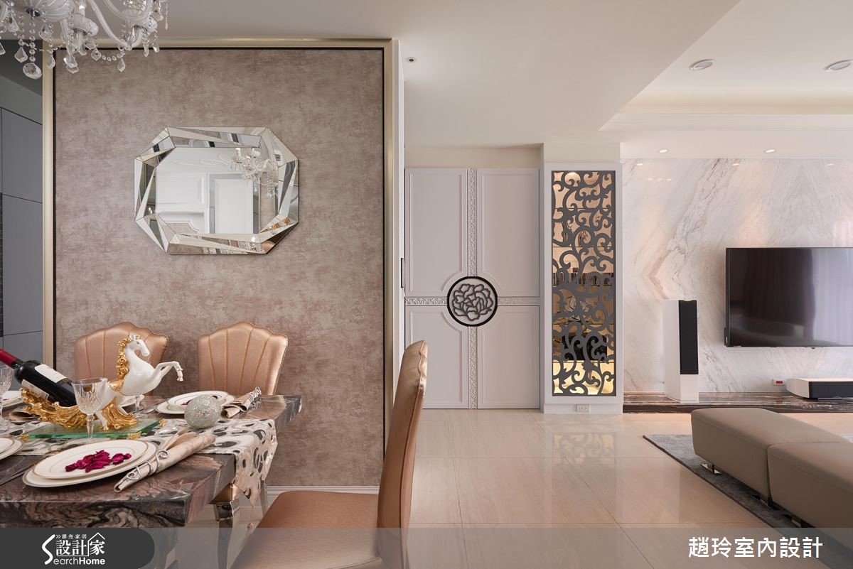 248平方米居家空间,藉由牡丹花元素的运用、带入吉祥富贵意象,并搭佐细致材质演绎,揭开现代新古典的美丽面纱,快跟着小编一起走进来看看吧! 【材质相呼应,营造优雅气质】空间选用暖感的轻浅色调铺底,并注入大量古典雕饰,营造优雅气质,电视墙采银狐大理石材铺陈,沙发墙则运用铁件雷射雕刻搭配四朵立体花卉,搭衬细腻的框景围塑,勾勒专属且独到的美学表情。餐厅利用深色镜面铺叙墙面,搭佐香槟色调妆点,再以一盏古典灯饰凝聚视觉焦点,创造不凡的用餐场域;卧房则揉入银色、金色等缎面质地,营造亮丽的床头表情,同时加入金属与镜面材质呼应,诠释高雅的生活情境!