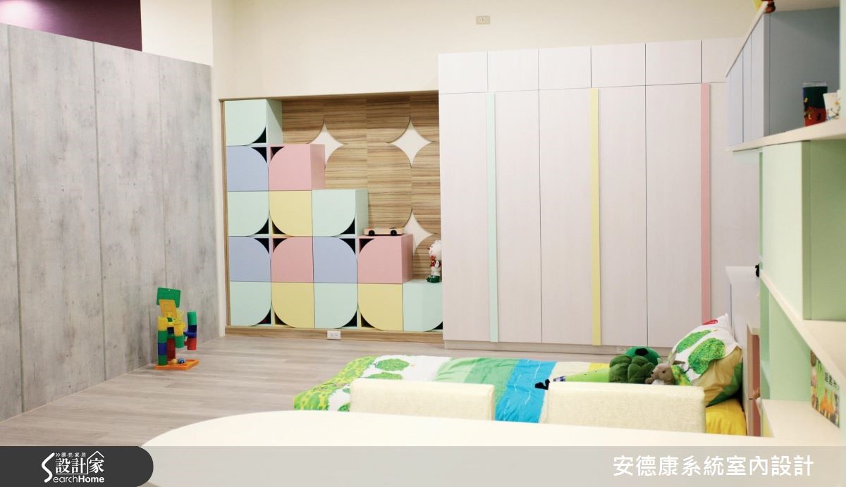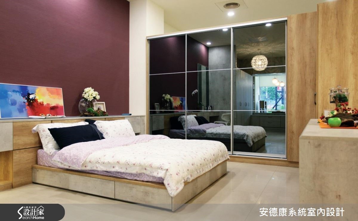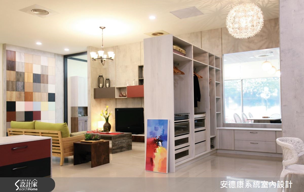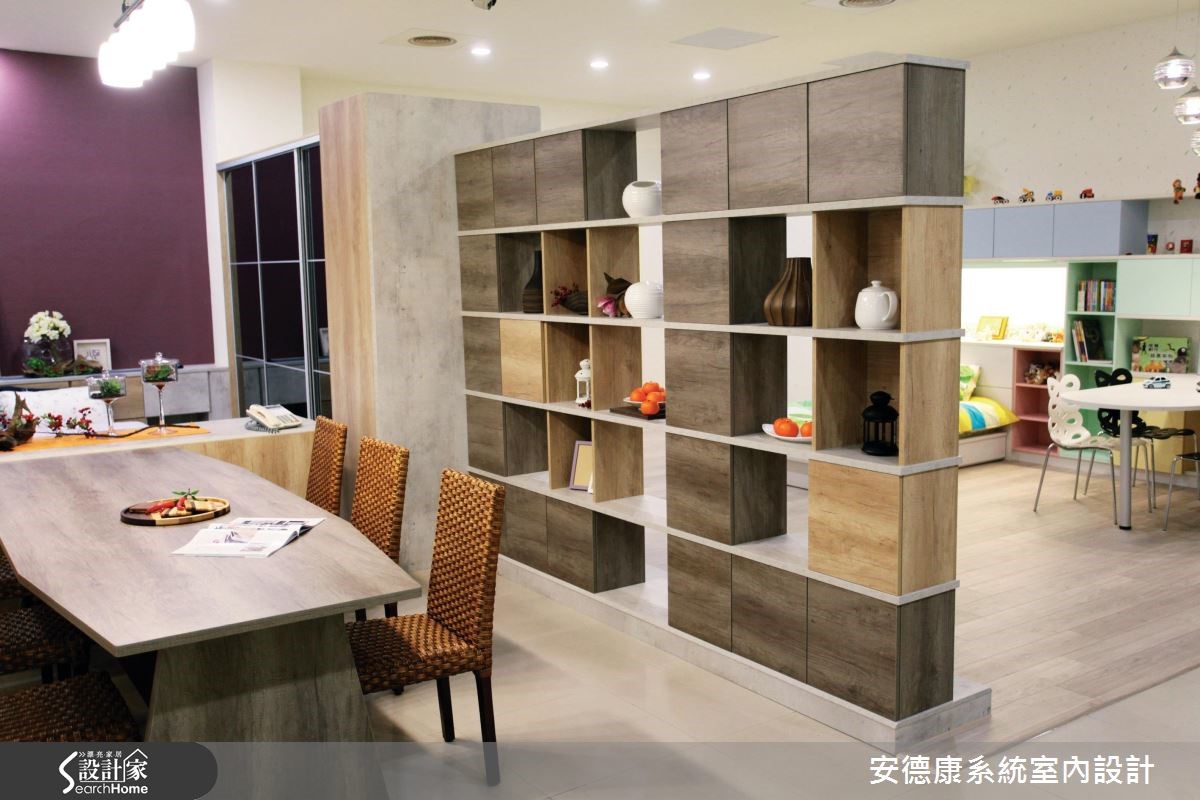 室内装修选配系统柜,是现代小资的好选择,兼具经济实惠、实用性、客制化等优点,能立即实现居者的理想居宅。"安德康系统家具"即运用各式系统板,打造如同自宅的空间场景,提供客户直接的视觉参考。【混搭材质和色彩,丰富空间】空间整体以家为概念,于客厅电视主墙嵌制展示柜,透过错落的趣味形式,使柜体有如棋格,拓大并丰富立面表情,并与茶几、沙发椅等混搭材质,集美观、收纳与摆饰功能于一身,展现独特的空间面貌。同时,将柜体替代隔断,于餐厅配置双面开放式柜体,达到展示与收纳目的;也延展视线、让空间可以相互对话。主卧衣柜采以黑晶材质制成推拉门,安全性高、滑顺度佳,并创造视觉延伸。床板、床箱与床头柜等皆定制,搭配床头的紫色墙纸,勾勒出舒适质感。