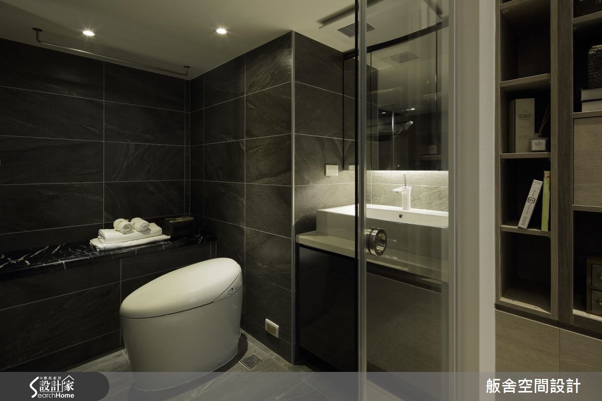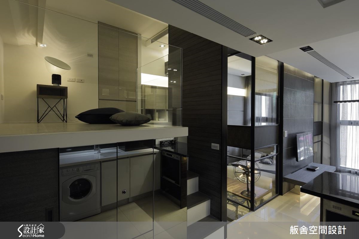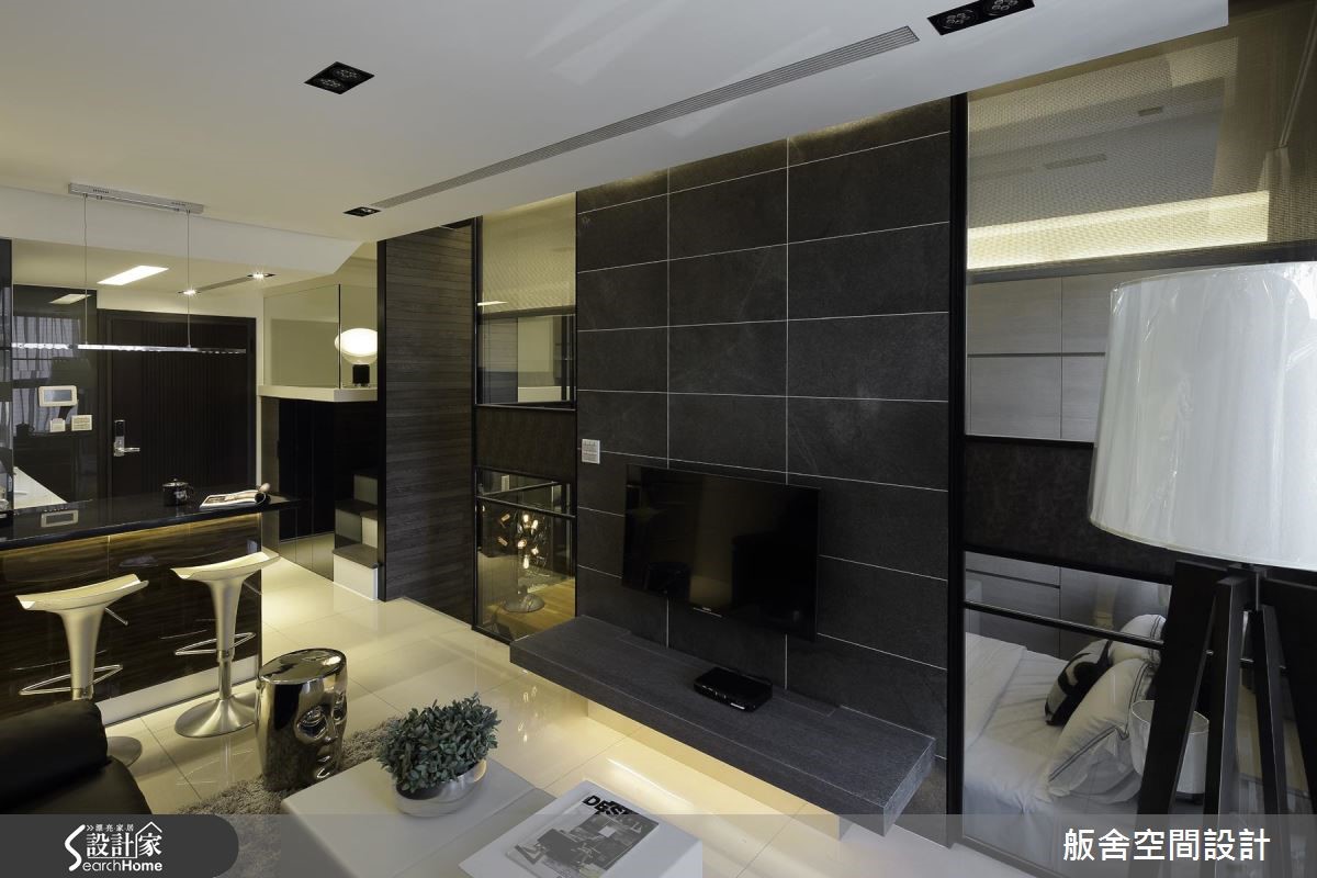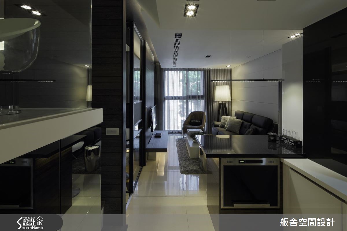 仅46平米、挑高4米的长型居宅,经由设计师巧思规划,利用深色材质凸显视觉深邃感,并借着材质差异界定各场域范围,创造小空间的趣味性,同时考虑到居者习惯,挹注多功能设施,围塑出专属夫妻两人的美好生活! 【利用地坪高低,创造丰富层次】设计师巧妙运用量体堆栈,创造领域范围的差异,或于客厅、主卧之间融入地坪高低差,创造动线丰富性,住宅中央则配置中岛吧台,作出长型场域的层次段落;在材质使用上,则型塑沉稳极简的现代低奢风格,利用深色镜面材质延展景深、创造深邃质地。客厅、主卧之间加入板岩砖结合清玻璃,无形中刻划通透的视线连接,并在卧房内配置书桌与书柜,整合睡眠、书房功能,替小空间创造更丰富的生活机能,在格局、材质与动线的完美演绎下,描绘出精品小豪宅的质感生活!