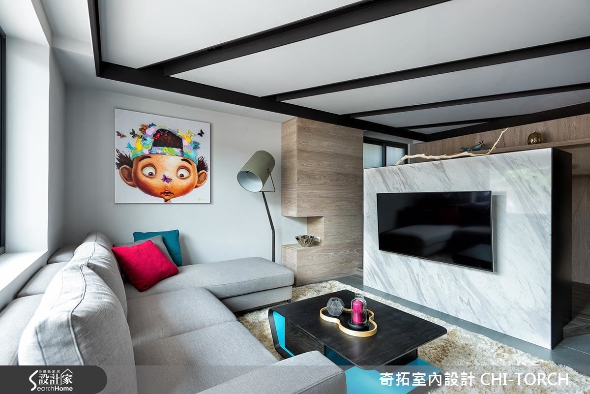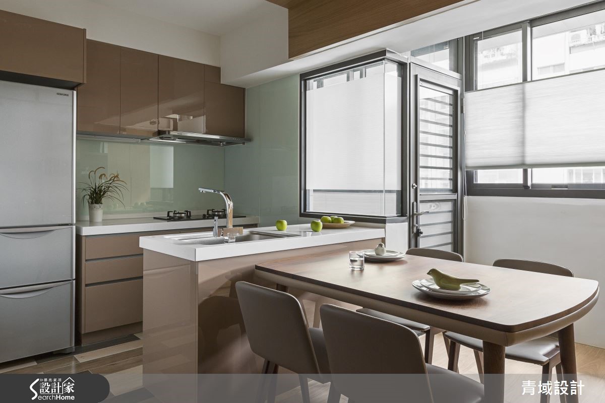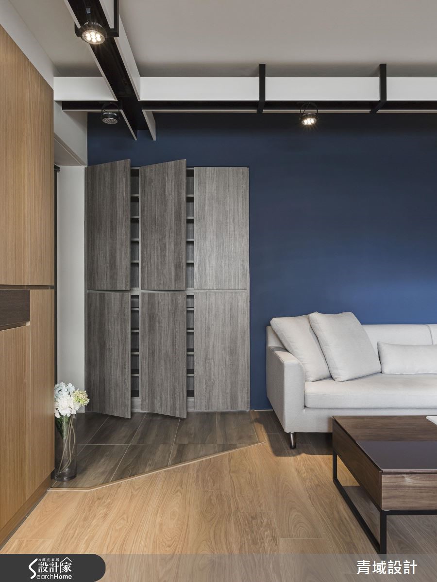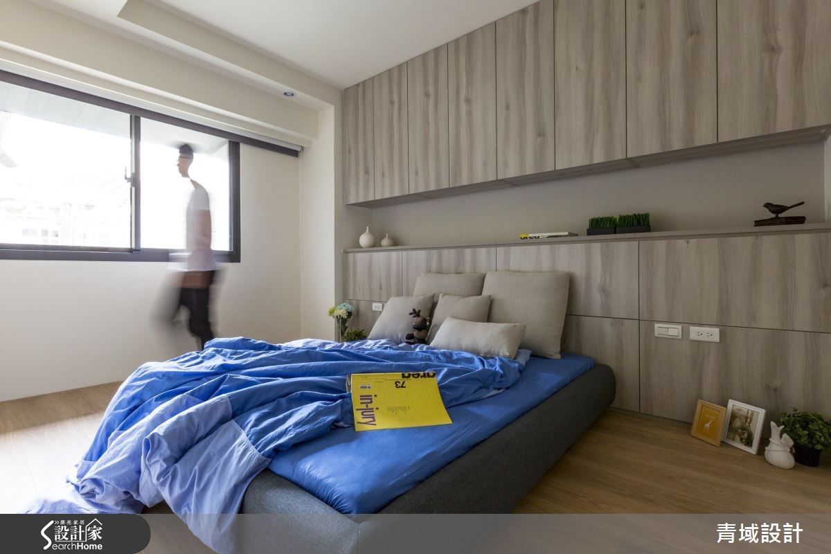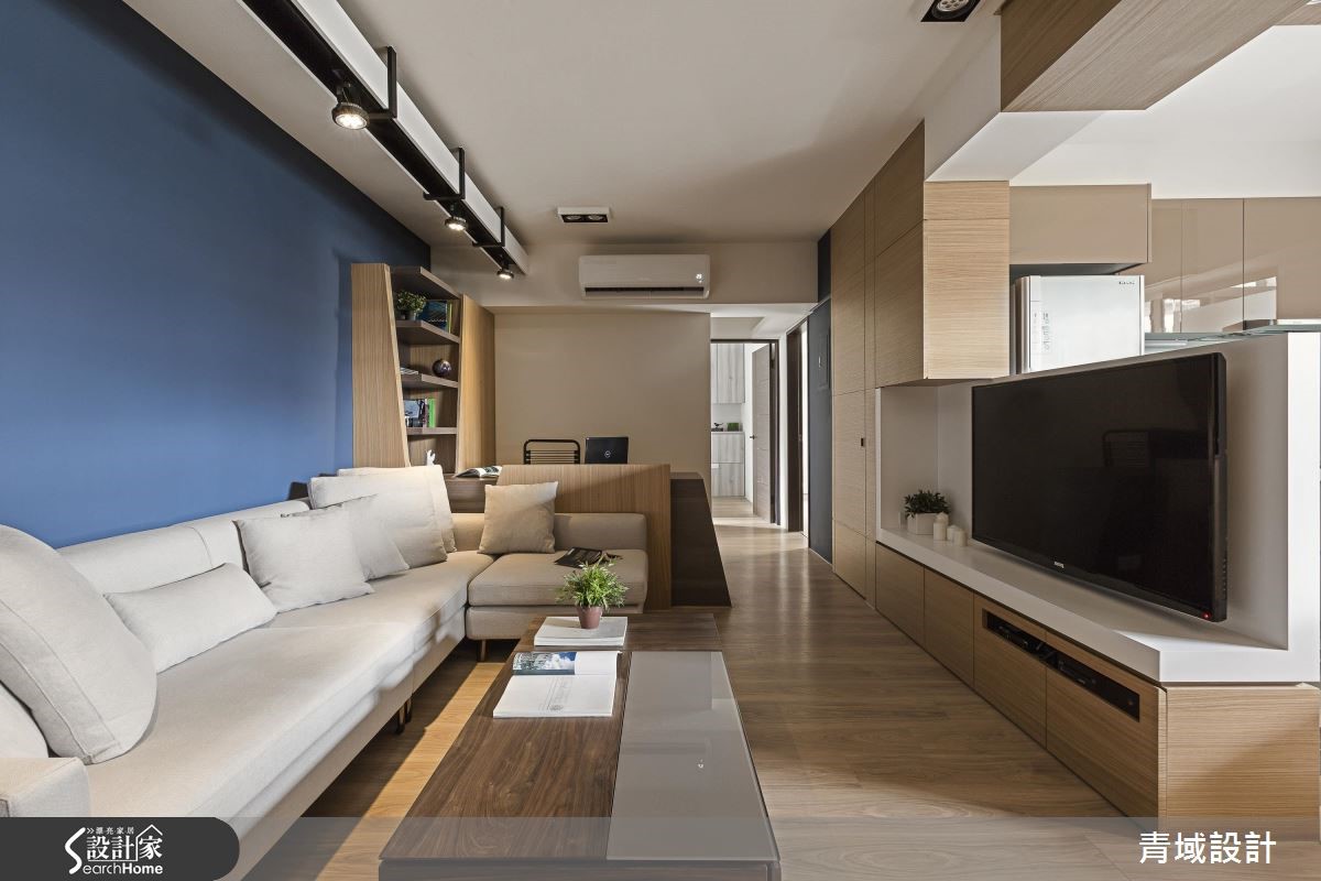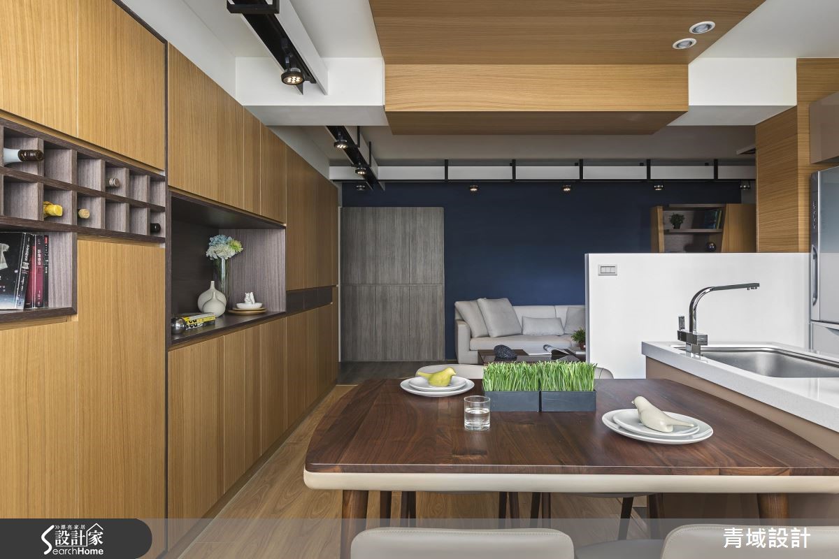 屋主因为工作关系,重新住进儿时的40年的老旧居宅,希望借助设计团队的专业,让只有单面采光的老屋重获新生,不仅完整规划采光、收纳与格局,更为未来的另一半预留贴心设计。【开放式设计,拉阔空间视野】设计师将原先3室改为2室,并以开放式公共空间规划,不仅打开视野,更打造流畅动线。玄关处设置悬柜以达到收纳与修饰柱体的功能,并利用量体结合轨道灯,成功达成视觉拉伸的效果。破除原先的封闭厨房、利用不做满的电视墙柜体取代隔断墙,将光线导引至客厅与书房区,并利用木皮包覆梁面,营造温润气息;设计师以一字型厨房搭配吧台连接餐桌,打造流畅烹饪动线,而针对收纳,则在餐桌旁设置大型收纳墙,满足生活收纳需求。