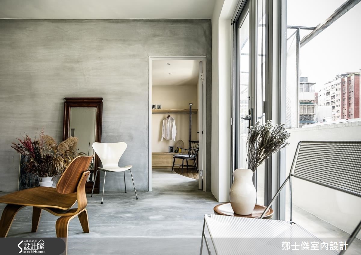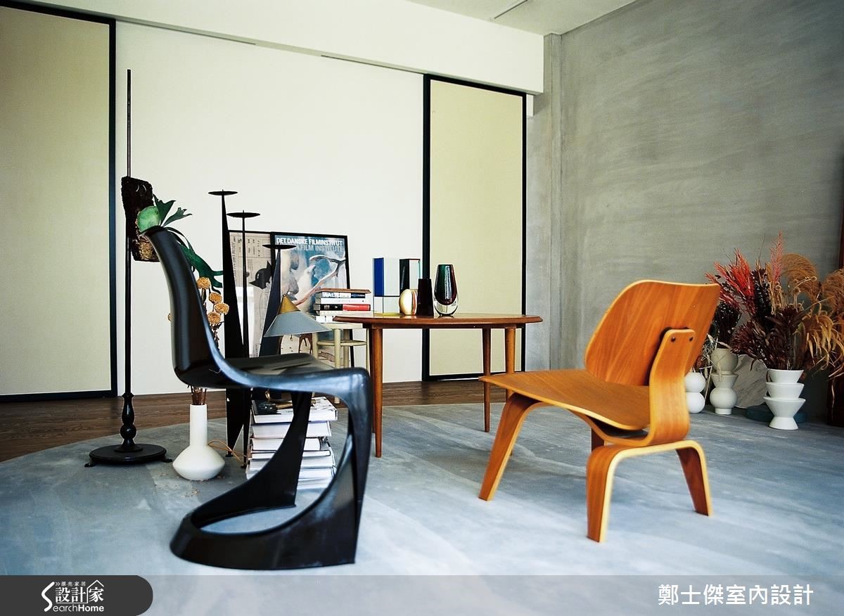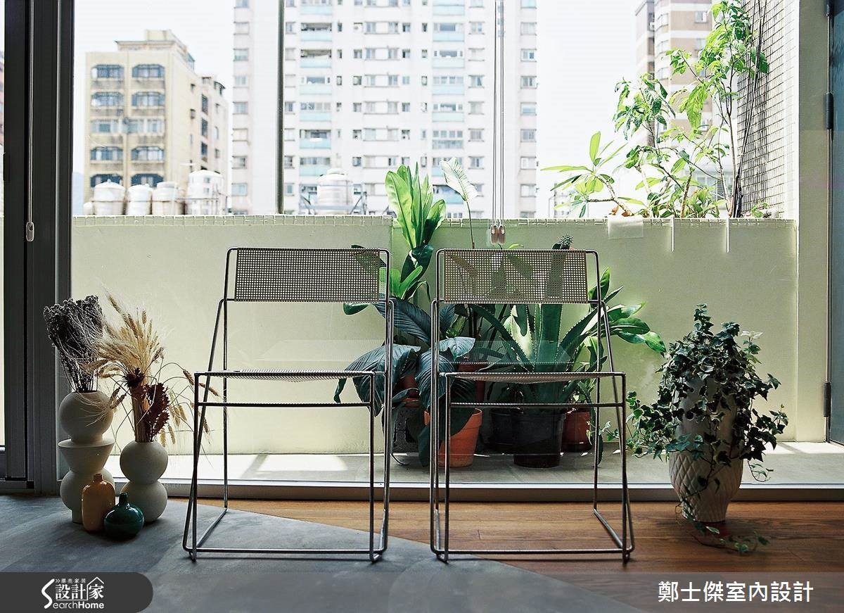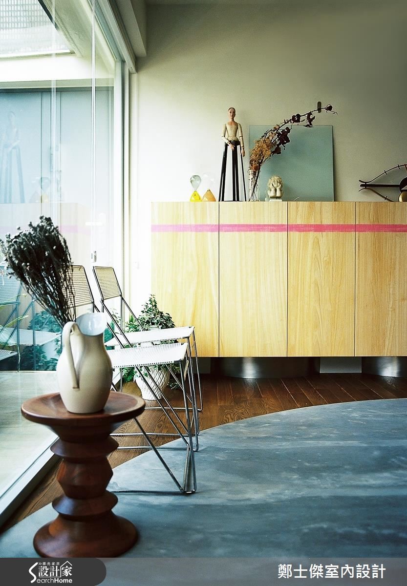 在有限预算之下,设计师重整83平方米的老屋,突破制式的居家格局规划,并以简约风格及绿色植栽加持,让空间显得生动而活泼,有如都会中的自然丛林,展现悠闲放松的氛围。【以风格家饰与陈设,增添好品味】空间藉由大面玻璃窗导入明亮采光,在窗前与厅区等处让单椅、书籍随兴陈设,化为空间的艺术装置,展现高雅品味。客厅地面以自平水泥结合木地板,划分出一个巨大的圆,无形中界定出不同区域。白墙拼接灰色水泥,搭配圆弧导角及门片整合,让流畅简洁的背景,作为造型花器、植栽家饰的陪衬。同时规划木作柜体,底部结合不锈钢半圆柱,表面一道粉色水平线聚焦视觉,成为空间中美好的亮点。开放式格局导引着自由动线,透过不同材质与拉门形式,让各区域的开口展现多层次的视觉。由于屋主喜爱园艺,设计师在前阳台保留一小块绿意园地,搭上自然光影的引入,使室内外视线得以串联,营造舒服自在的生活滋味。