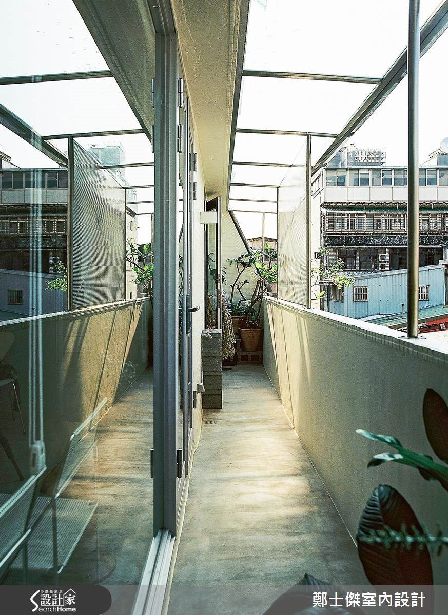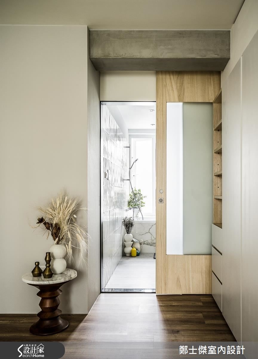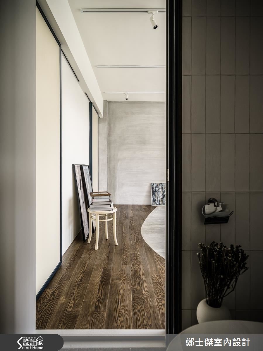 在有限预算之下,设计师重整83平方米的老屋,突破制式的居家格局规划,并以简约风格及绿色植栽加持,让空间显得生动而活泼,有如都会中的自然丛林,展现悠闲放松的氛围。【以风格家饰与陈设,增添好品味】空间藉由大面玻璃窗导入明亮采光,在窗前与厅区等处让单椅、书籍随兴陈设,化为空间的艺术装置,展现高雅品味。客厅地面以自平水泥结合木地板,划分出一个巨大的圆,无形中界定出不同区域。白墙拼接灰色水泥,搭配圆弧导角及门片整合,让流畅简洁的背景,作为造型花器、植栽家饰的陪衬。同时规划木作柜体,底部结合不锈钢半圆柱,表面一道粉色水平线聚焦视觉,成为空间中美好的亮点。开放式格局导引着自由动线,透过不同材质与拉门形式,让各区域的开口展现多层次的视觉。由于屋主喜爱园艺,设计师在前阳台保留一小块绿意园地,搭上自然光影的引入,使室内外视线得以串联,营造舒服自在的生活滋味。