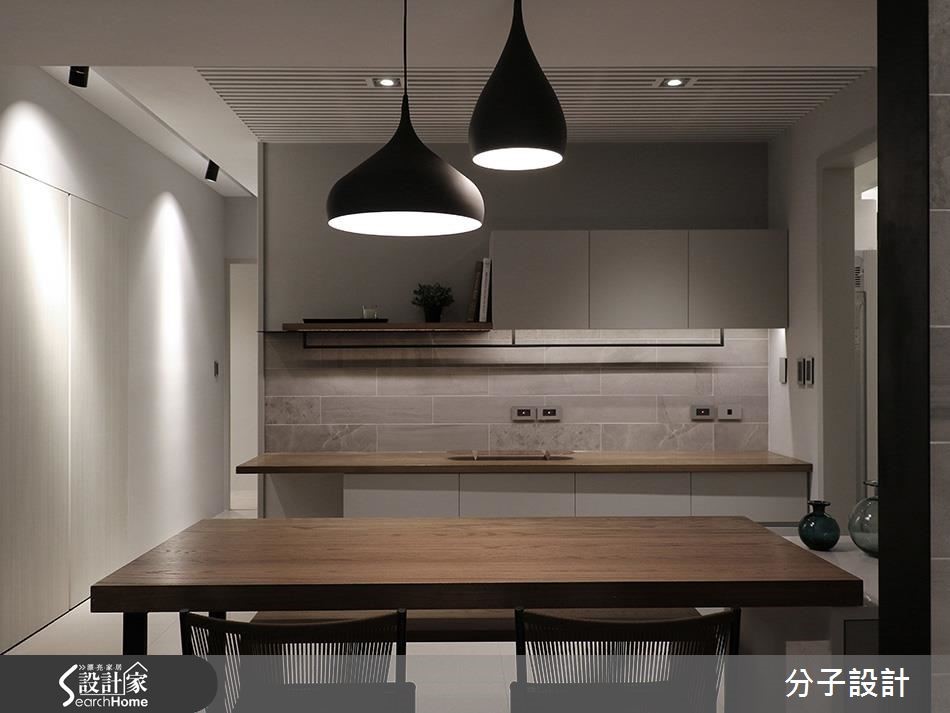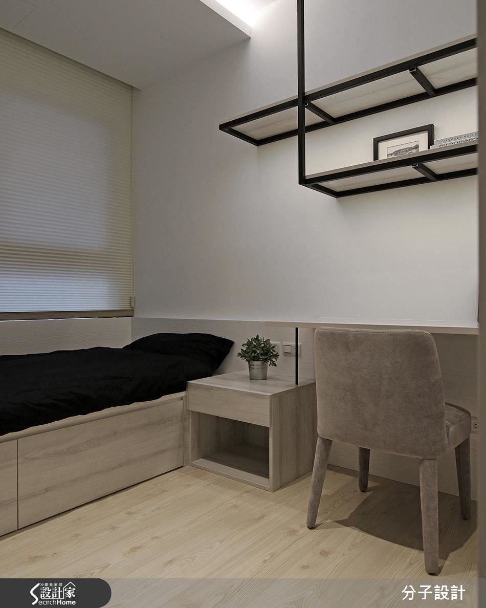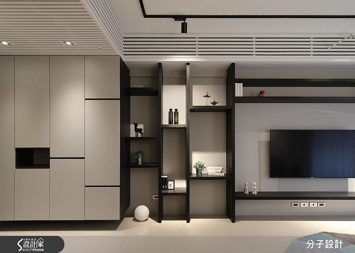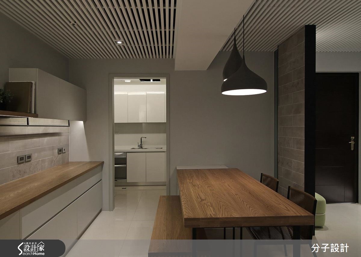 83平方米的居家空间,设计师选用黑、灰、白色搭配木质纹理,融入干净的线性切割,传递现代设计的率性精神,加上内敛的东方感格栅及些许工业风元素,成就高质量的居家面貌。【沉静色调,引领现代都会风尚】入口处,设计师规划大面积的开放展示墙,将玄关与客厅连成一气,创造视觉延伸效果、塑造大器场景,全室则挹注黑、白、灰等沉静色调,引领现代都会风尚,且在天花妆点线性格栅,以轨道灯提供照明,将多元风格融会贯通,凸显设计力道。餐厅以暖色调的木质餐桌、优雅的灯光投射,营造情境感十足的用餐氛围,而天花板则延续格栅语汇,使空间感添具层次及延展性,并在厨房餐柜处结合铁件、实木制成的开放层架,将块体与线条予以整合,深刻描绘机能的利落表现。【床底收纳,增加空间使用机能】居室使用统一用材与色调肌理,经由浅色木皮与木地板交融,彰显舒适气氛,墙面装置简约的木层板与铁件框架,不仅满足置物需求,更框出了立面的独特表情,而床底则装载收纳功能,使空间使用更具多元性!