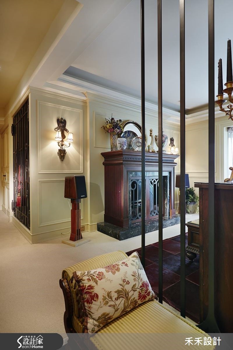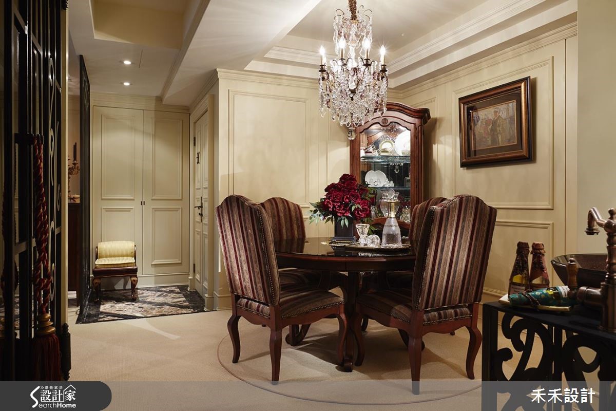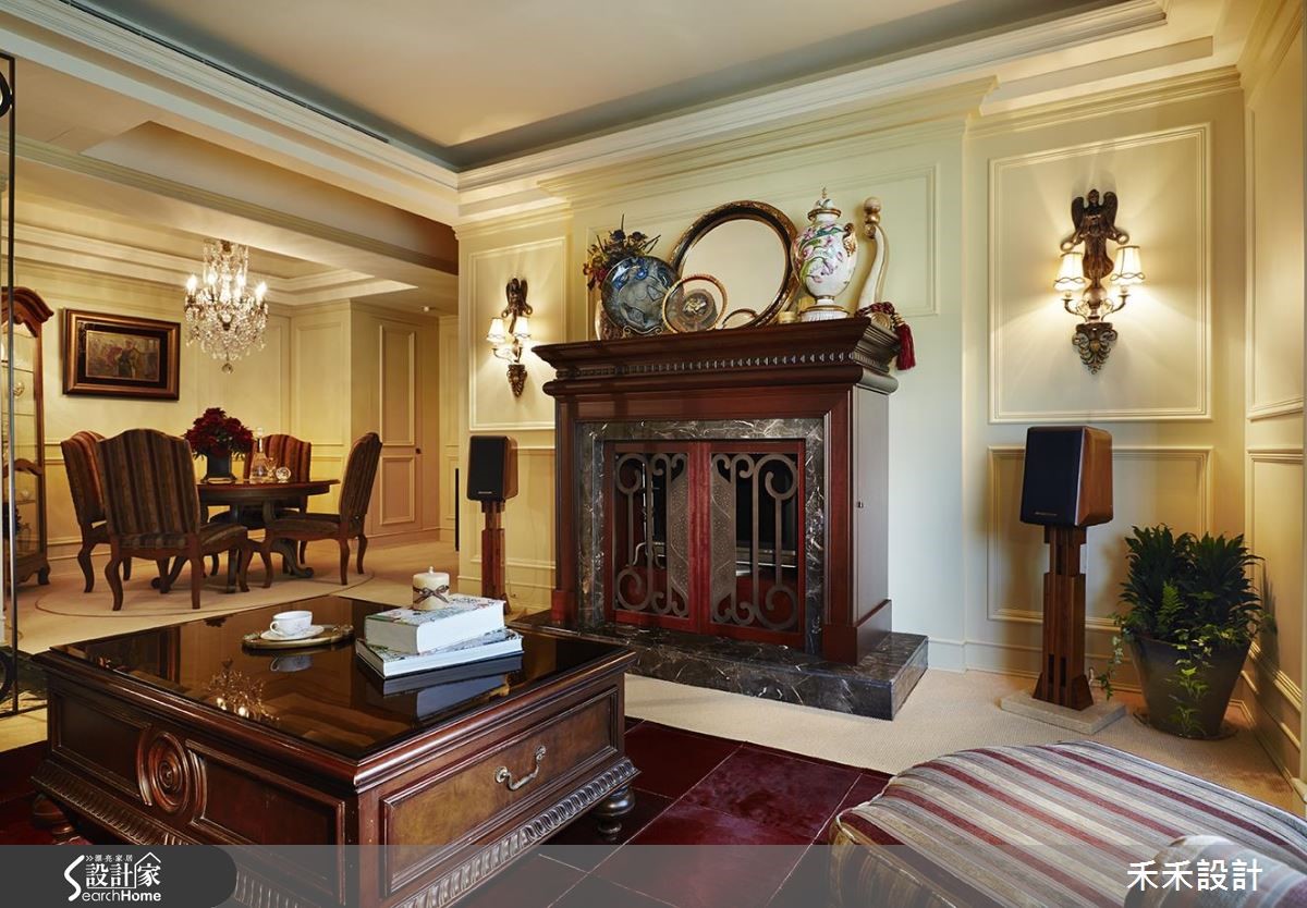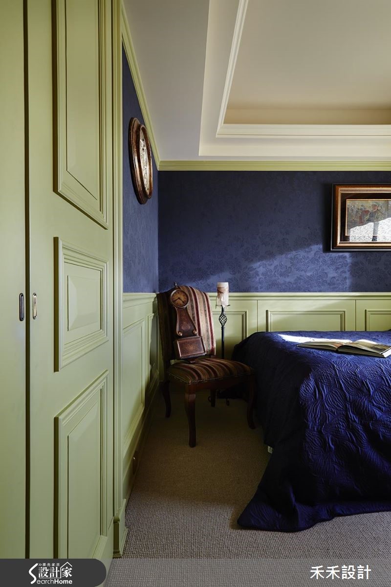经典的壁炉造型、古典绒布沙发,以及雕花细节,让人有种穿越时空来到欧洲的错觉。醇厚的色彩让空间更添一分稳重大器,搭配复古家具单品和裱框画作,将欧式古典风发挥得淋漓尽致。 【白色调背景,家具家饰做跳色】进入这间古典风大宅,玄关处以镂空雕花屏风划出场域分野,并保留了空间通透感。宽敞的公领域包含客厅与餐厅,藉由格局调度,区隔出彼此的独立性。墙面则利用大量线板勾勒欧式氛围,并延伸至收纳门片,呼应整体风格营造。走进私领域,设计师依据使用者的需求,注入不同的色彩元素和机能性,不论是经典的四柱大床,或是鲜艳湛蓝与温质湖绿的精采撞色,皆具古典风格的雍容风采。