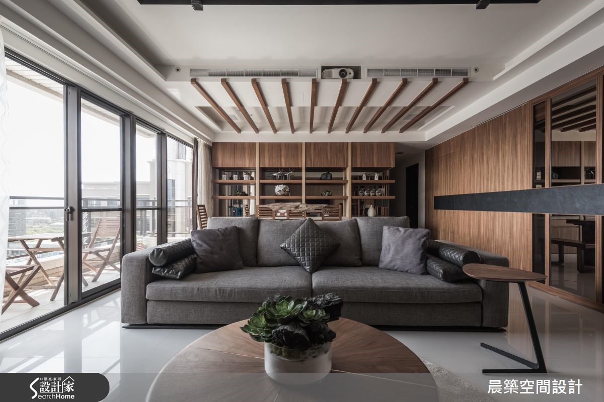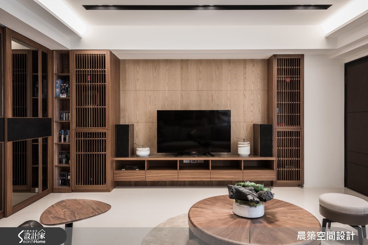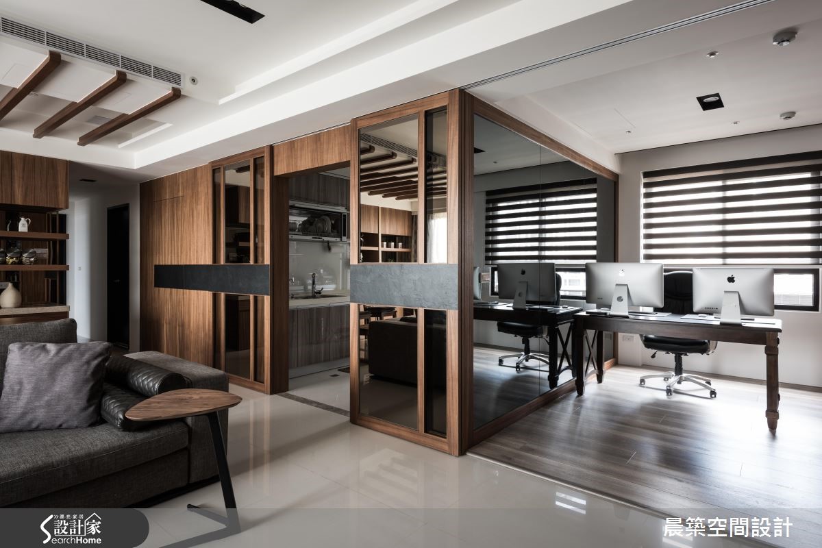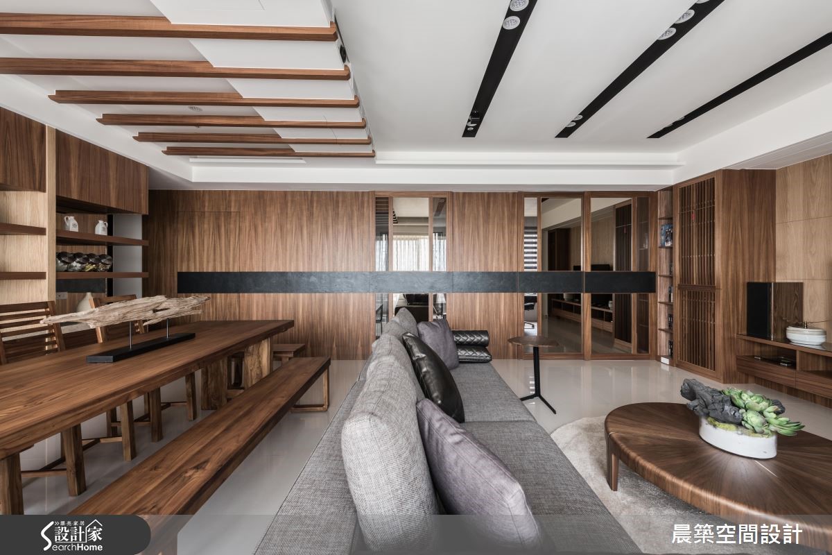 设计师善用新成屋的方正格局与优良采光,并贴合屋主对于实木的喜好巧妙运用格栅和鲜明木纹,将日式风格注入现代居家内,营造自然气息,打造简洁舒适的退休宅。【原木素材,营造宁静沉稳氛围】屋主为自己与家人购置新居,预备展开退休后的悠闲时光。由于屋主喜爱实木家具,因此设计师建议在居家空间大量使用木纹,营造自然的氛围。另外,针对屋主担心材质与色调的呈现不合期待,设计师更利用模拟图沟通,成功化解疑虑。公领域以走道为界,一边是需要独立空间的书房与厨房,一边是开放式客、餐厅。电视墙以格栅柜体与木皮组成,与实木家具及餐厅底部的大型收纳柜相呼应。书房天花以间距较宽的格栅修饰梁面,进一步划分开放空间,并在木质门片上加上镜面,让公领域更宽敞。