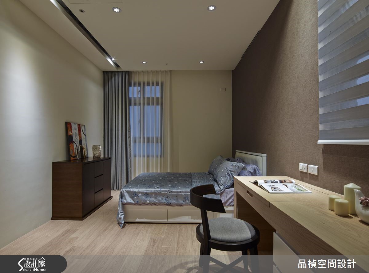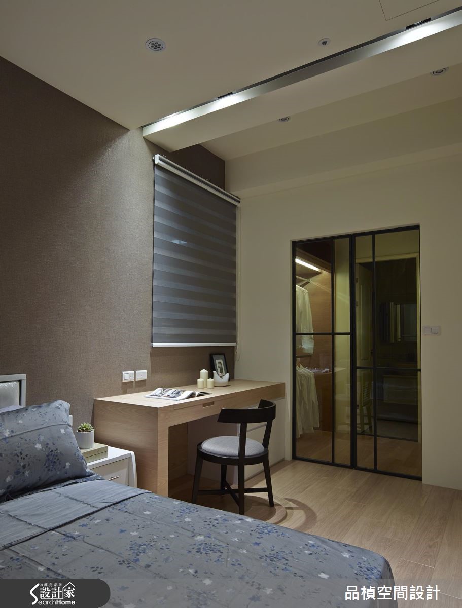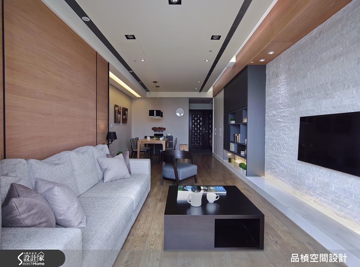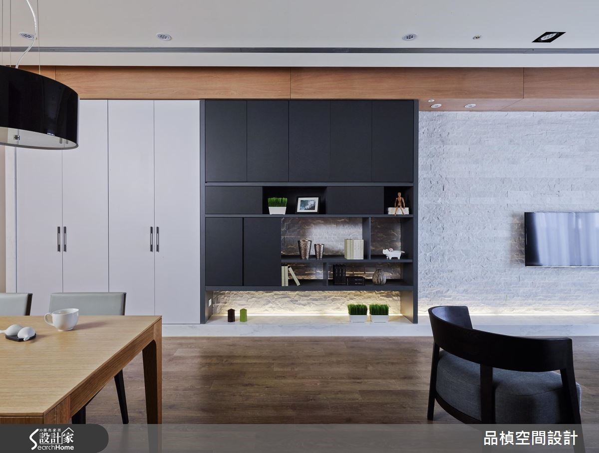99平米的休闲风居家,设计师引用材质特色穿针引线、带出悠闲感受,同时藉由长轴串联场域,并让柜体收整于立面,不仅提供收纳机能,更美化了居家表情! 【大量木质建材,创造温暖调性】走进大门,可见整面的灰镜铺设,兼具穿衣镜与延展视野效果,并规划不落地木作柜体,以绿意植栽凝聚焦点,替玄关创造好机能与视觉重心;进入公共空间,则透过地坪差异界定室内范围,在大面积木地板铺陈下,舒展休闲无压质感。电视墙上方施作延伸的木梁、串联整道立面,将客餐领域予以衔接,且采用石材、木质、铁件等多重媒材拼接组构,彰显墙面的丰富层次,中段穿插的收纳展示柜,则在黑色块面与绿意描绘下,成为独具特色的风景。【运用照明光线,营造柔和场域】沙发背墙选用木质建构而成,与深、浅灰的沙发交织成协调场景,营造放松宁静的生活景象;并于天花巧妙设计黑色灯带,利用线性拓展空间尺度;居室在床头铺叙质感壁纸,同时辅以间接光源规划,不仅网罗阅读、床头灯等基本照明所需,亦交织出柔和轻松的味道。