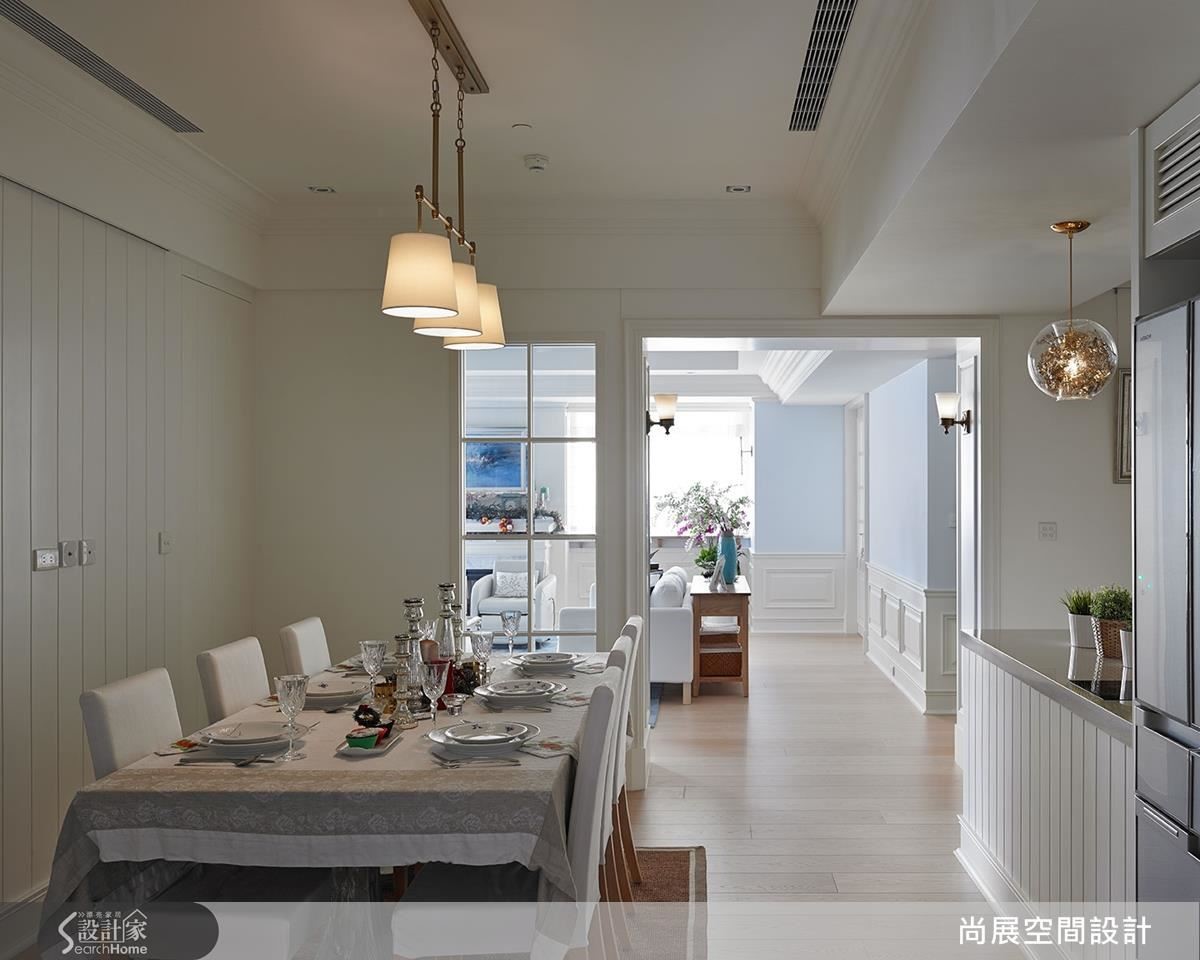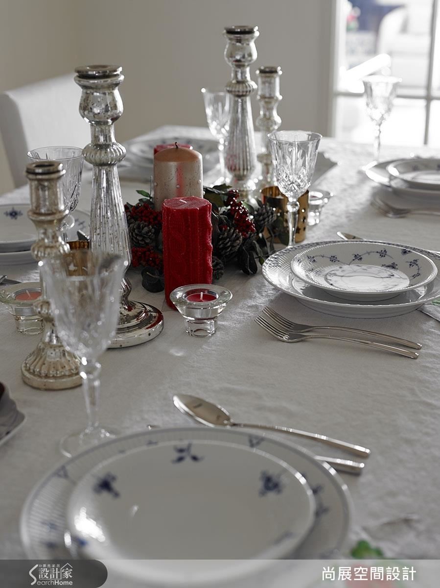 在延续汉普敦风格的美式空间中,以雪白线板的背景,配上白色的餐具与餐巾。同时不妨更换为金银两色的灯饰,透过灯饰的点缀,营造带有节庆感的高雅气氛,不论是圣诞或新年都适用。
