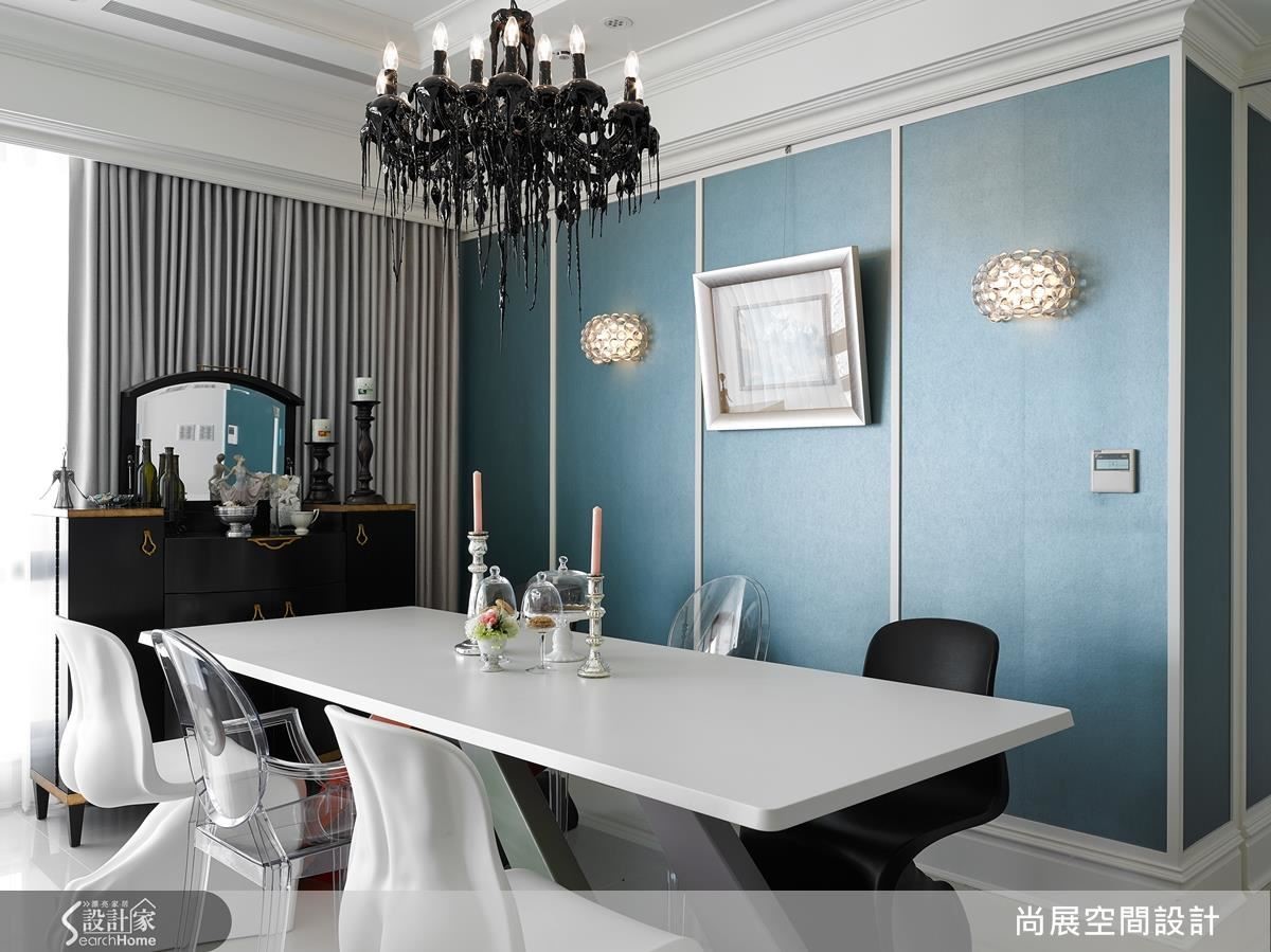 不想和朋友聚会,想享受夫妻两人时光,不妨改在餐桌上方悬吊黑色蜡烛灯,佐以墙面两盏壁灯,以光线达到酝酿氛围作用,打造双人晚餐浪漫情境。搭配马卡龙般的轻盈浅蓝墙面,使餐厅盈满缤纷趣味。