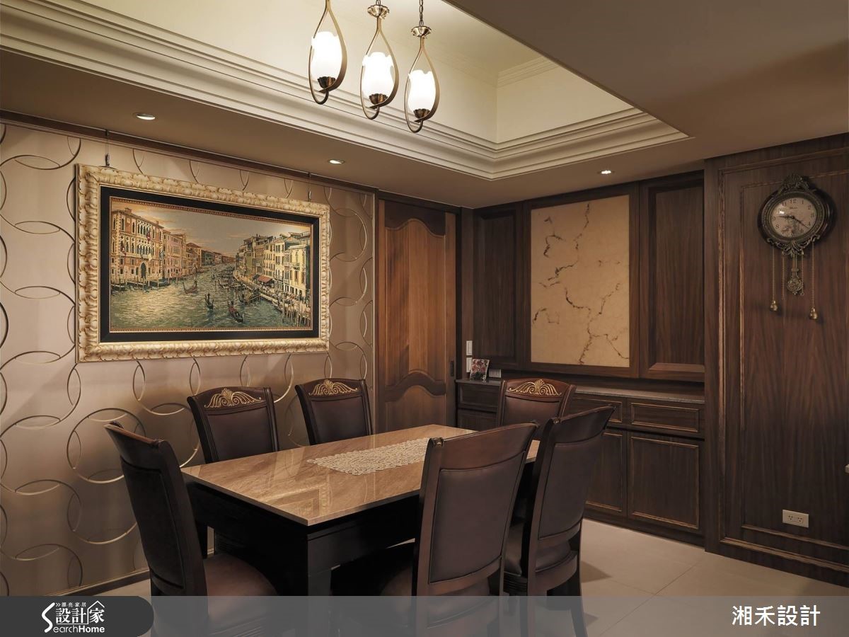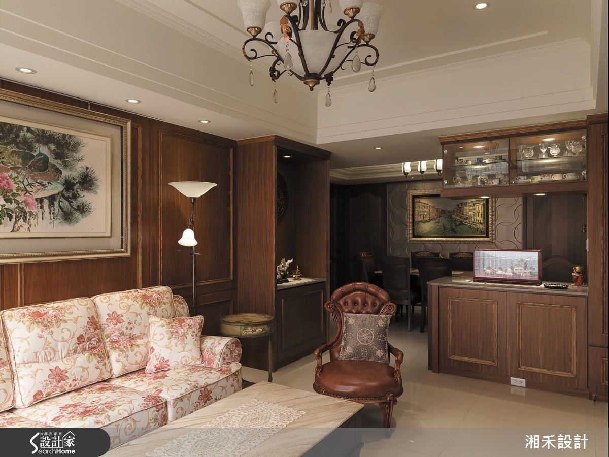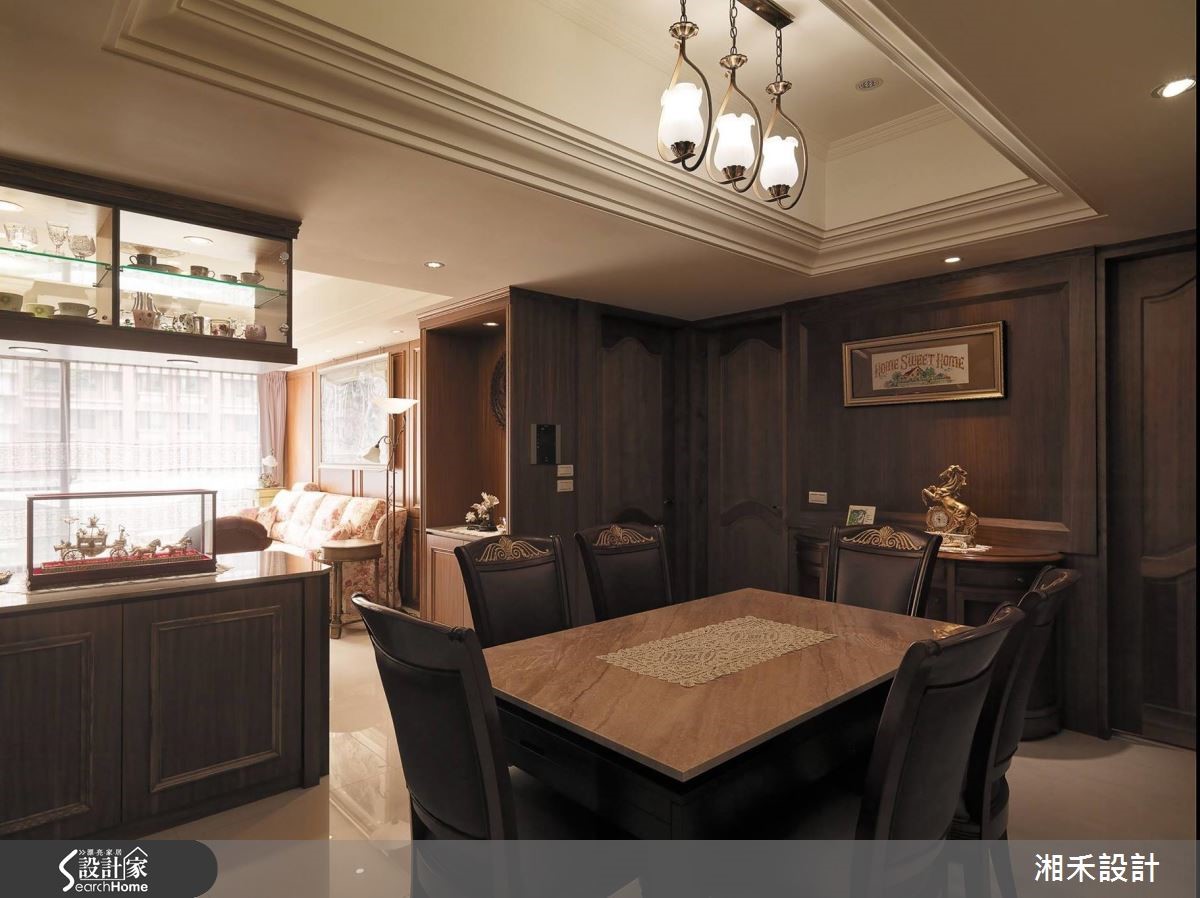 设计师在132平方米场域中,以复古的古典风格为主轴,同时将屋主母亲绘制的水墨画及家饰摆件融入其中,完美演绎中西合璧特色,打造出单身宅的新颖风貌。【融合中西元素,打造新颖古典风】空间依照屋高条件,因应梁体分布作出天花起伏,同时确切区隔各别场域,并赋予线板细致雕饰,营造美好的古典气韵,并注入大面积深木质色,映衬着碎花沙发的轻快质感,带出优雅平衡的生活品味。餐厅因玄关柜的透空柜体,援引客厅的明亮采光,周边环绕各种细致的材质搭配,创造细腻的墙面表情,而雾金色墙面更揉入中式铜钱的立体图纹,将中西元素融合得淋漓尽致;主卧在床头描绘细致的造型线板,一旁则规划整排延伸飘窗,替私领域添注更多元的使用机能。