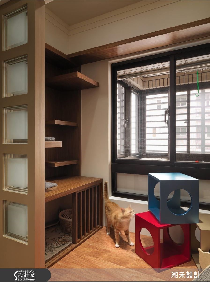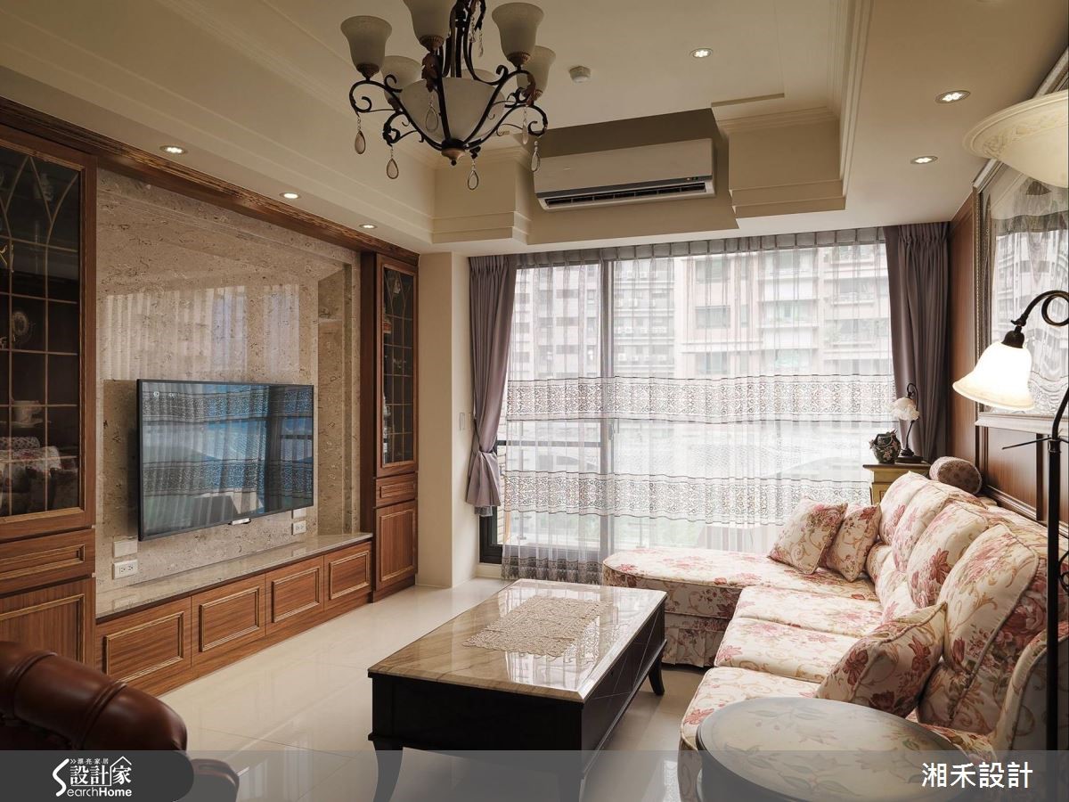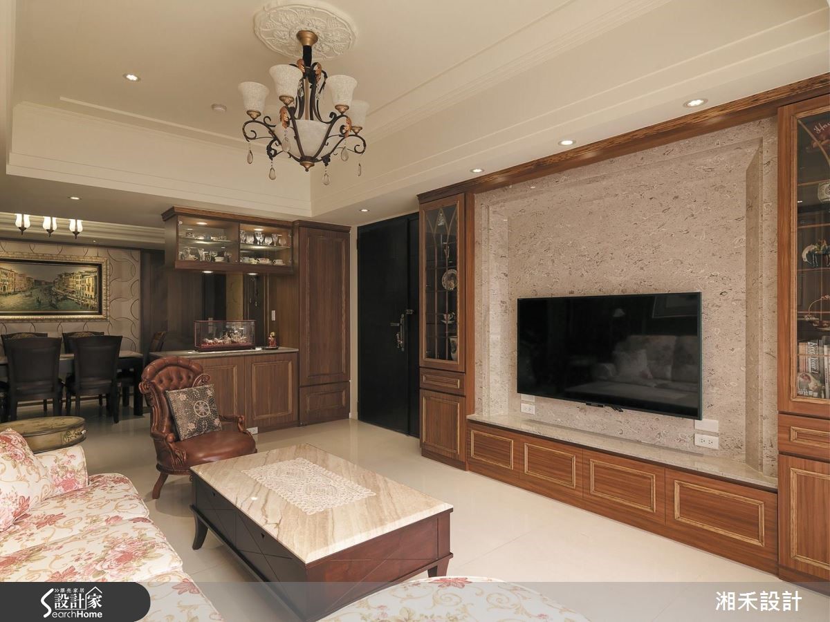 设计师在132平方米场域中,以复古的古典风格为主轴,同时将屋主母亲绘制的水墨画及家饰摆件融入其中,完美演绎中西合璧特色,打造出单身宅的新颖风貌。【融合中西元素,打造新颖古典风】空间依照屋高条件,因应梁体分布作出天花起伏,同时确切区隔各别场域,并赋予线板细致雕饰,营造美好的古典气韵,并注入大面积深木质色,映衬着碎花沙发的轻快质感,带出优雅平衡的生活品味。餐厅因玄关柜的透空柜体,援引客厅的明亮采光,周边环绕各种细致的材质搭配,创造细腻的墙面表情,而雾金色墙面更揉入中式铜钱的立体图纹,将中西元素融合得淋漓尽致;主卧在床头描绘细致的造型线板,一旁则规划整排延伸飘窗,替私领域添注更多元的使用机能。
