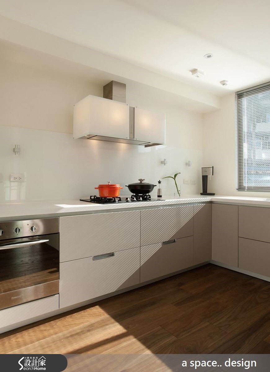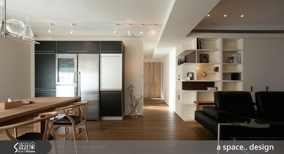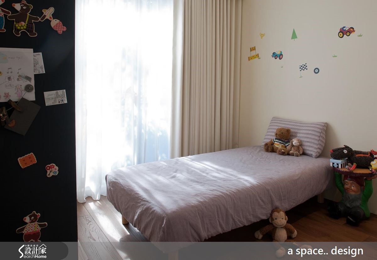 这是三代同堂的空间,为了让家人互动更为频繁,公共空间不做隔断,空间有效扩容,提供舒适环境。同时纳入充裕却不刺眼的采光、温润的大面积实木复合地板与木质家具,加上挑空天花,宛如走进日系muji宅。 【柜体局部跳色,提升视觉美感】设计师将199平方米居宅的公领域放大,利用开放空间设计流畅宽敞的动线,成为三代5口的欢聚中心。并因应当地的潮湿气候,铺设带有温暖质感的实木复合地板,提高公共空间的温润度。沙发背墙延伸至走道转角设计为开放收纳柜,更成为另类的居家端景,兼具实用与美观机能。将部分厨房机能纳入开放用餐空间,并装设轨道照明,成为功能性划分。由于空间足够,独立厨房内设计L型厨具,并在抽油烟机加入间接照明,为烹饪时光创造时尚气息。主卧以透明家具搭配纯白色调,提亮空间。孩子的房间则增添了黑板墙设计,成为自由挥洒的所在。