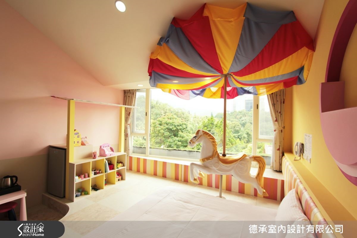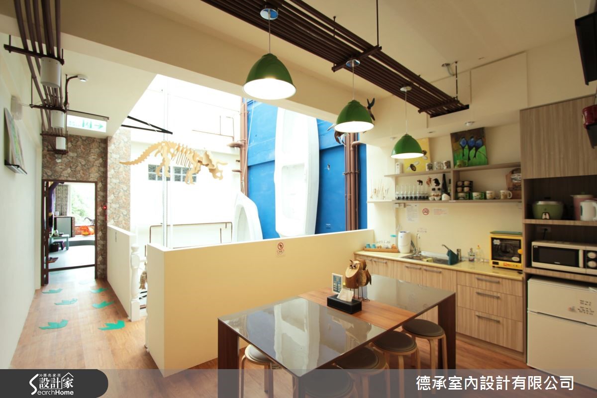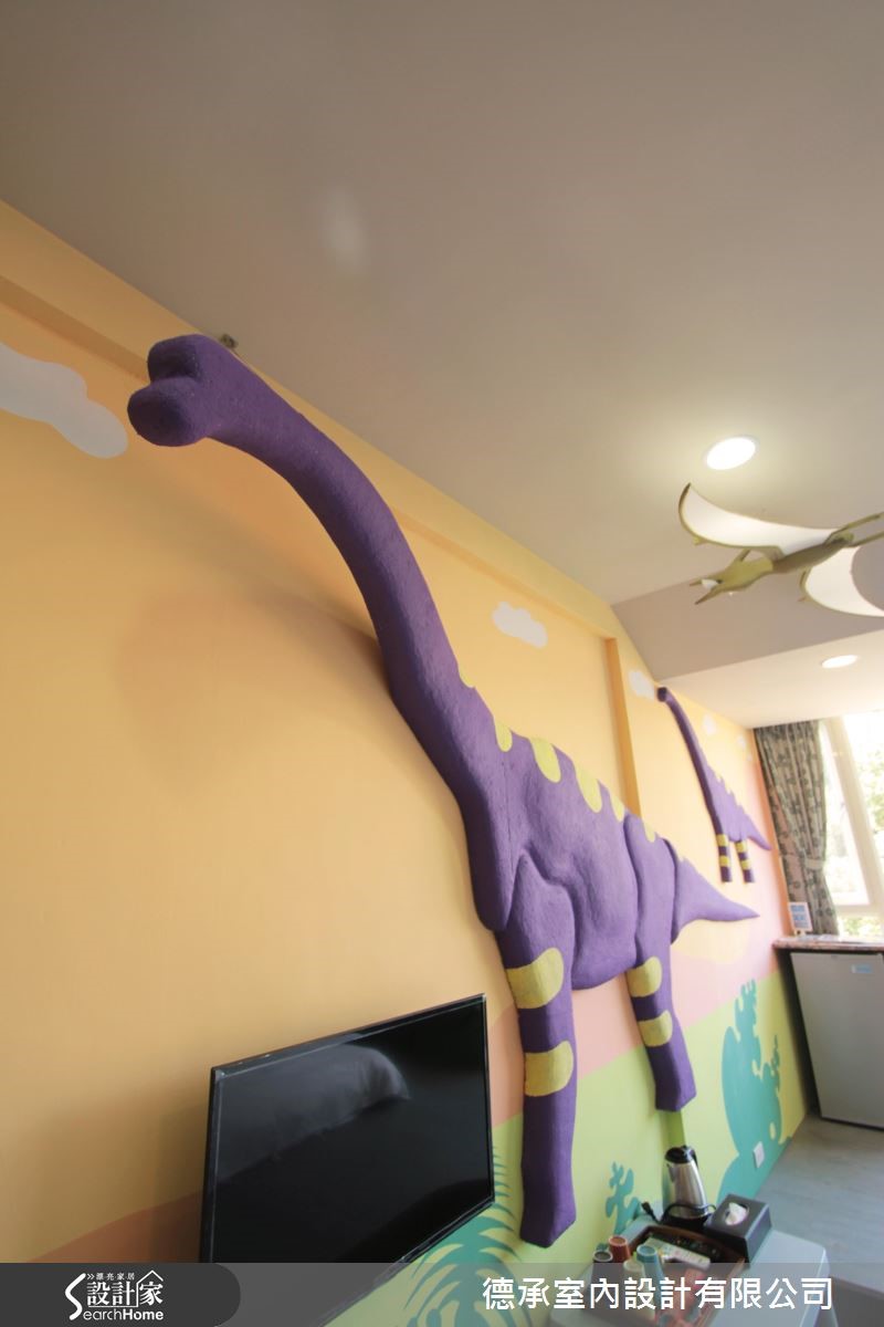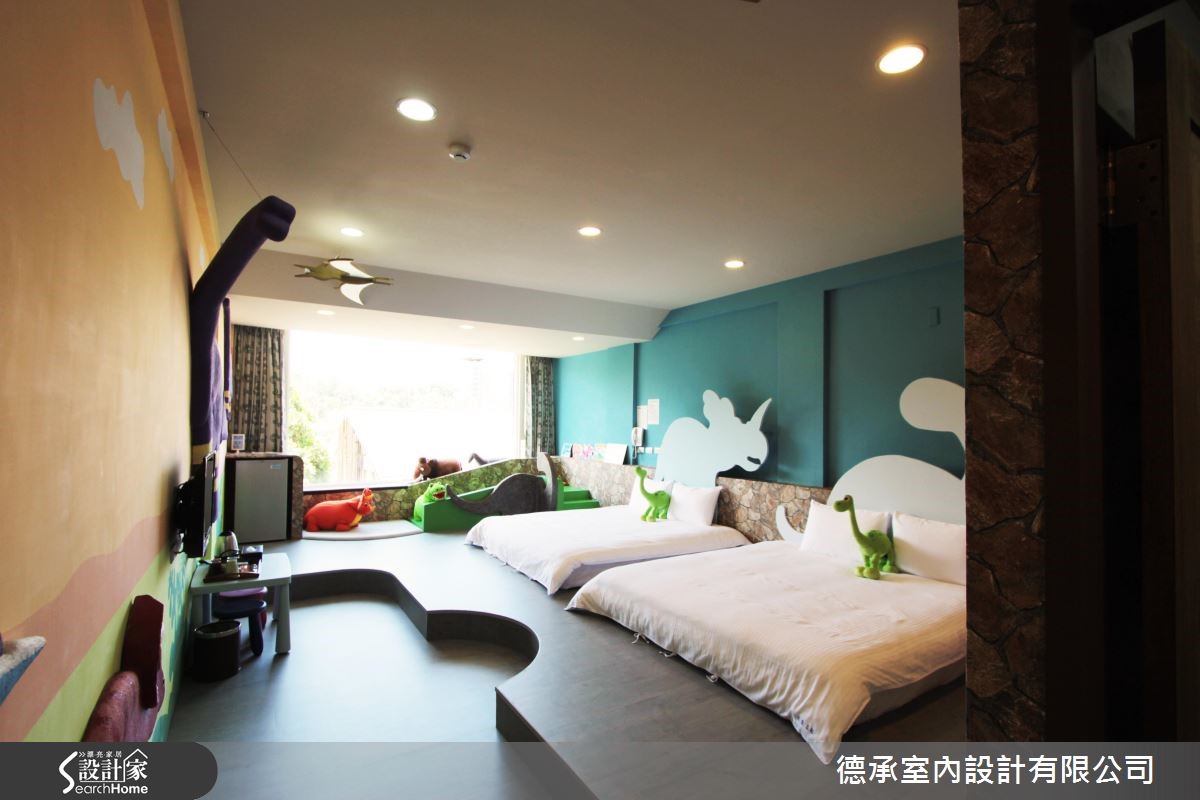 设计师为民宿主人延伸不同的主题空间,把侏㑩纪大恐龙、摩天轮、旋转木马,还有船长的大船舱全都放进房间里,以不同的主题打造住宿空间,让来到这个亲子主题民宿的大人、小孩,一打开门就惊喜!【童趣主题设计,打造欢乐氛围】设计师以恐龙、游乐园、渔夫、森林等四个主题,为空间赋予精彩故事。沿着廊道的脚印,来到有许多恐龙的宽敞大房间,以水蓝色衬托清爽的空间质感,而立体的浮雕设计让恐龙还能向门口探头,热情迎接来访的旅客。游乐园主题房特别在房内装设孩旋转木马和可乘坐的摩天轮,活泼缤纷的糖果色调,勾起大、小孩的甜蜜童年回忆。而森林及渔夫房也十分特别,以温暖木色调及特色家饰布置,分别表现出蓊郁大树和满载渔获的渔人印象,让住宿经验充满乐趣。
