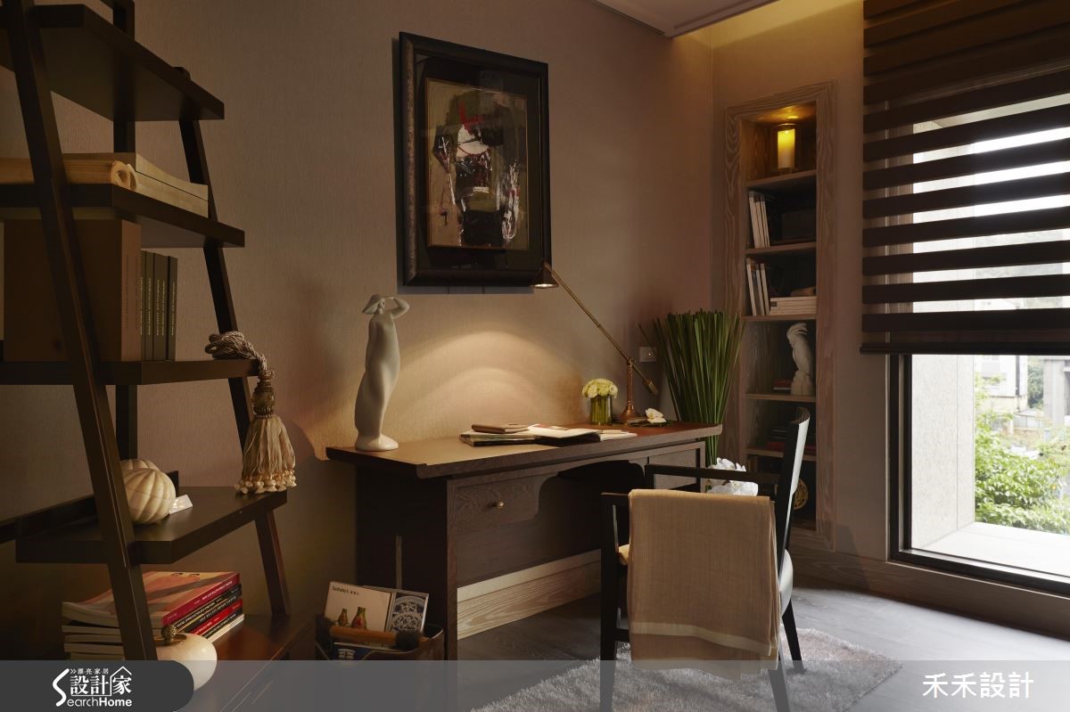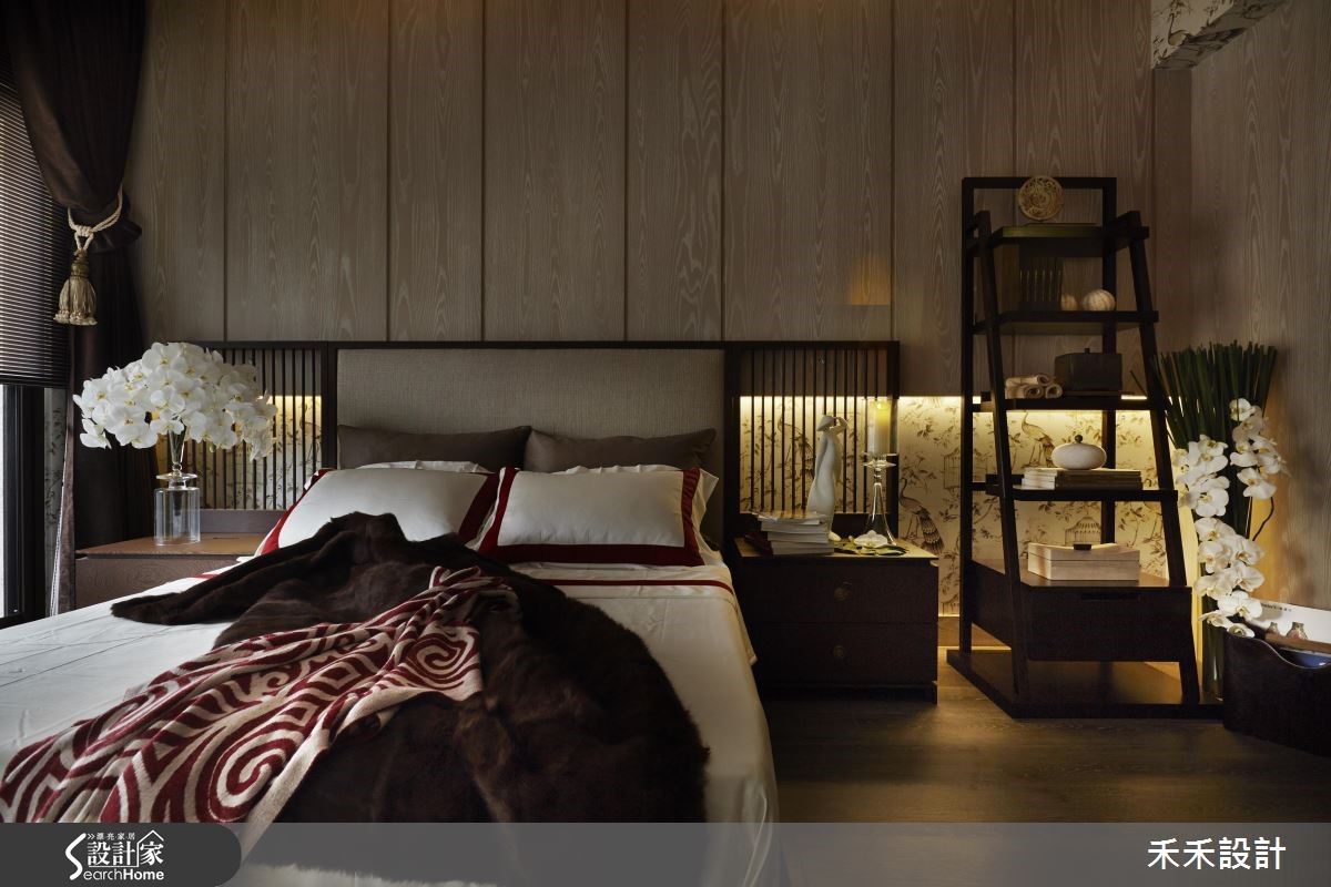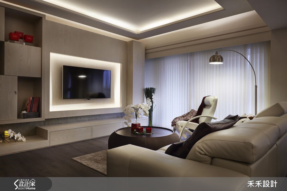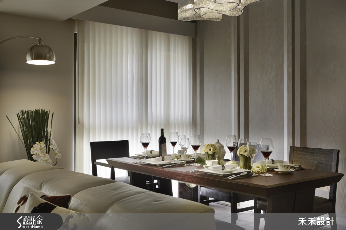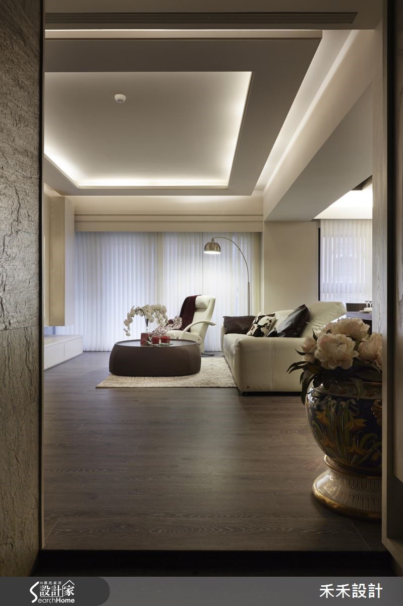165平方米的居家降低色彩彩度,让温润大地色系漫溢在日常生活中,简洁的柜体线条让视觉清爽,再以低调温雅的灯光点缀,呈现简约而迷人的优雅内蕴,让人一回家就能感到沉静放松。【柔和灯光,丰富居家光影】从玄关走进公领域,设计师让地坪稍微向上抬升,划分出明确的空间领域。客厅与用餐区采用开放式设计,并选用实木复合地板作为空间基调,展现木色调的温润特质;并配上米白色沙发,同色系的搭配营造出和谐视觉。客厅天花与电视墙处嵌入间接照明,透过柔美的光影,柔化方正柜体线条,更添一分舒适质感。后方的餐厅则以吊灯凝聚视觉,简约木质框设为整个公领域带来落落大方的气场。卧室的设计格外别致,除了延续沉稳木质,更融入花草、格栅等元素,营造典雅细致的环境。