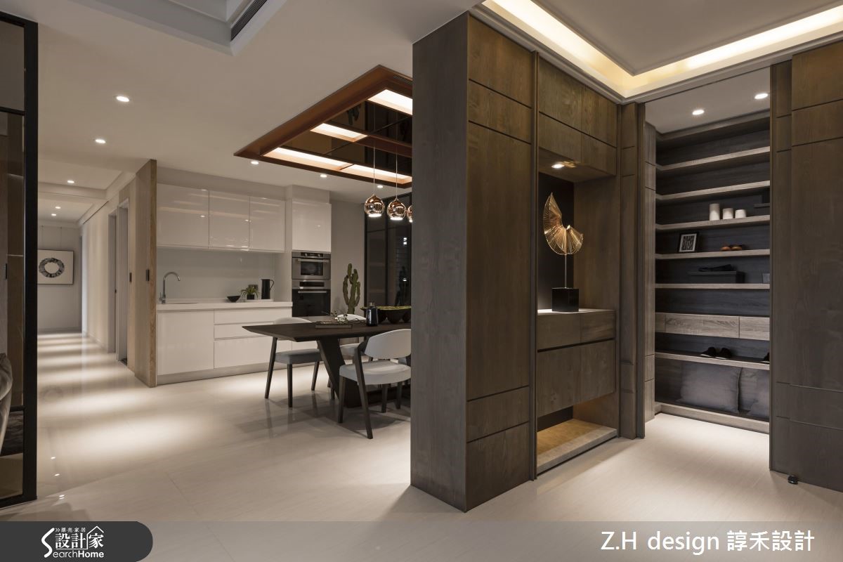 235平方米的居宅要容纳一家6口所有的生活起居与收纳,设计团队藉由重新整合动线,并利用建材串连公共空间,达成宽敞通透的居家动线。【镜面隔断,打造延伸视觉感】玄关以L型柜体设计,除了为餐厨空间带来隐私,更提供充足的衣帽收纳机能。进入公领域,主墙以无接缝处理的大理石显现低调奢华的气息,搭配下方的薄板岩创造有层次的视觉意象,而由电视墙下方延伸至窗边的L型架高柜体则兼具飘窗功能,衬托美好的水岸窗景。客厅后方规划为多功能书房,利用铁件与玻璃塑造隐私与开放兼具的空间;一旁的餐厅则采用琥珀镜与红铜漆修饰天花,营造高贵的用餐氛围。而私领域部分依照居住者,分别给予不同风格的壁纸与柜门造型,并设置专属收纳机能,满足全家人的生活所需。
